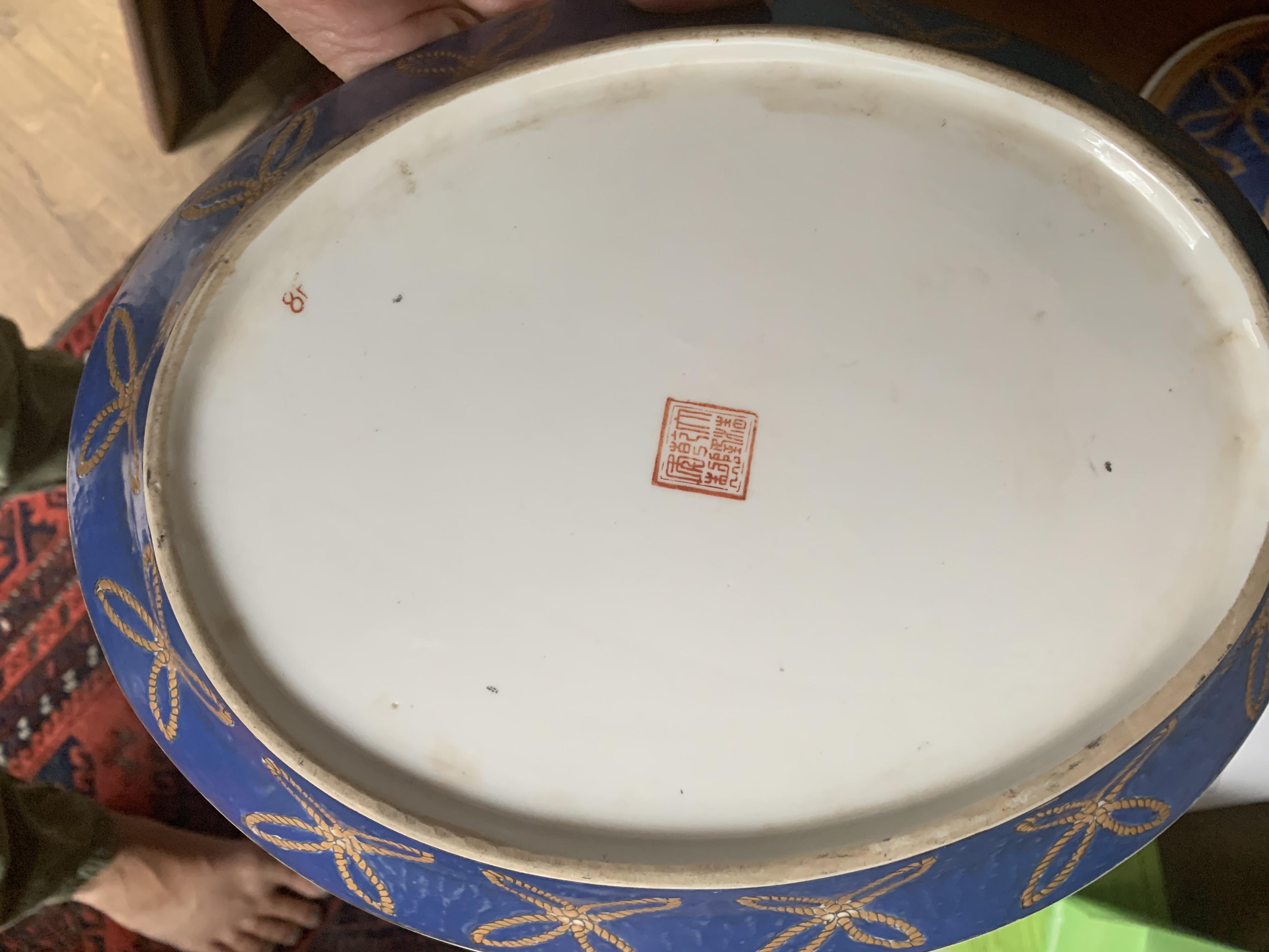 Antique nautical chinese porcelain serving dish. Beautifully made, blue with gold and mustard colored rope trim. Painted ship on the side. In excellent vintage condition. This is a truly unique piece with so much character! The inside of the serving dish and lid have some patina which can be seen in the photos.