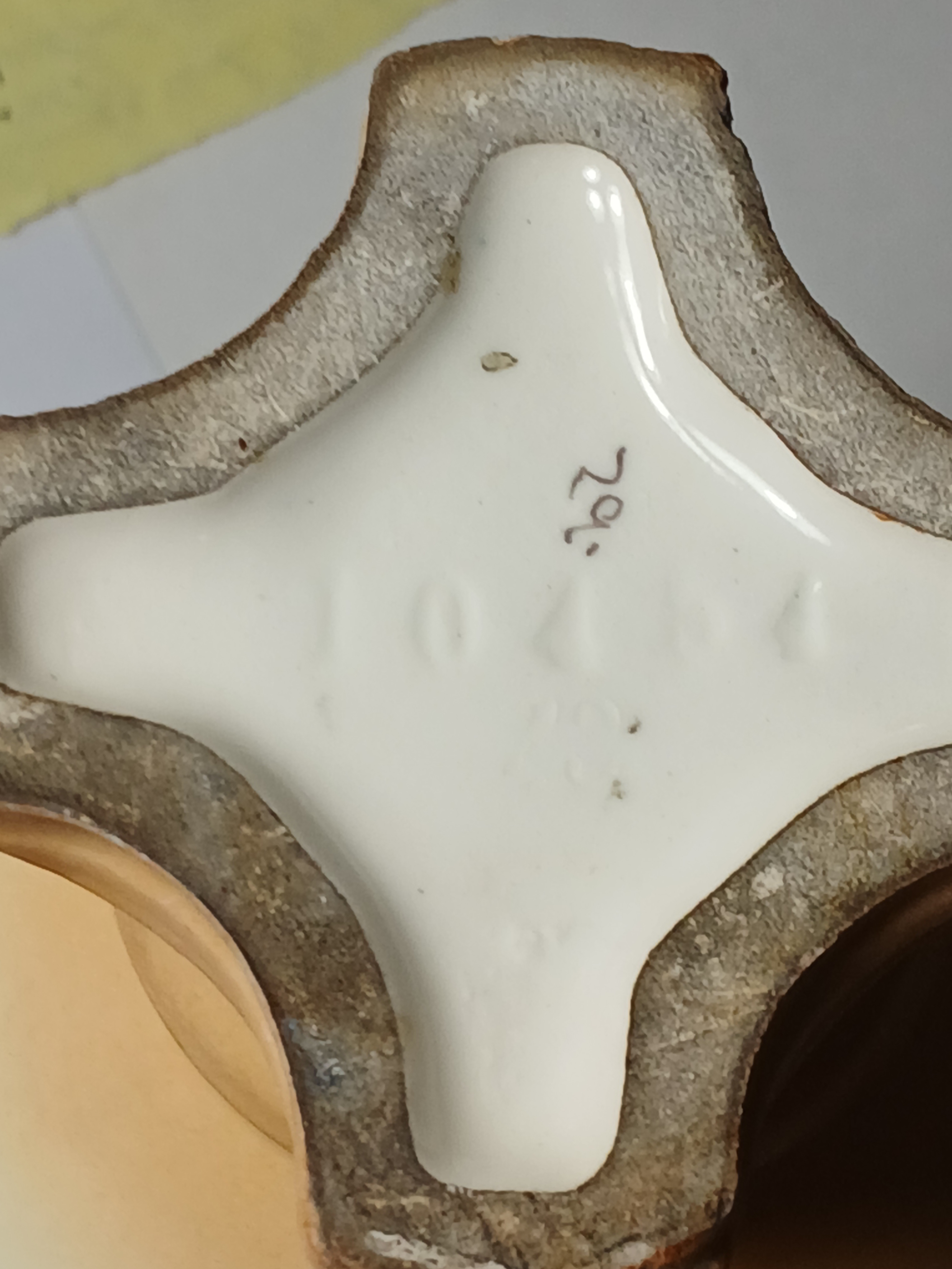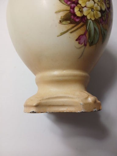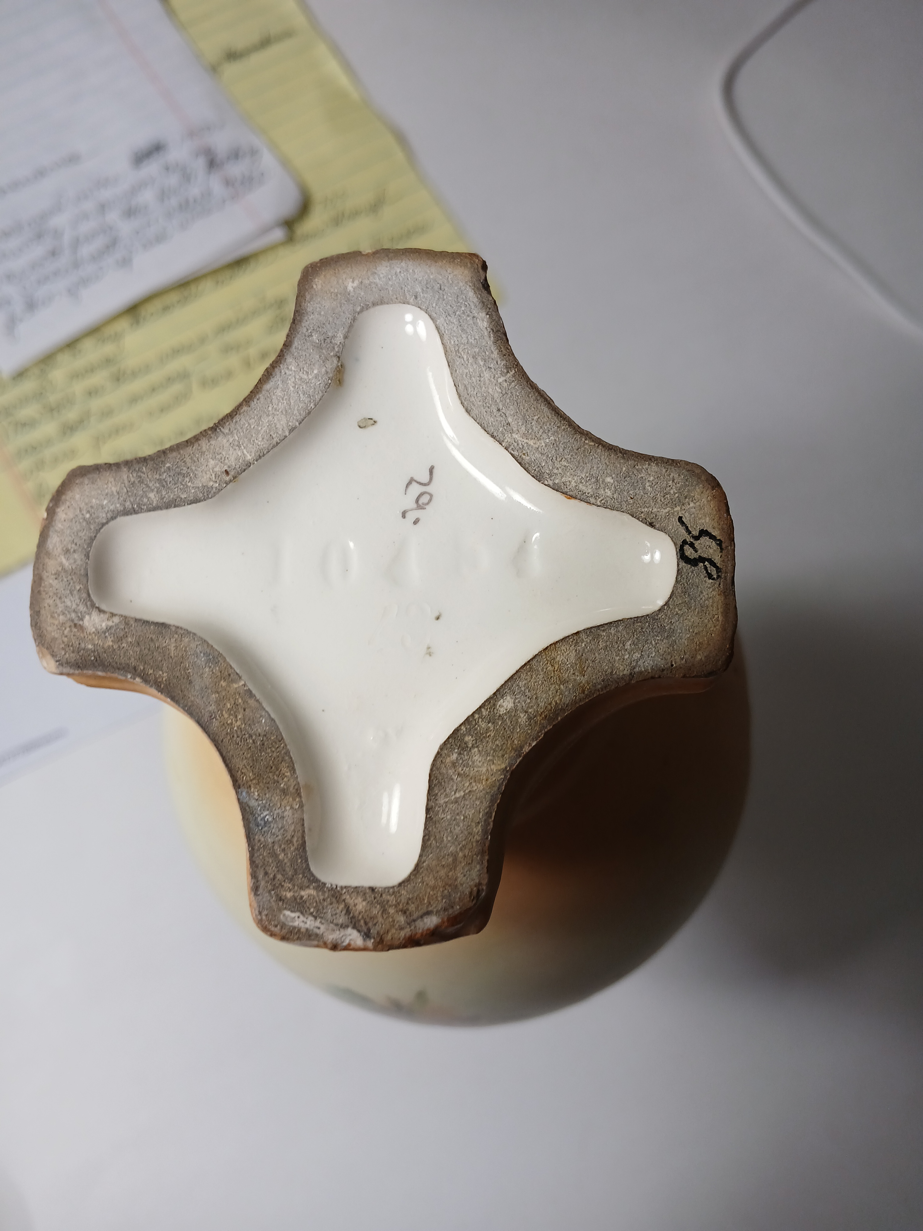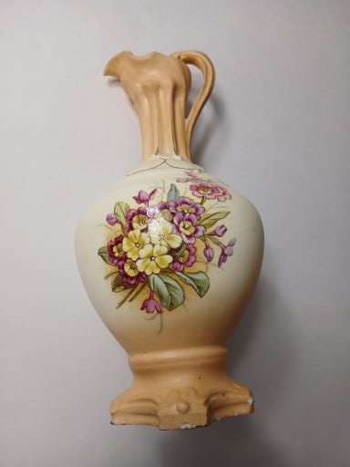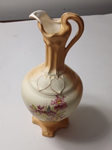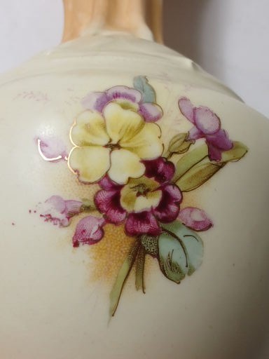 Description Antique Hand painted porcelain pitcher. Han painted purple and yellow flowers. Mark on the bottom is difficult to read. The first 3 numbers are 104 but last 2 are not clear. 9.5 inches tall and weighs 11 oz.