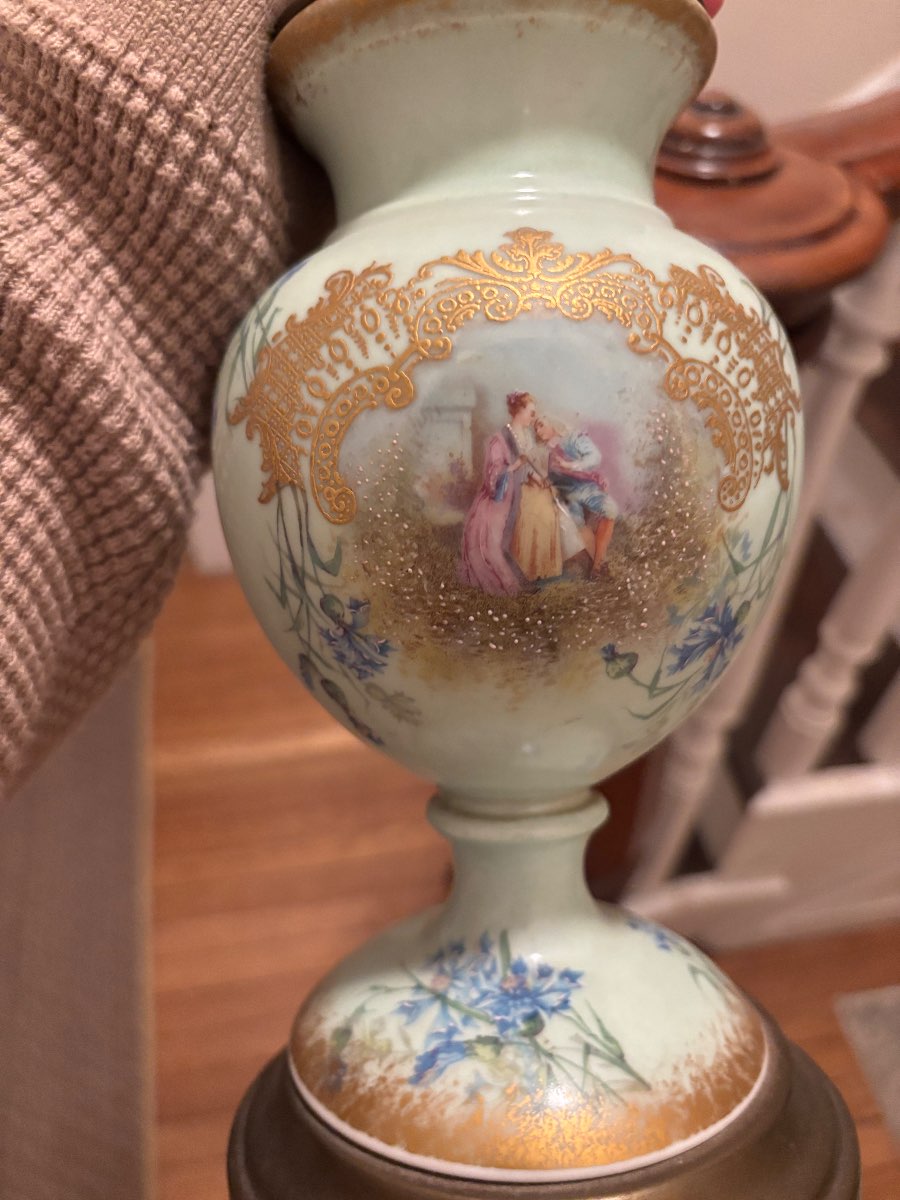 Physical Description: This elegant table lamp features a porcelain base with a delicate hand-painted design. The lamp stands approximately 24 inches tall, including the brass socket and shade holder. The base has a soft green glaze with intricate gold detailing and floral motifs, including blue flowers and a romantic scene depicted in the center. The lamp is mounted on a circular brass base, which adds stability and a classic touch.