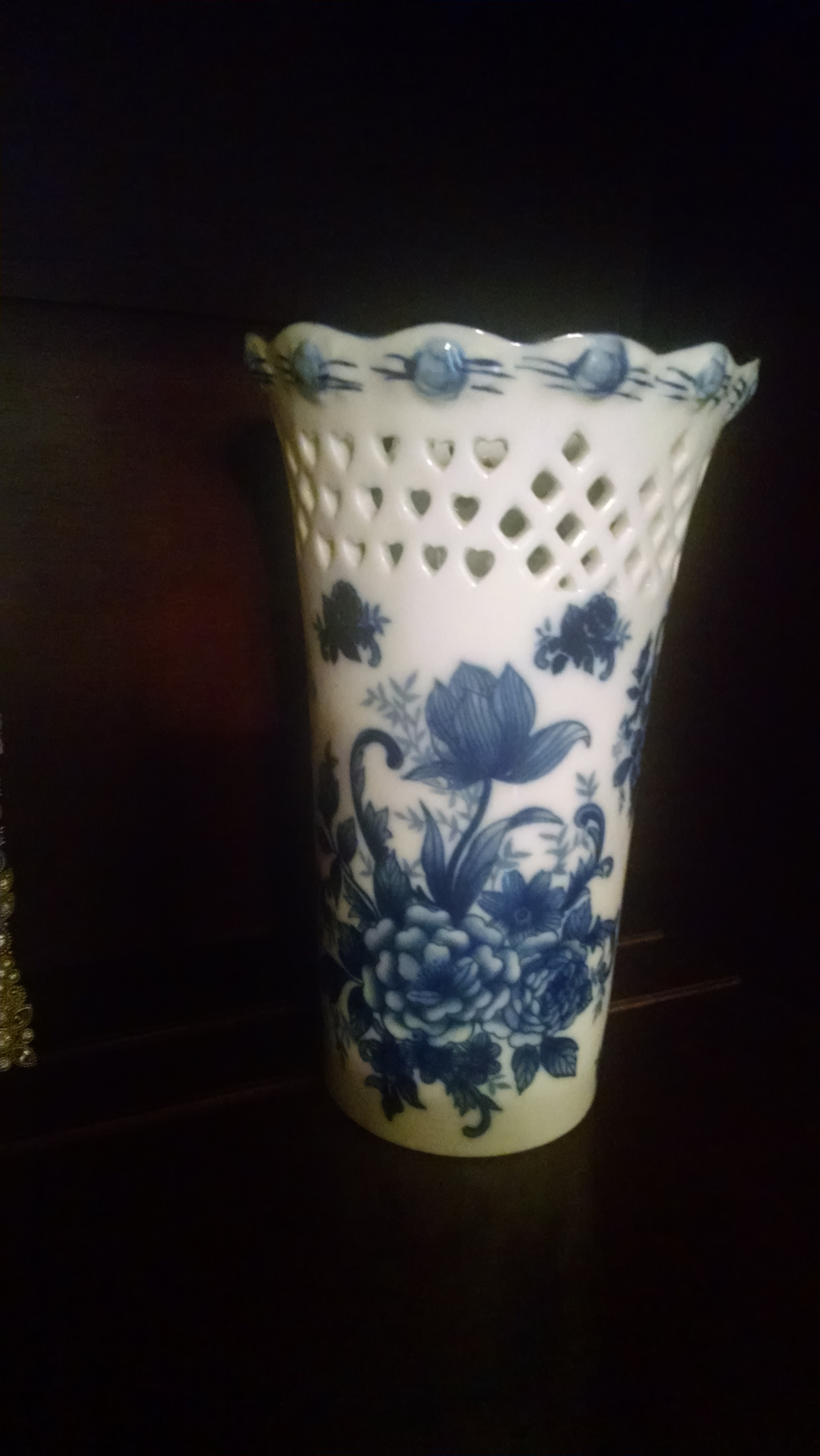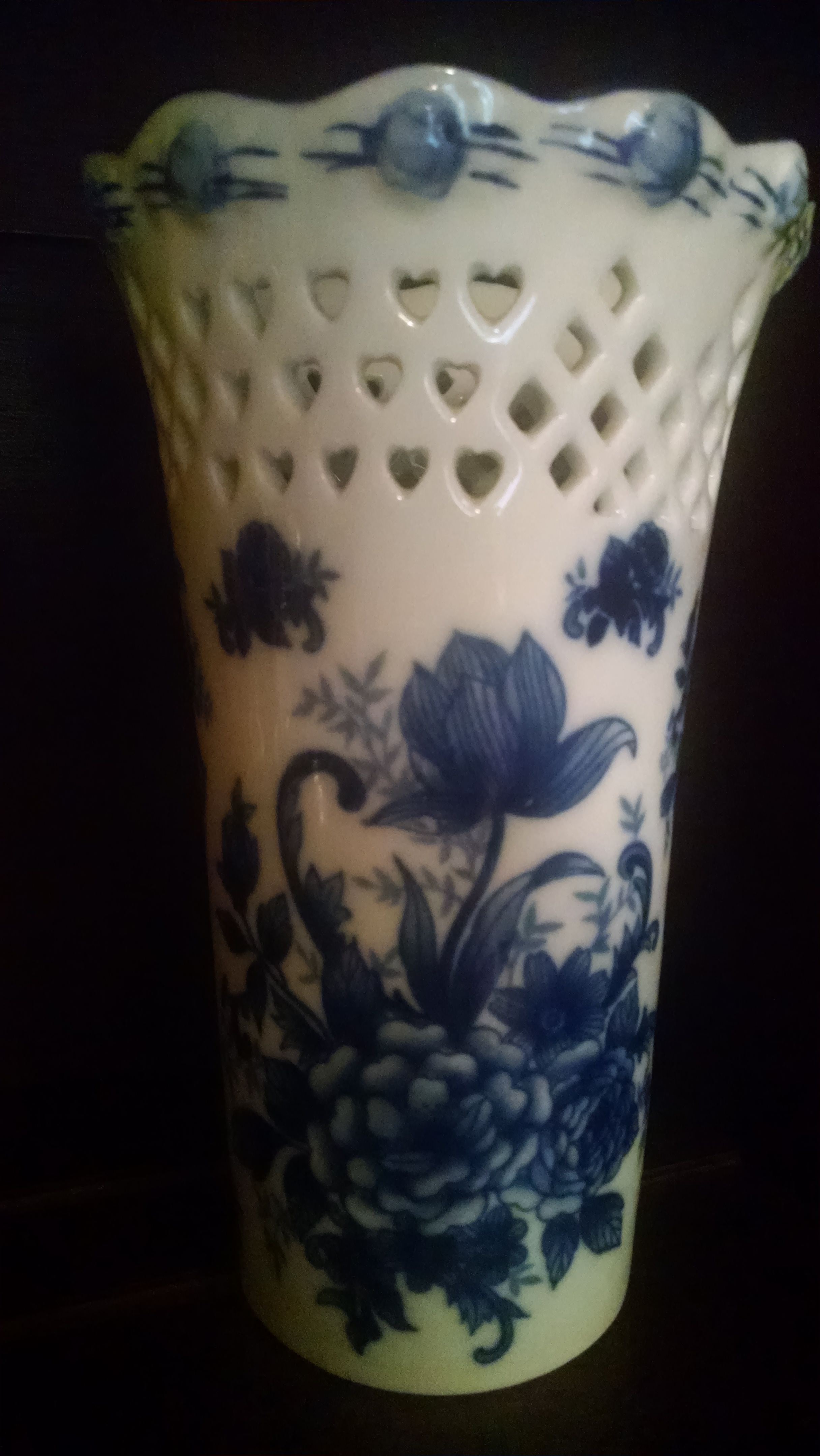 Hi, my parents bought my wife and I this vase. The vase is approximately 12' tall and white porelain with a dark blue floral print all the way around. At the top of vase is etched out hearts and diamonds. Also, the very top of vase has raised flowers. There isn't a maker/company name or where vase was made on bottom or that I can find anywhere else. My parents stated that the dealer they bought vase from said it was from England. Thank you for any help !