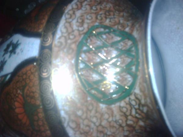 This piece was given to my grand mother by her mother. It's origin is unknown to us. It is porcelian with had painted gold art work.