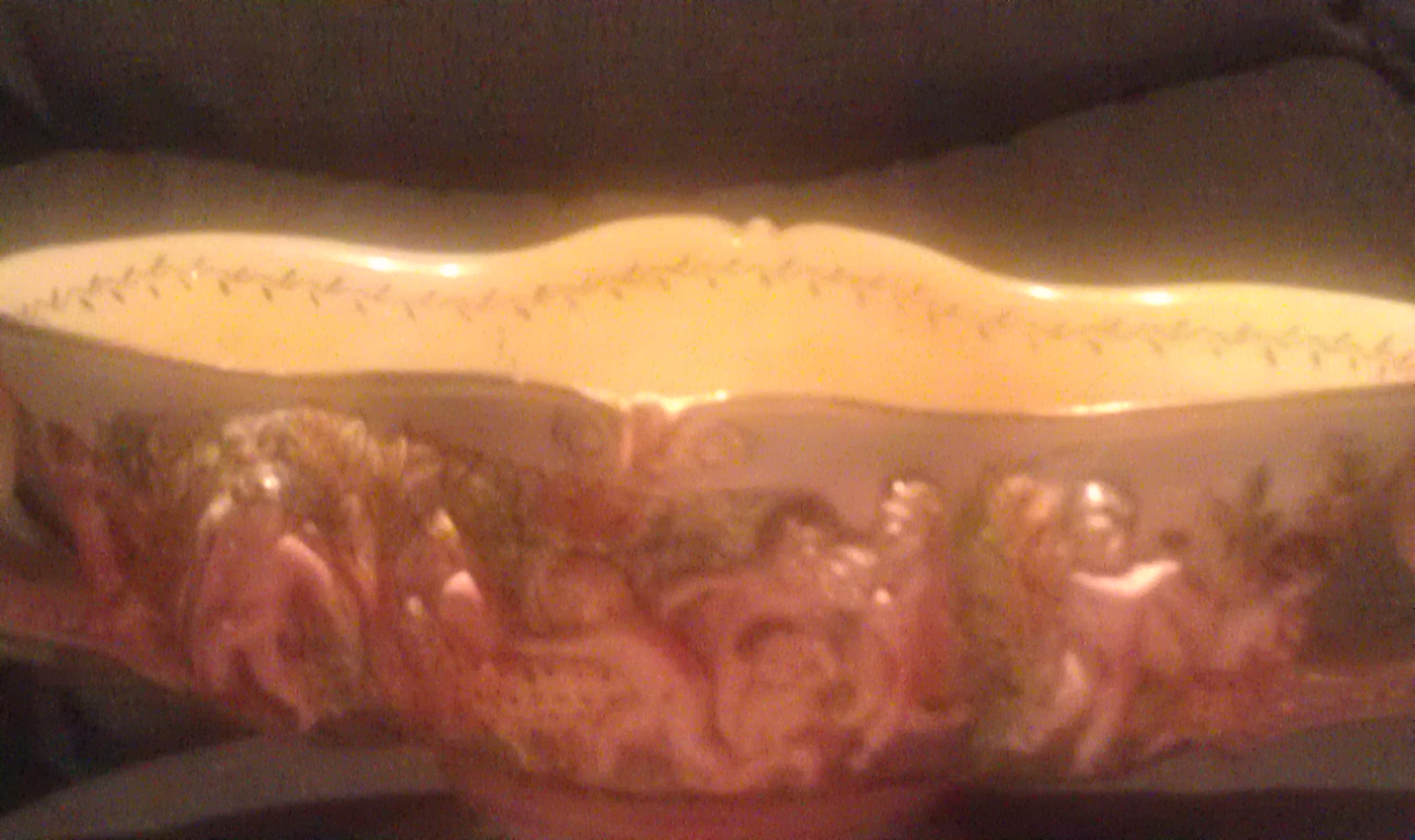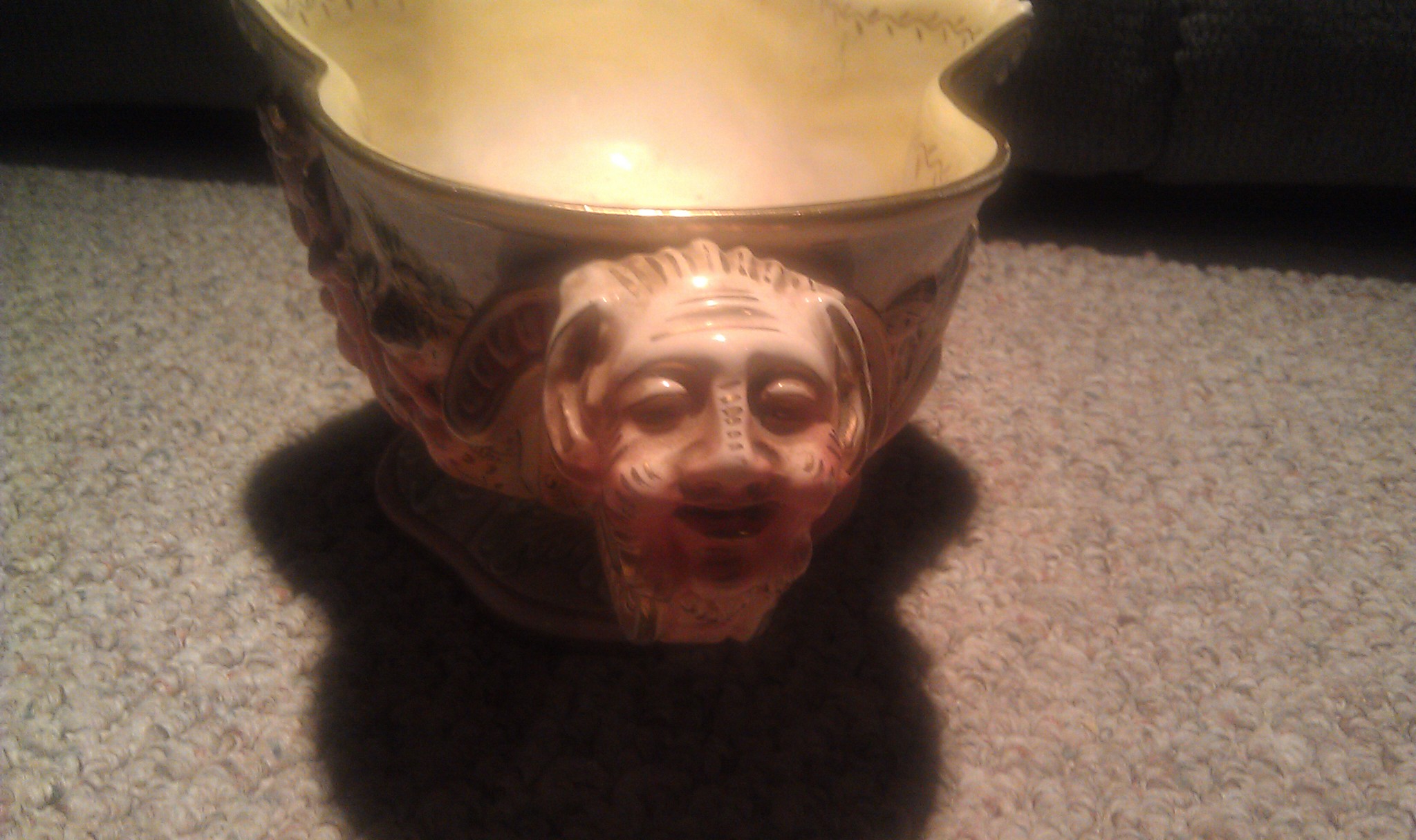The inside is painted yellow and white with a gold flower at the bottomt. here are horned male faces on either ends that act as handles.