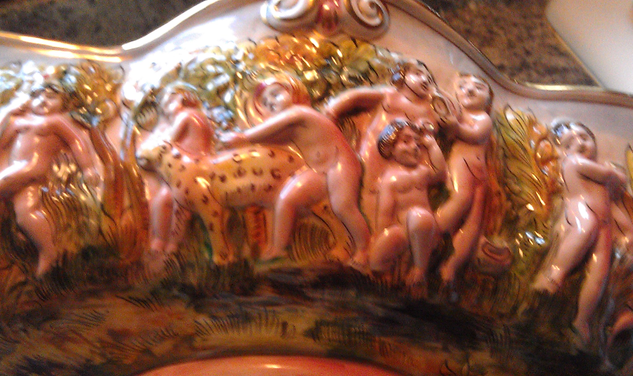 It is a large painted bowl. With naked children patting leopards. Some are holding staffs, jugs. The children are 2 dimensional.