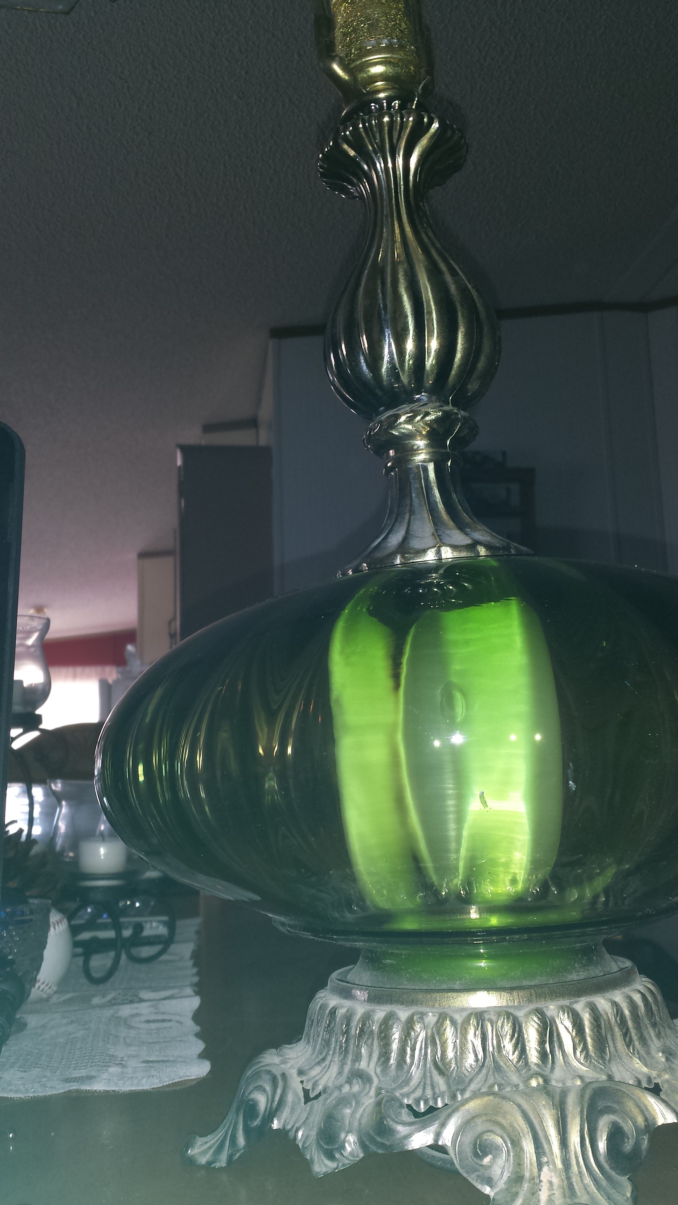 This is a portable lamp produced by Underwriters' Laboratories INC. There is a light inside the green glass that turns dim to medium to bright.