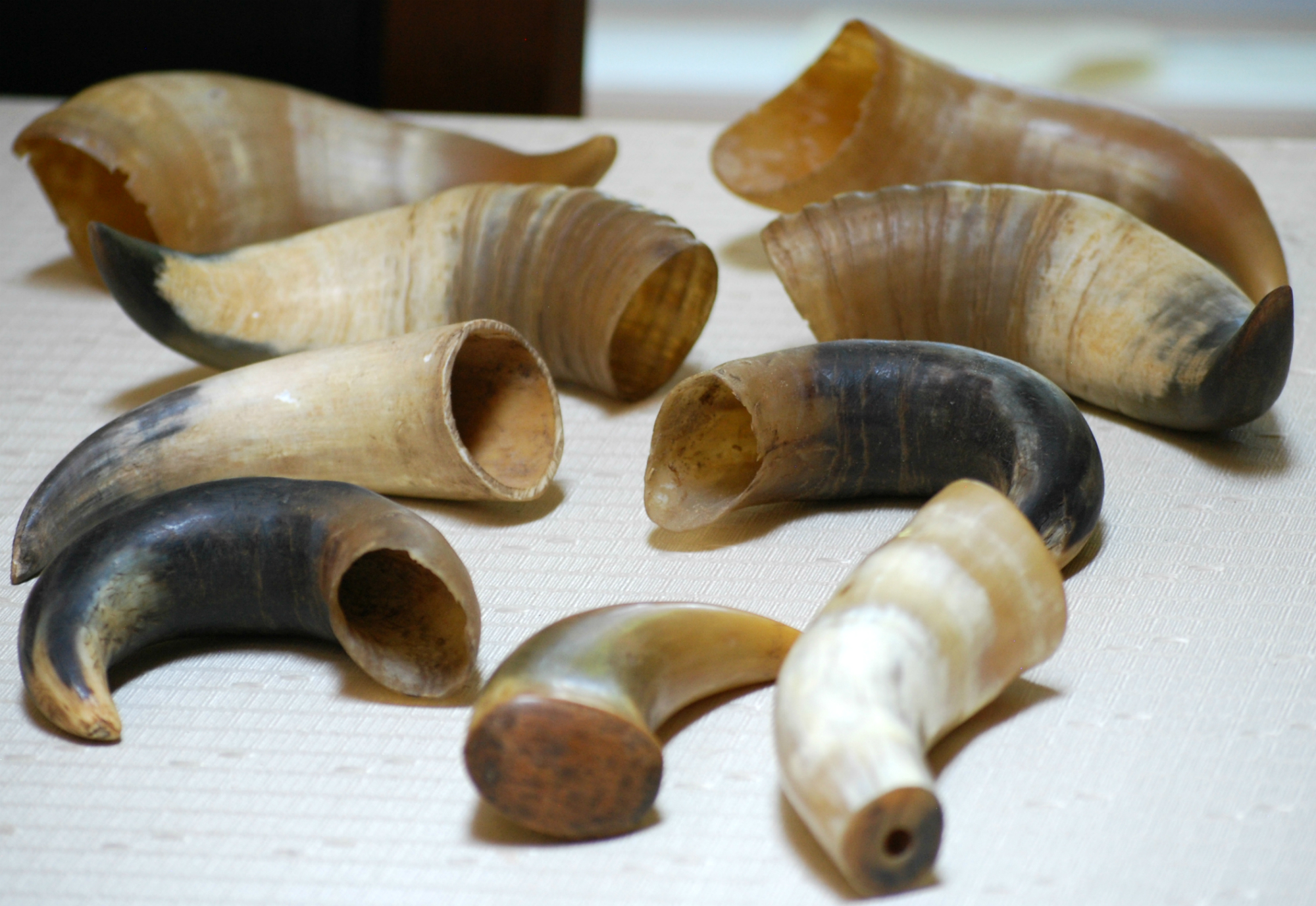 - 2 horns that were started with holes drilled; one of these horns has a wood cap on the end