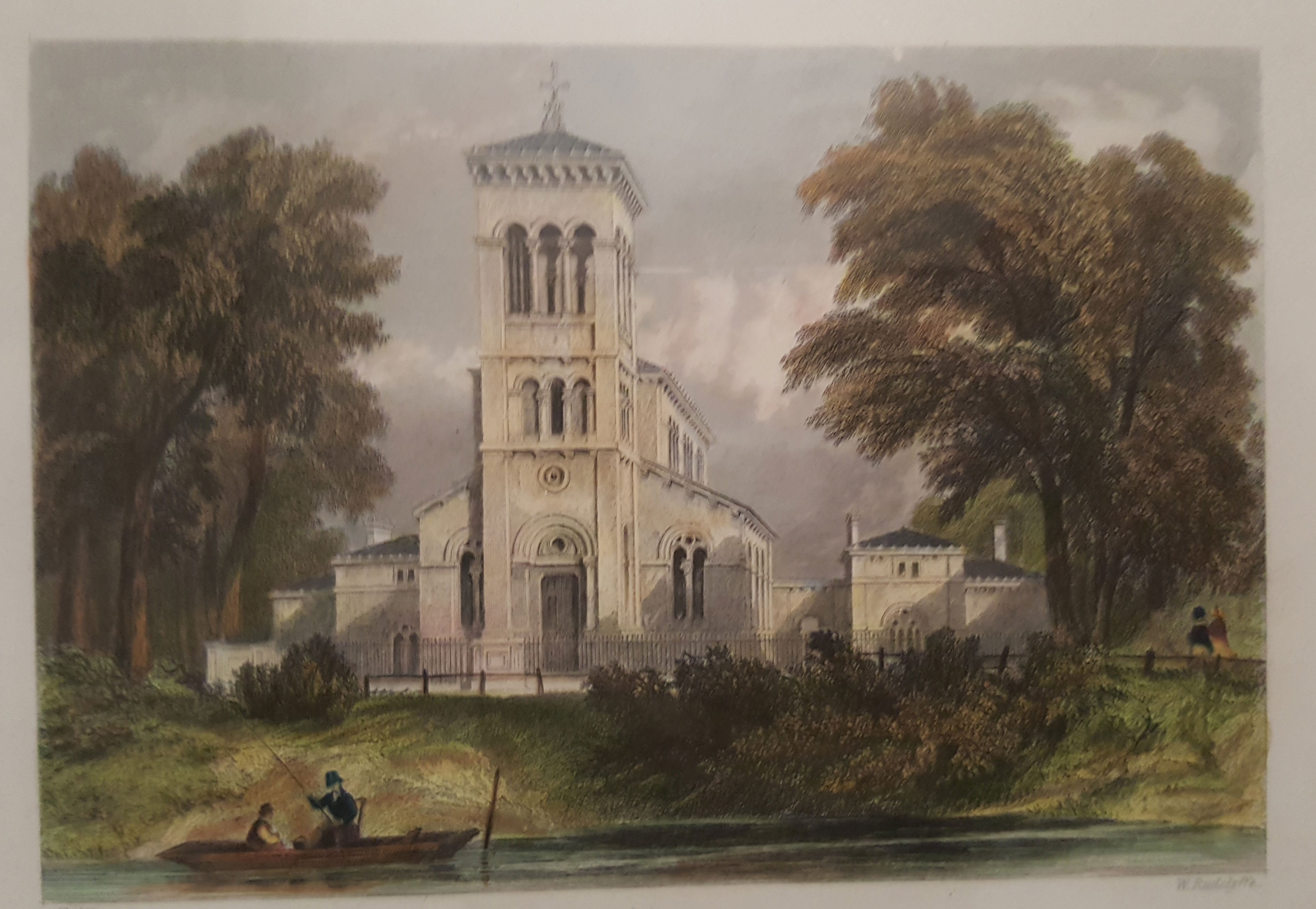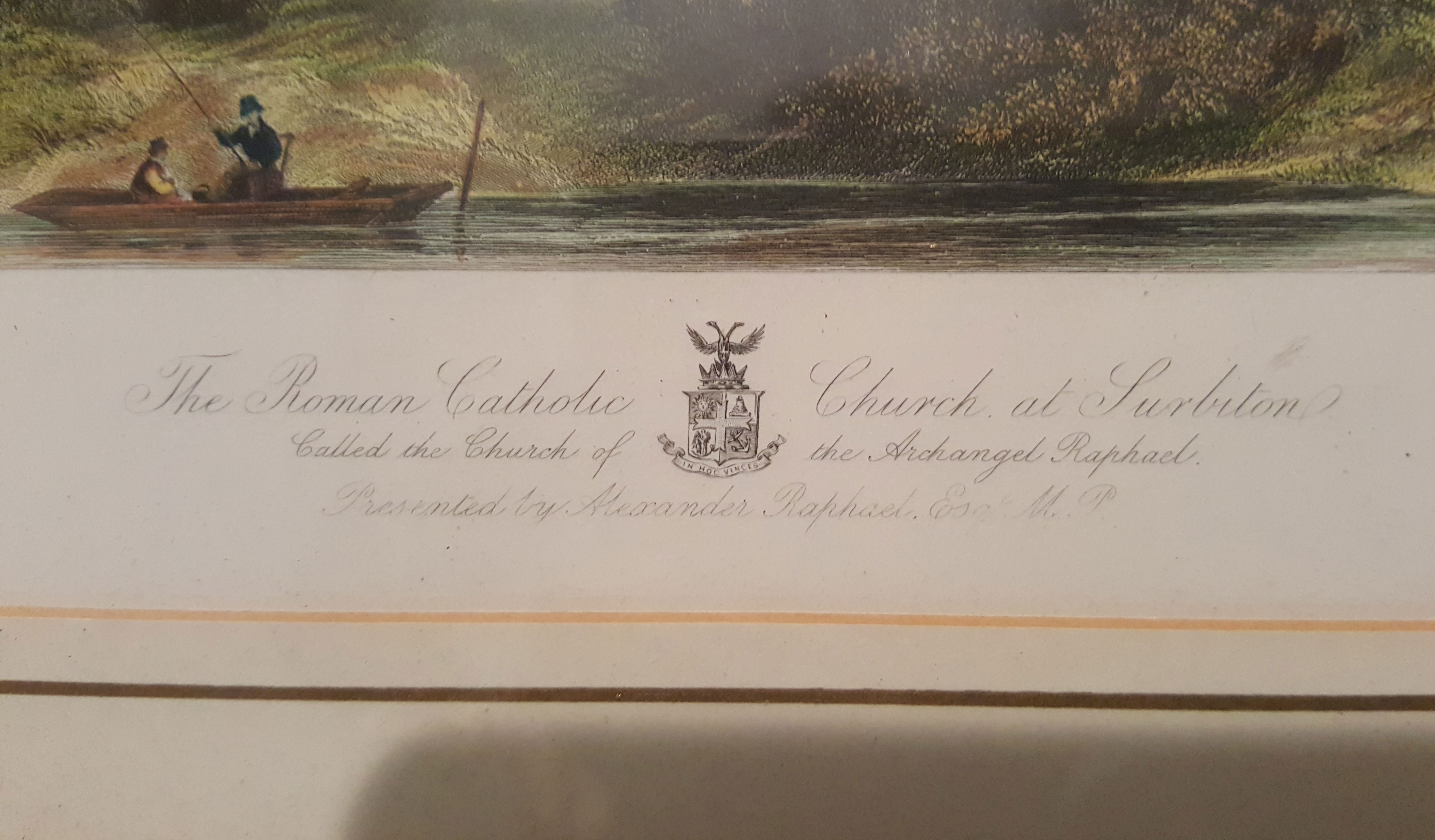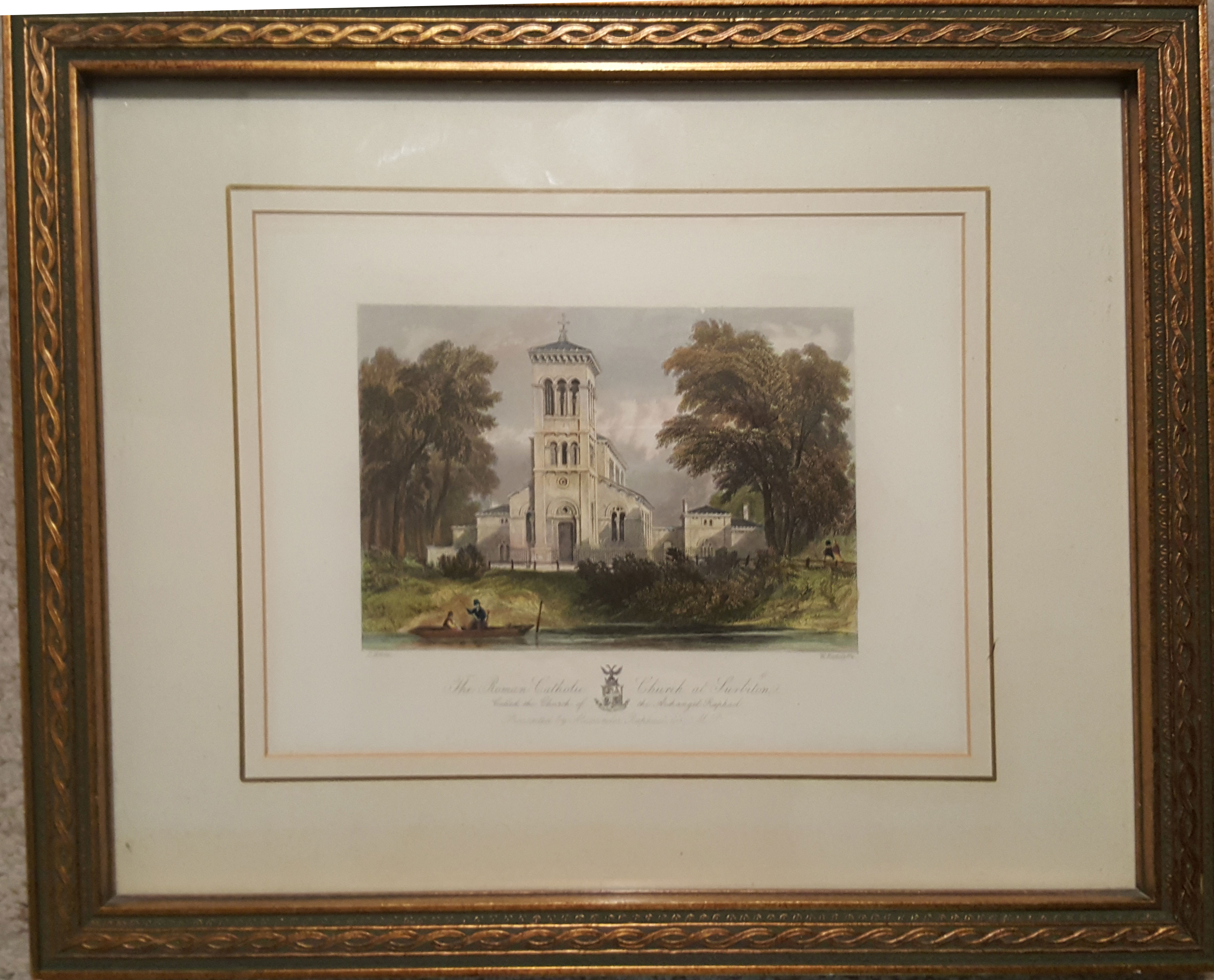 Antique print of "The Roman catholic church at Surbiton called the church of the Archangel Raphael". There is a sticker on the back that states this is an Original STEEL ENGRAVING. Date: C1840. The frame it gold and in perfect condition, the matting is a french matting with a gold lip on white. the opening in the matt is 8" x 10", the outside dimentions of the frame are 15.75" x 12.75".