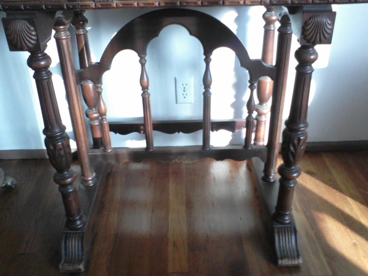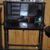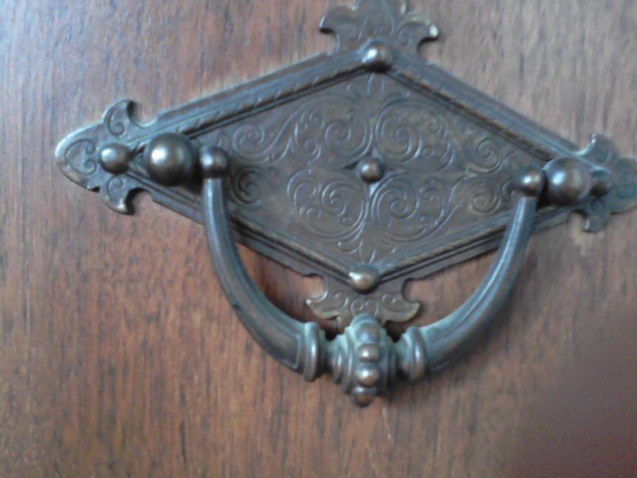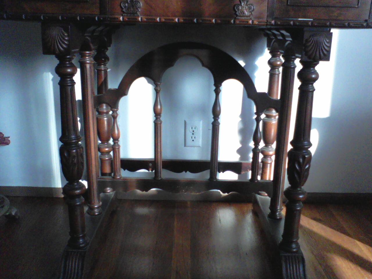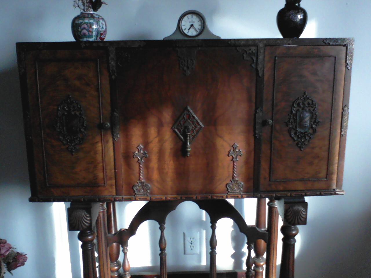 It has a pull down front to be used as a desk two side cabinets doors open to the sides , shelf for papers inside the cabinet. The only thing it doesnt have is a backing for the cabinet. I might be intereted in selling it but i would like to get some information on how old it is, where it was made, the value etc..... thank you