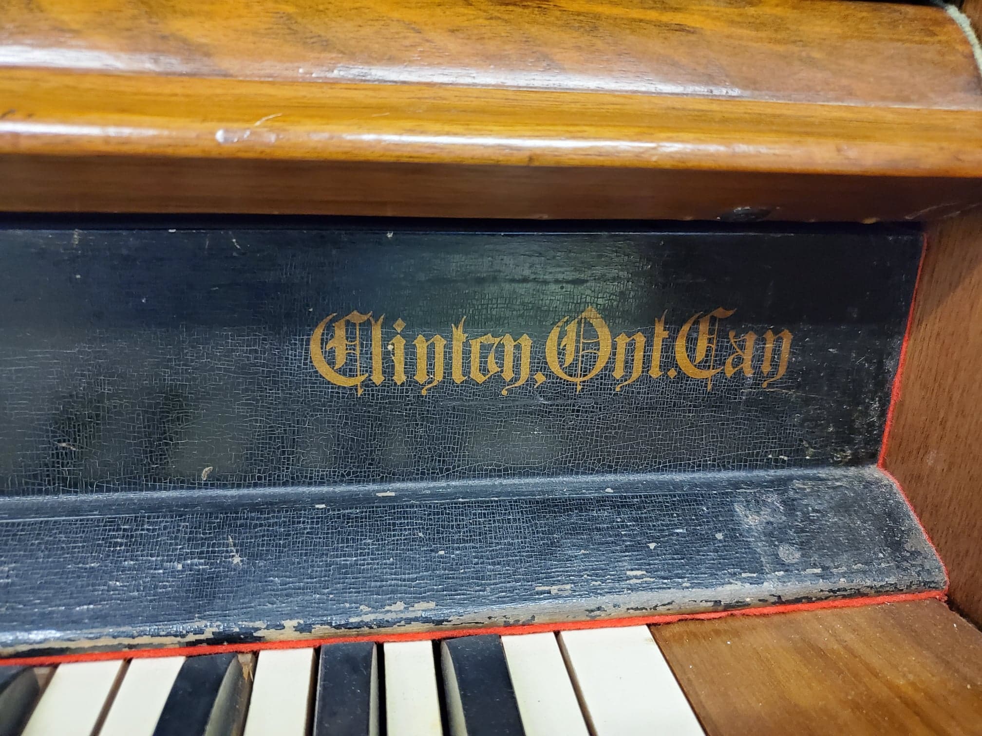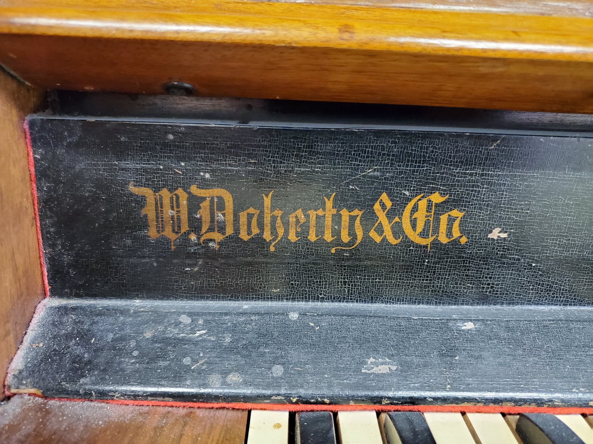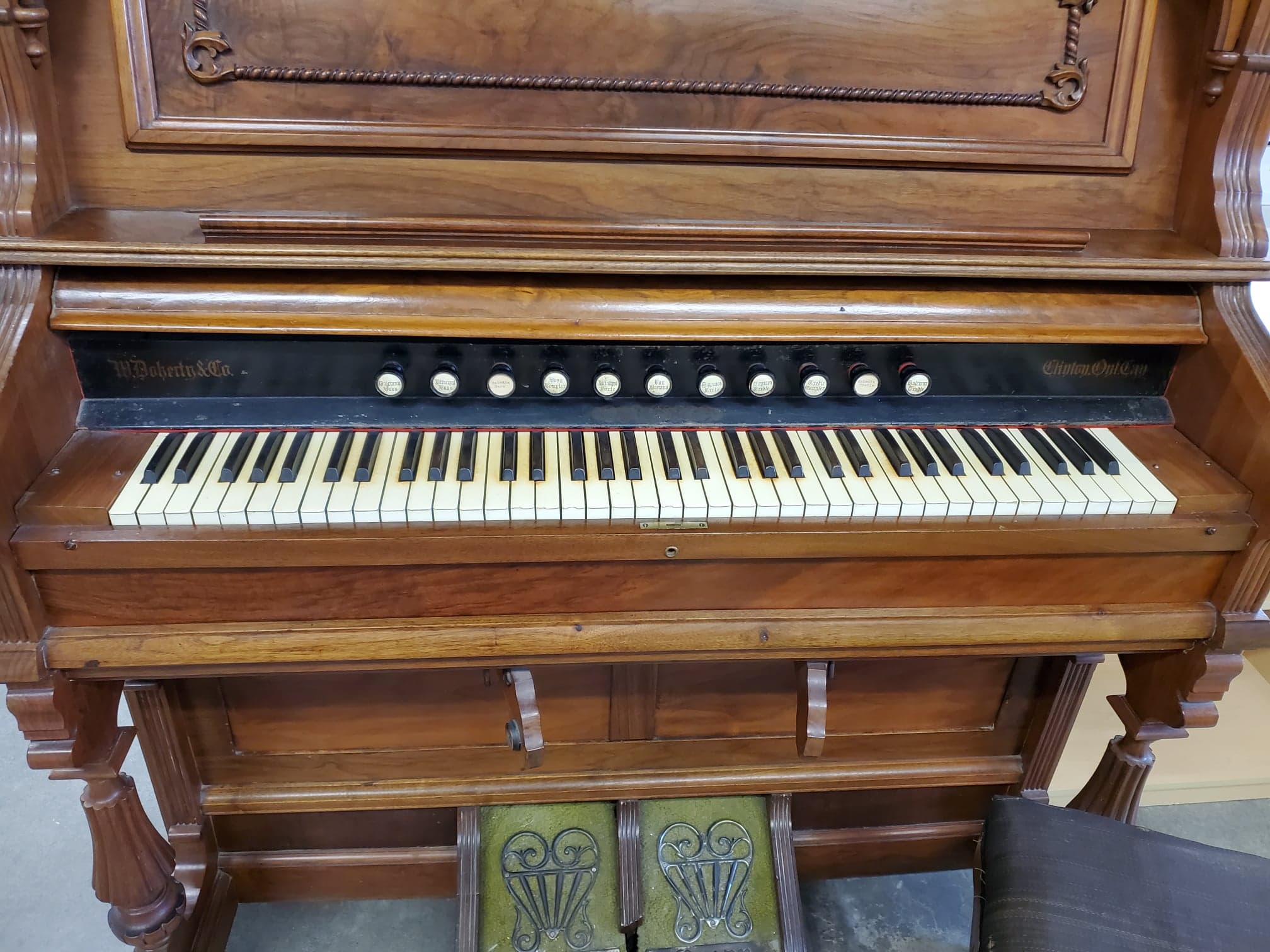 Antique wooden pump organ made by W. Doherty & Co. in Clinton, ON in 1900 as based on the serial number, 34999. The organ is still fully functional and in good shape. It also comes with the stool that came with it.