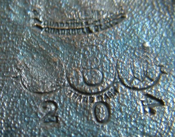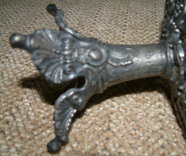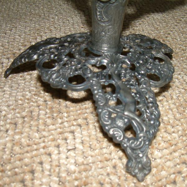 This appears to be a stand for a bowl (there was not bowl). The base has four legs, a pillar type neck then three prongs that go up to hold a round item. Very intricate details all over. On each prong there is a cherub standing with his hands reaching up, small wings. No markings under the bowl. In the center are several markings: Once states Quadruple Plate and lightly printed above that is WHITE METAL, below that are three symbols, each in a circle. I can not make out the first symbol. The second is a capital B, the third appears to be a shield with swords diagnally coming out each side. Under this the the number 2 0 4, however the 4 is sideways. The metal is a pewter color instead of silver color, very dull.