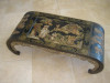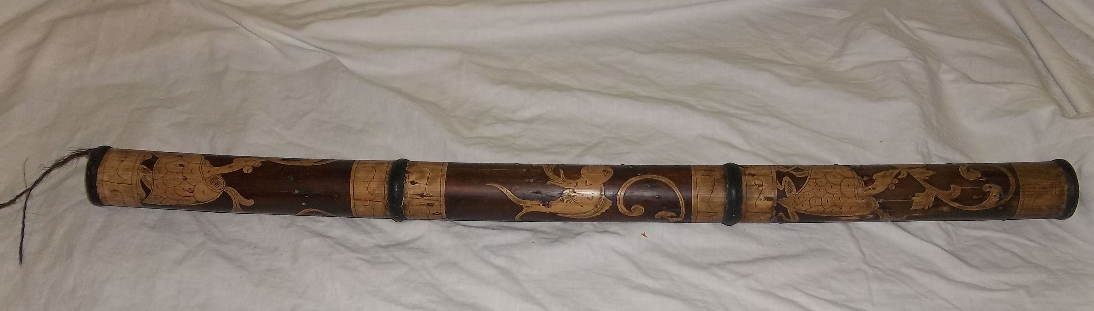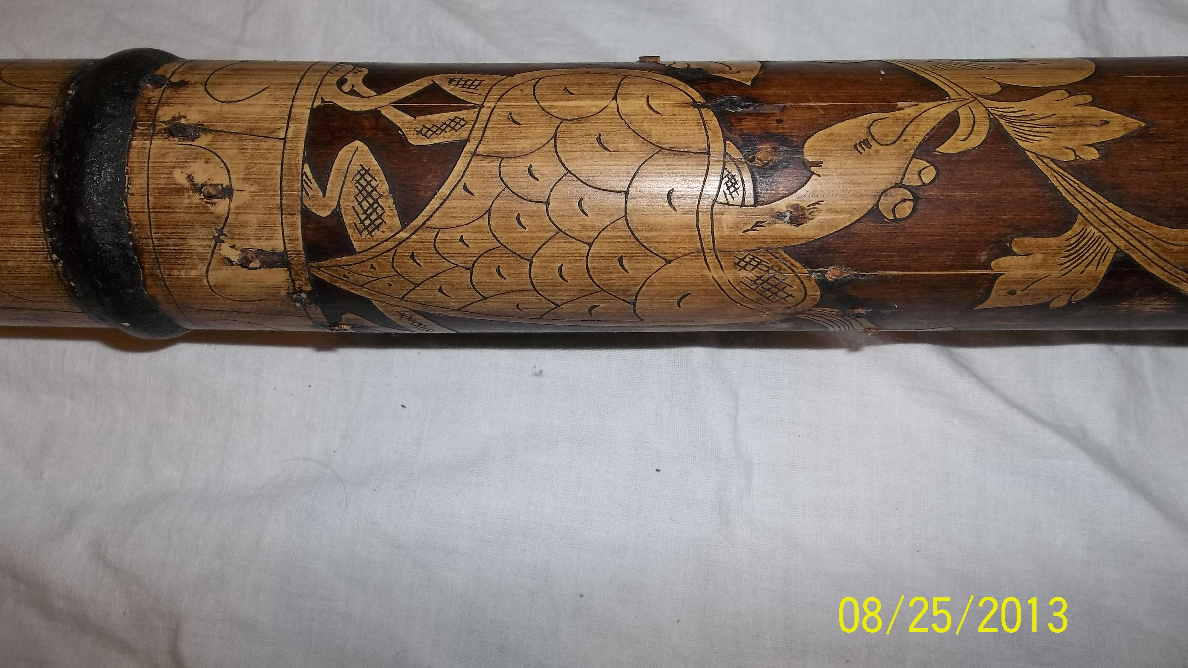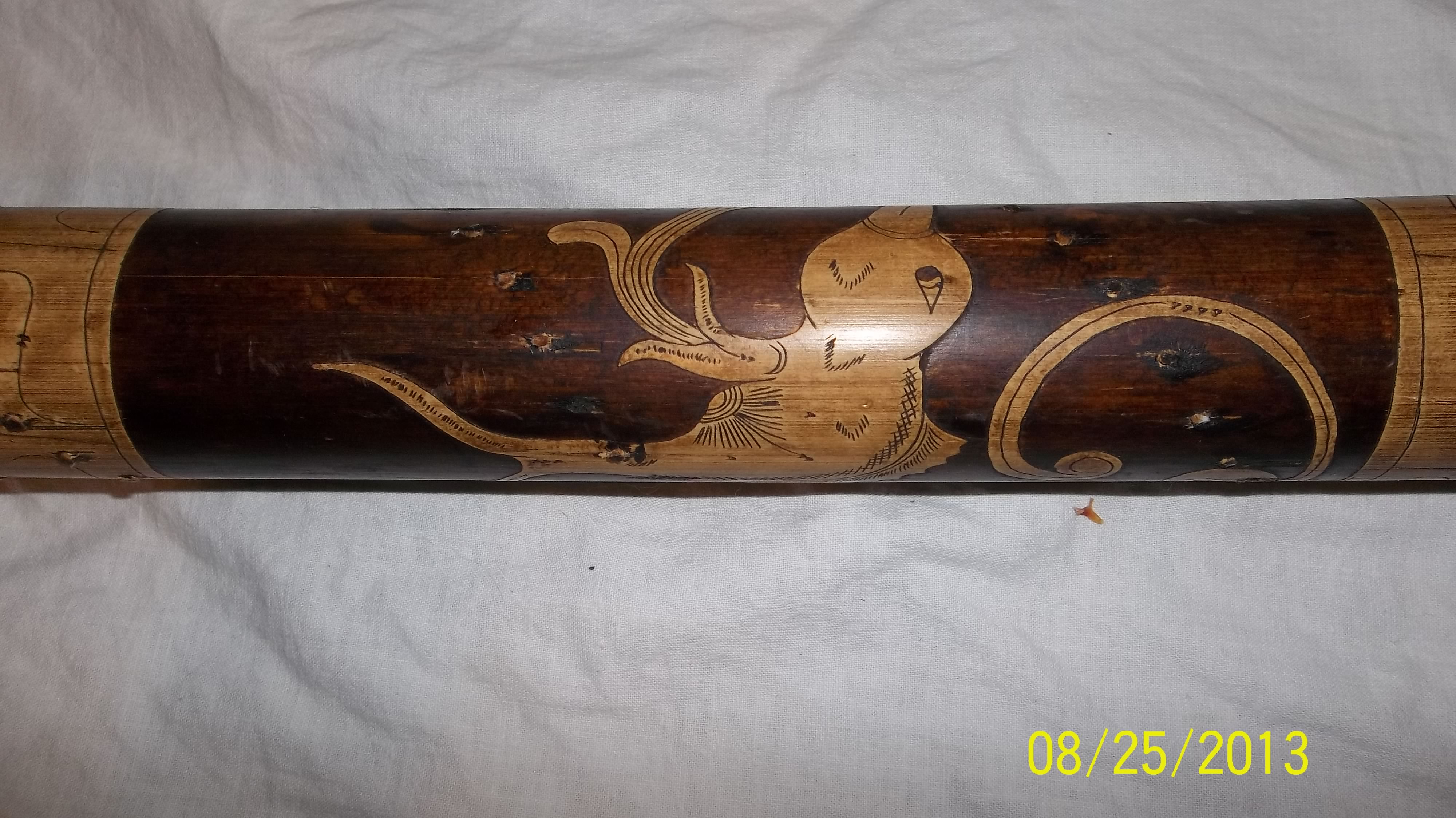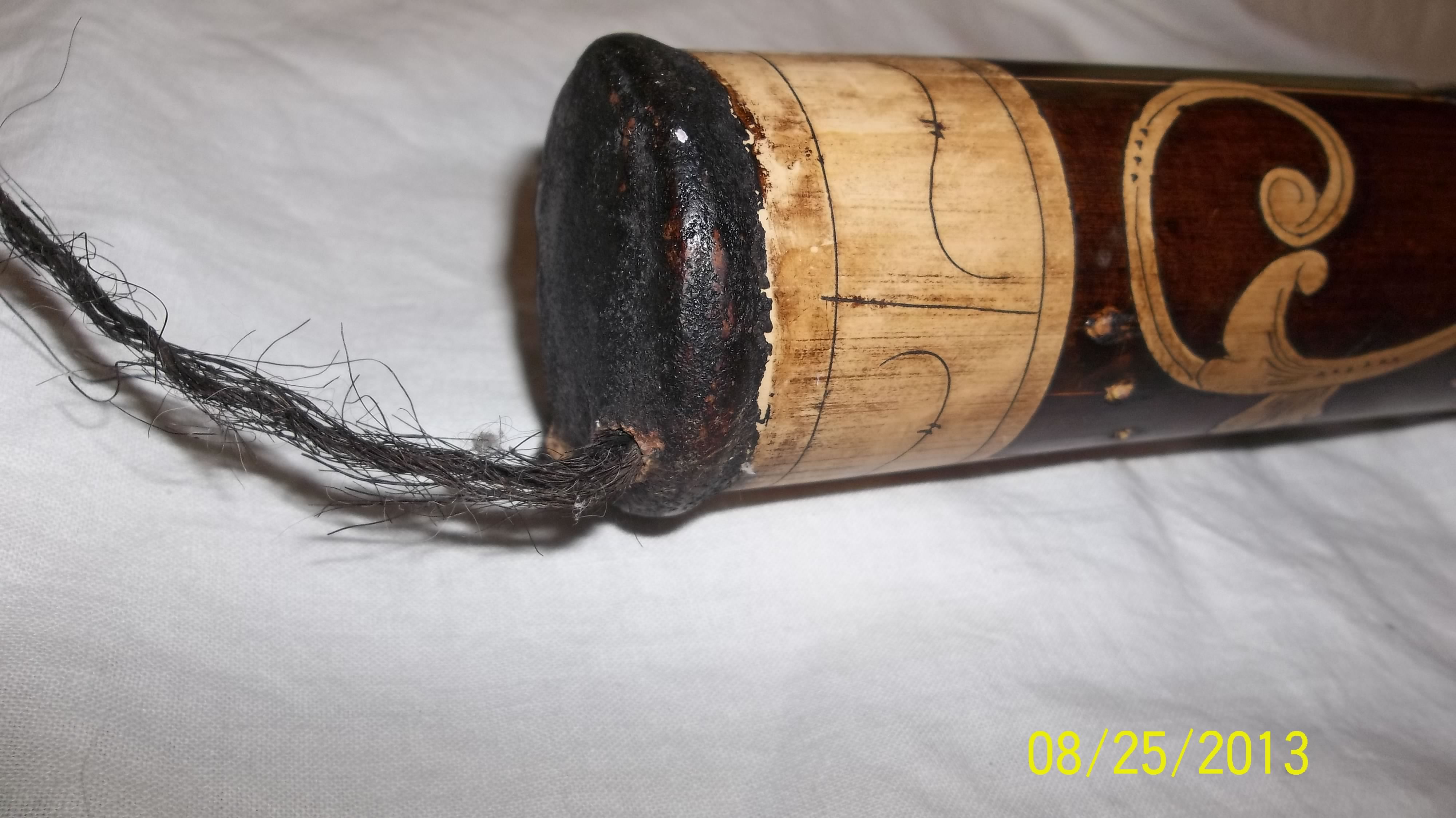 have a 32" rain maker stick. It has old leather ends, a broken loop of hair, and has wood with a white/cream inlay design of a weird looking fish in center of stick and each end has bird/turtle like creatures with scroll designs. There is great detail on the white inlaid, carved lines. I can't tell what the material is - bone, ivory, plastic or something else. Has a spiral wooden tacking about every 1/2" twirling down entire stick.