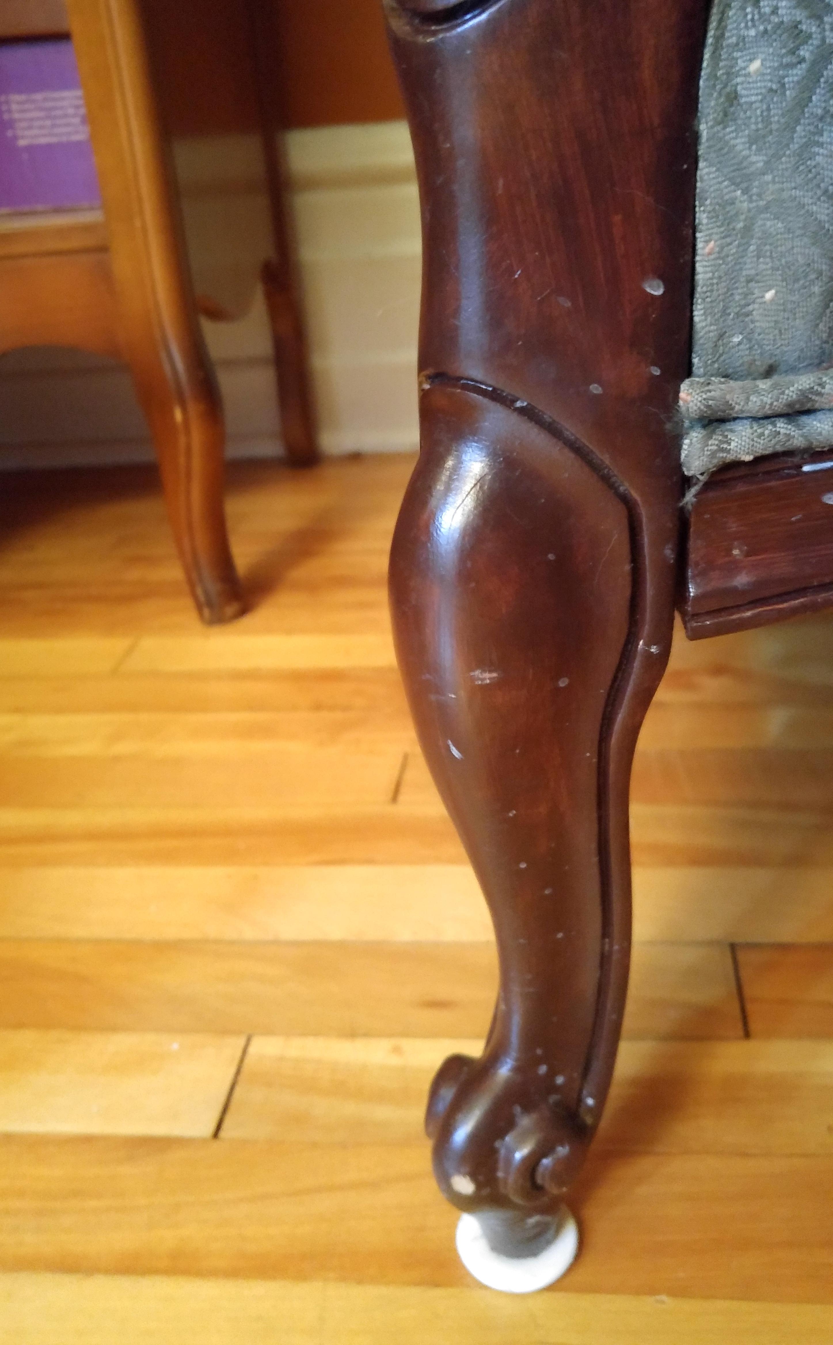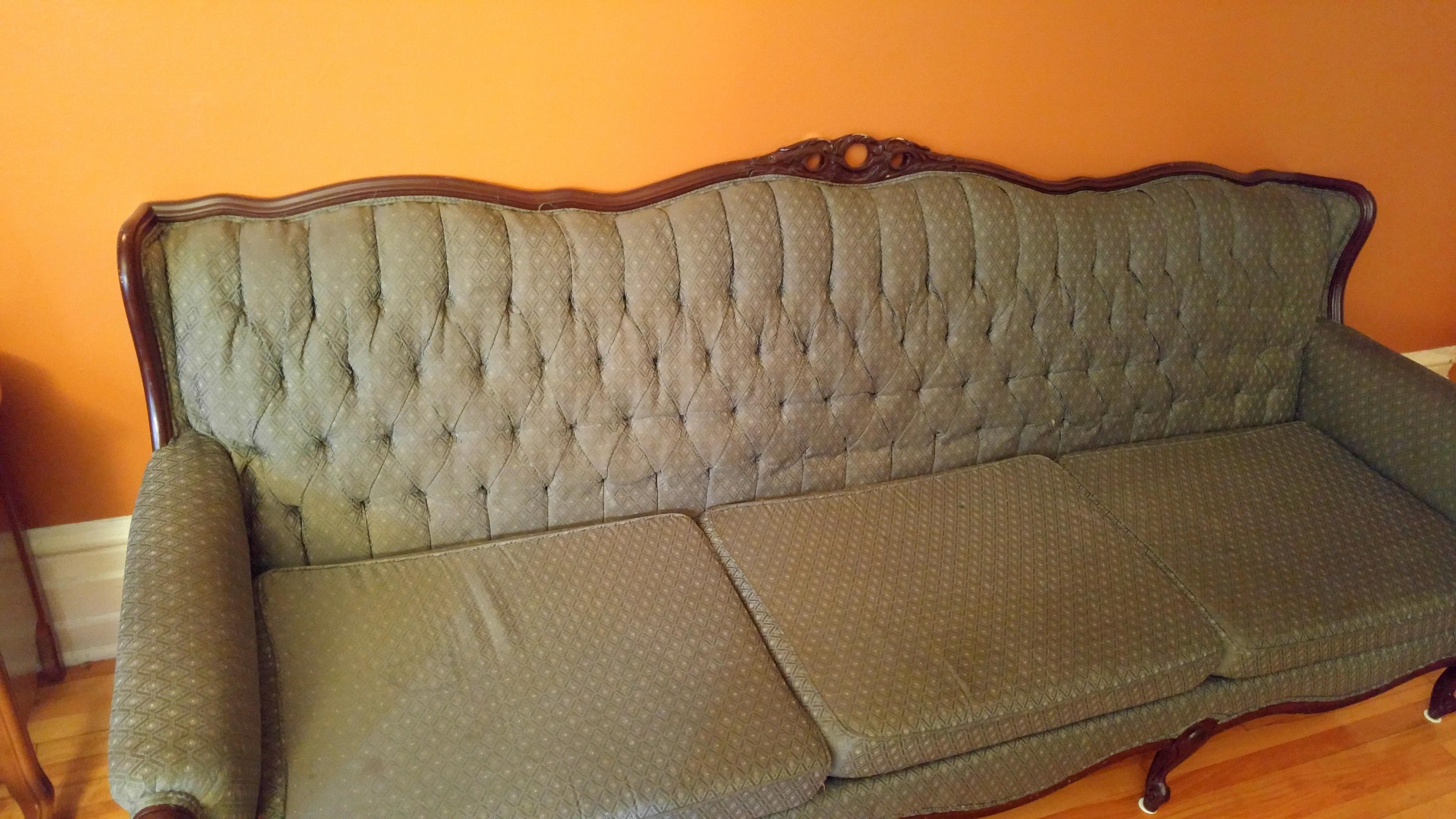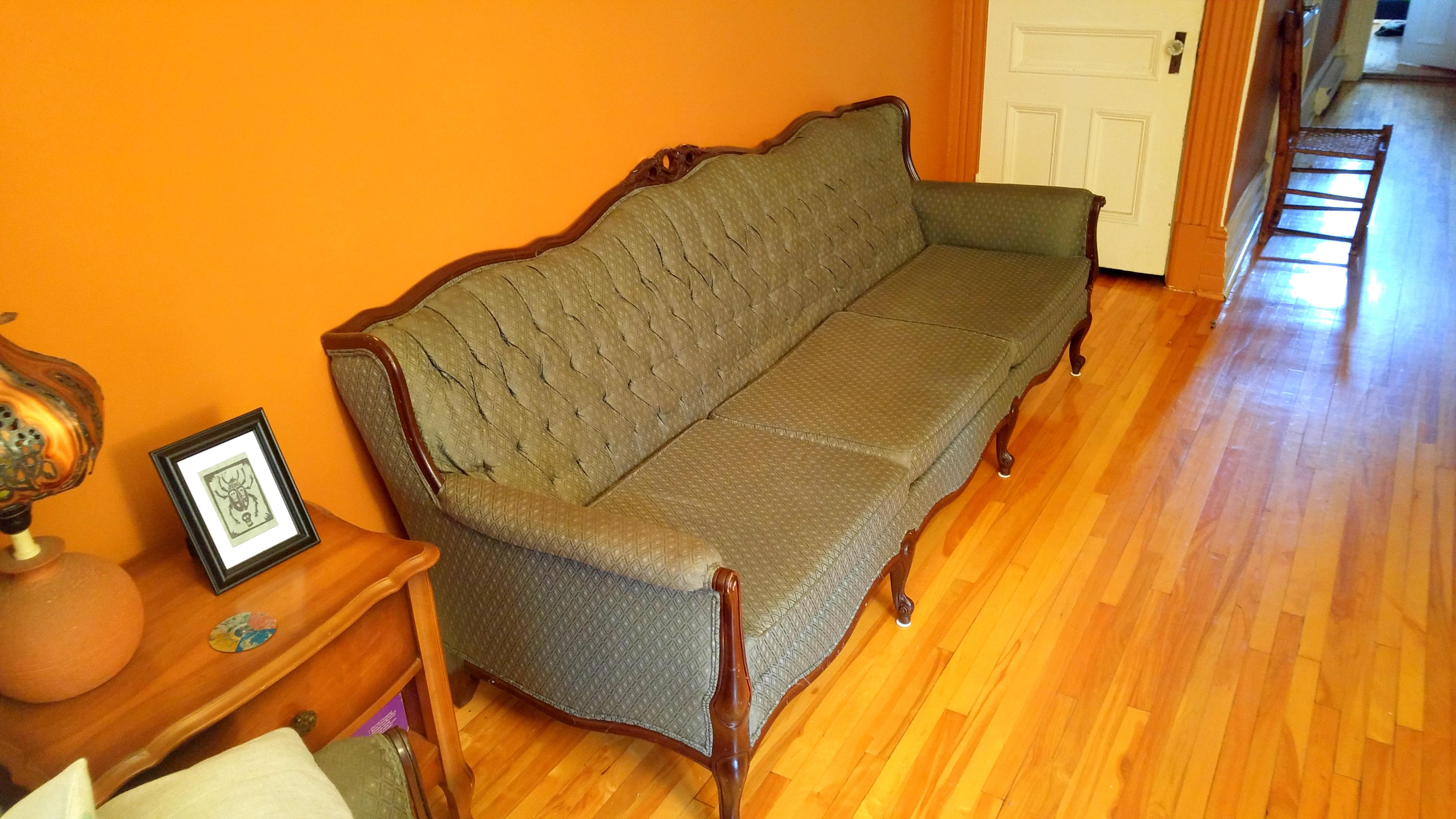 I acquired this couch from someone's (dry) basement in the Verdun region of Montreal, Quebec, who's brother had it before him and the person prior to that had apparently re-covered it. The underbelly provides no further ID information of stamp or what have you to gauge it's year and type. The legs are carved and not removeable ingerated into the wooden frame. There are thick metal "S" springs underneath. Very long, and wide, I had to hoist it in to my balcony on ropes to get it in my apartment! Came with arm chair. Any idea what age/ style this baby is? Value also?