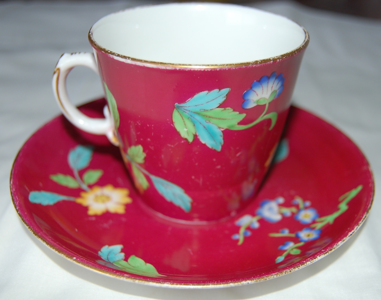 Antique red floral teacup and saucer with floral pattern. and dimished gild. Has faded diamond emblem on the back of saucer and teacup reflecting that it was made in England sometime in the mid to late 1800's, as I understand it.