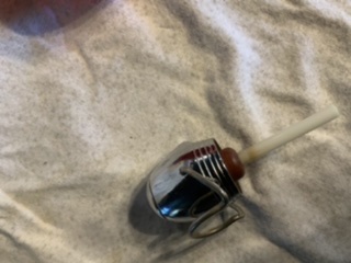 Red round glass ball etched with a bird and metal pour spout with straw sticker say made in ussr