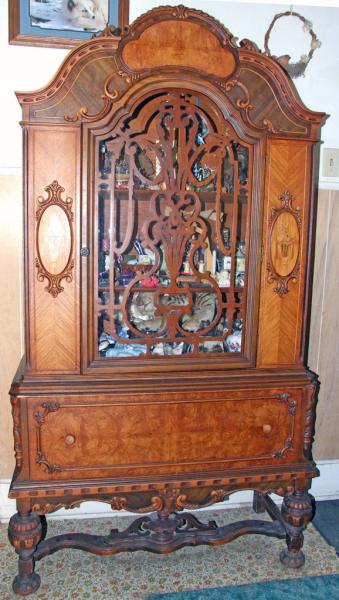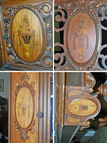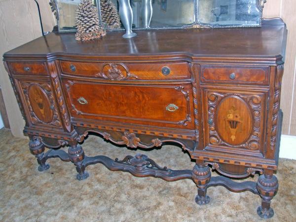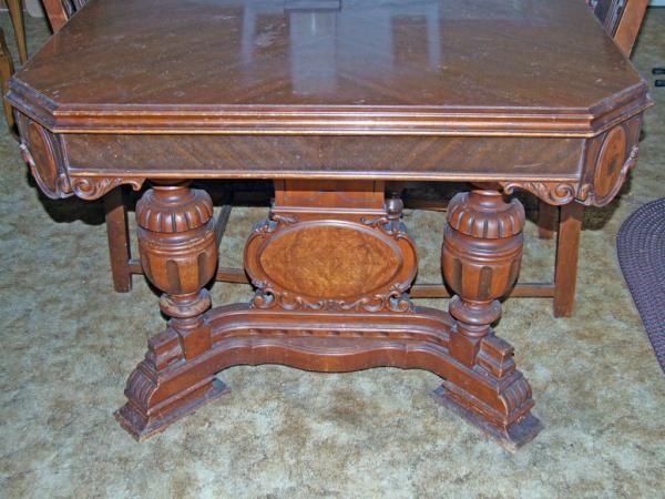 This dining set was purchased by my mother from her hairdresser in Syracuse, NY around 1966 and was the focus of our home for many years. It was moved to Arizona in 1986, which did not seem to make it happy, as many of the joints are loose. I have been told that it is an "antique reproduction", that it was made in the 1920s or 30s, and that it is mahagony. The set consists of the table, 6 chairs, one with arms, sideboard and china cabinet. The table has one leaf that stores below the top. The china cabinet had pulls matching those on the sideboard, one of which was lost or damaged. The finish appears to be shellac, and the decorations appear to be inlaid. My mother told me several years ago that someone had told her the set was worth around $35,000. Regardless of its value, I would like to find someone who can appreciate it the way my family once did, as it's a magnificent set but needs a new owner. There's also a 3-pane Murro mirror that's been with the set and which I'd like to know the value of.