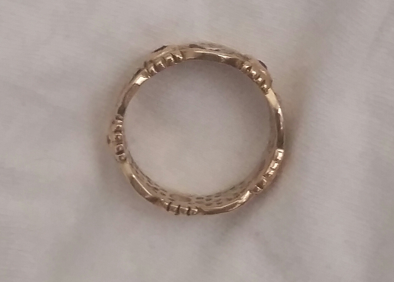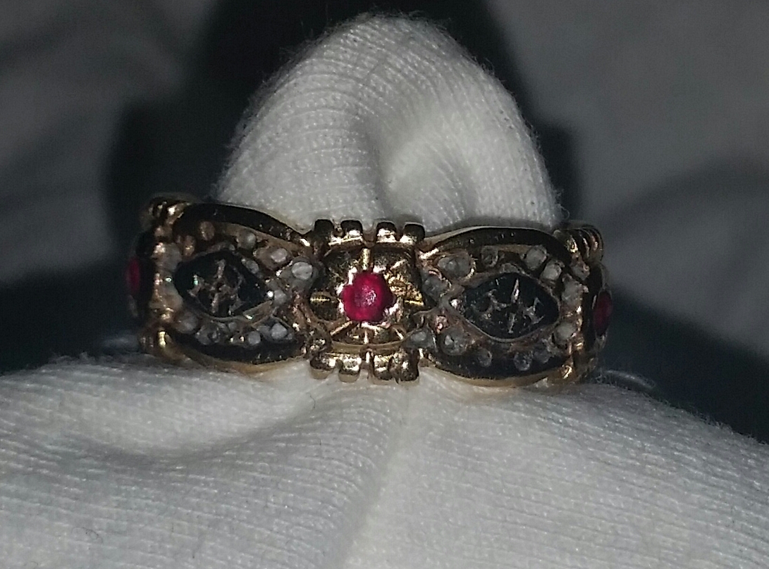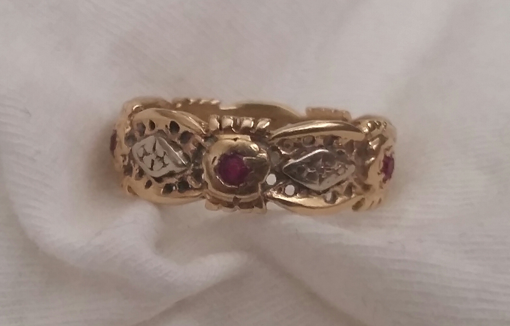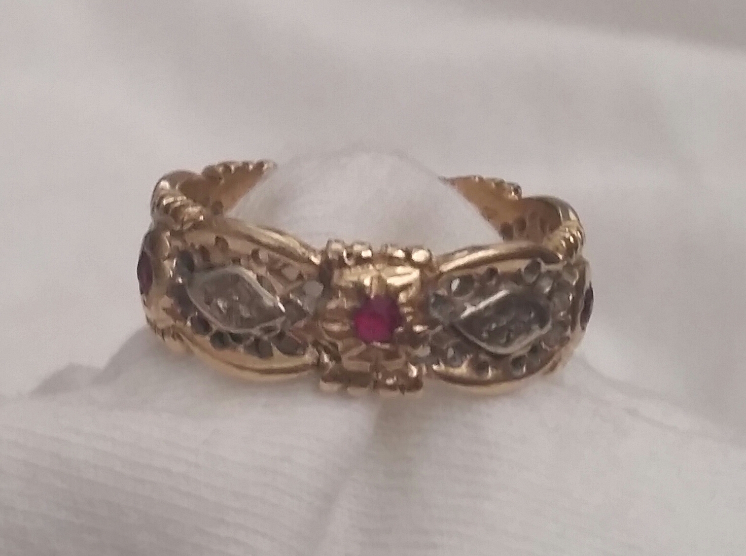 Description Yellow and white gold with rubies. Handmade, a little worn.