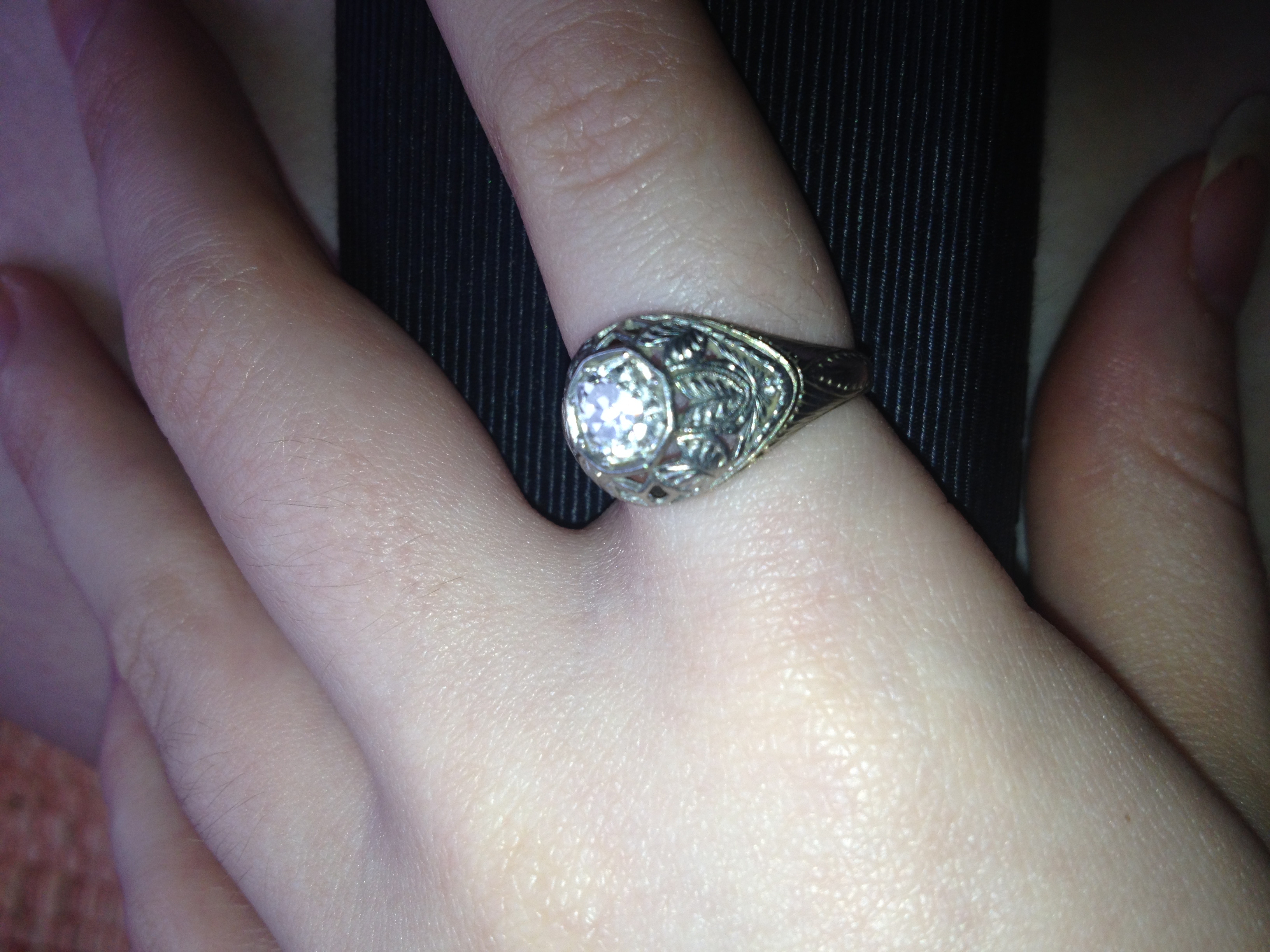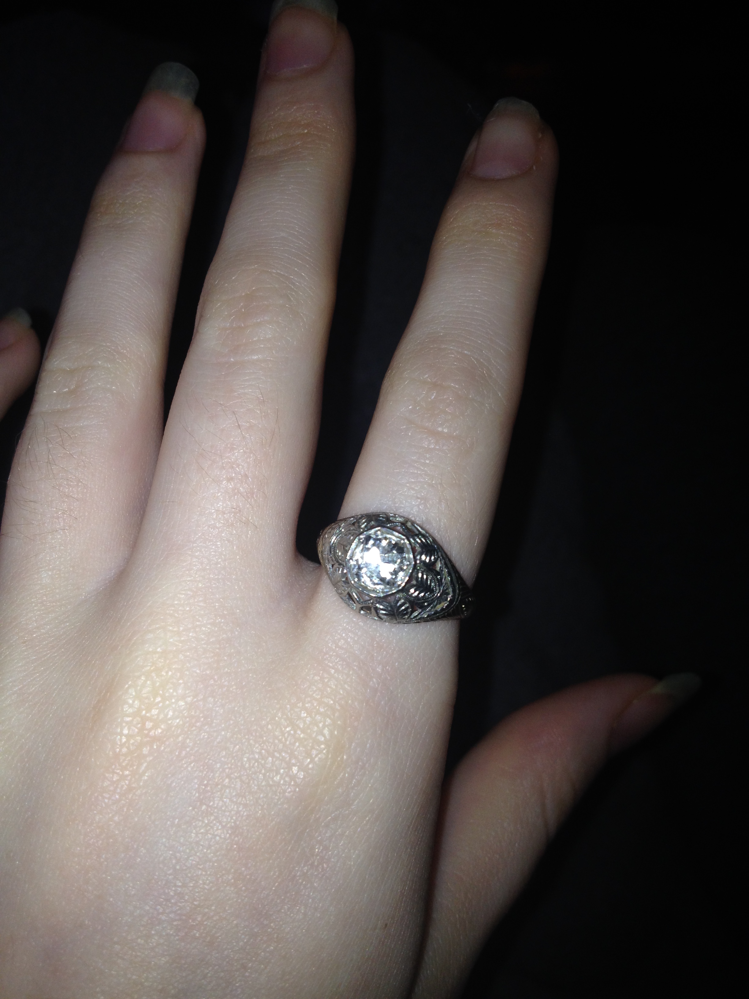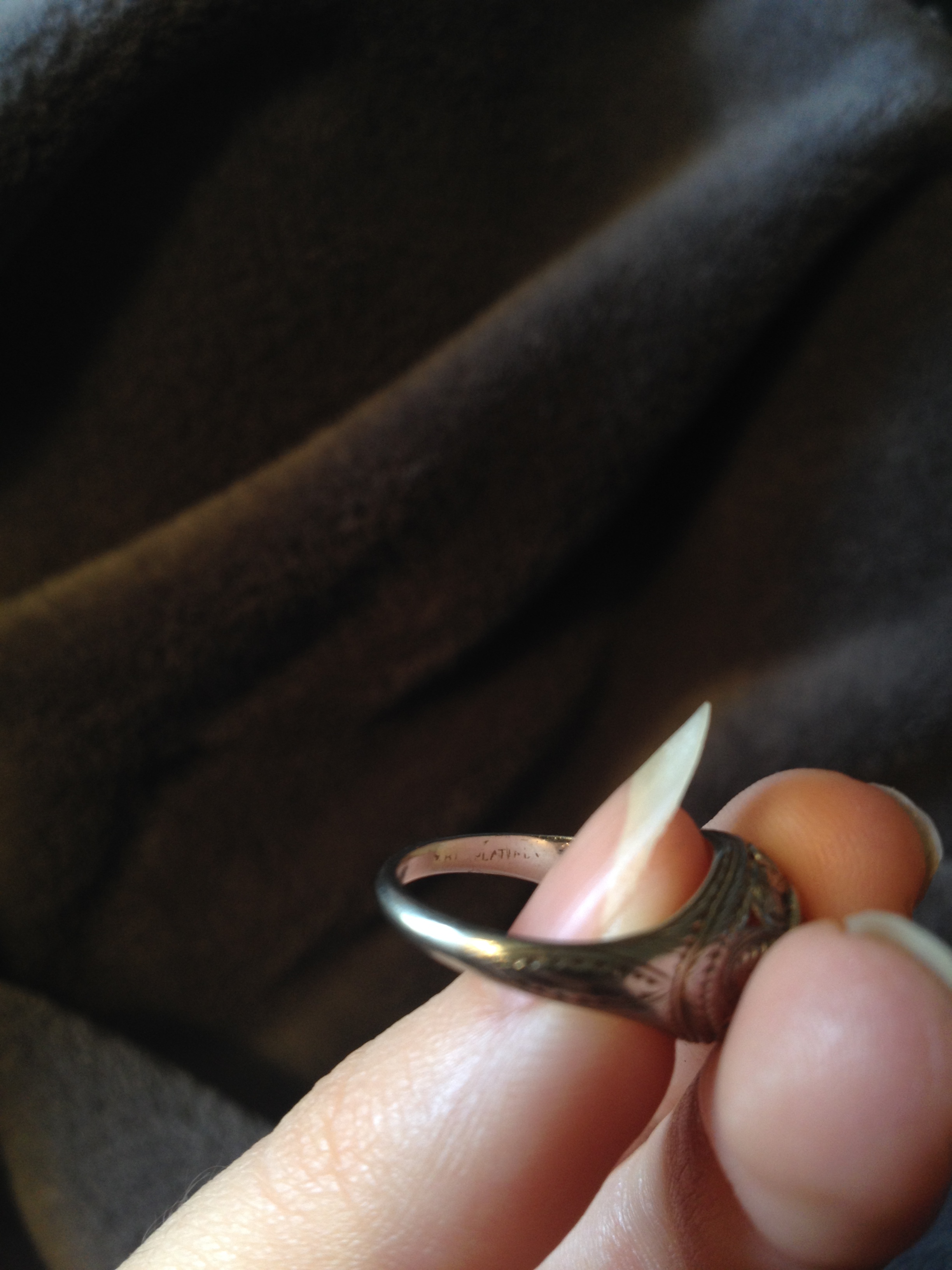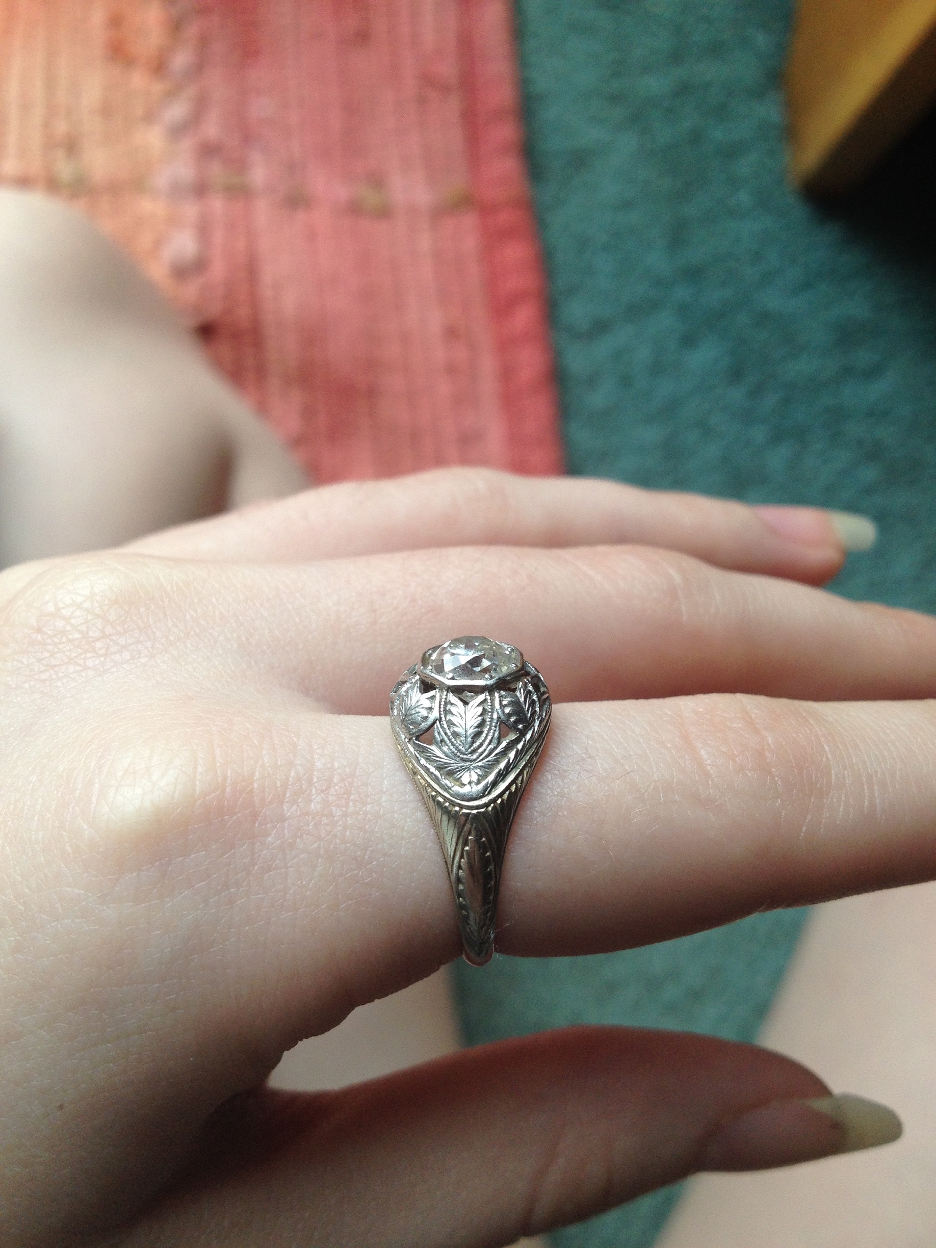 I have this ring that has been passed down from about 4 generations. I have no clue about its history only that it was a engagement ring from my family. It has been held in a safe for many years. It was passed down to me when my mom passed 4 years ago. From what I am trying to research it looks like a Edwardian ring I think maybe the markings are filigree. Inside it says platinum but is worn but you can still make out what it says. It has leaf designs around the diamond. If anyone could give me a idea about anything about this ring it would be so much appriciated. I am enclosing pictures that I hope help.