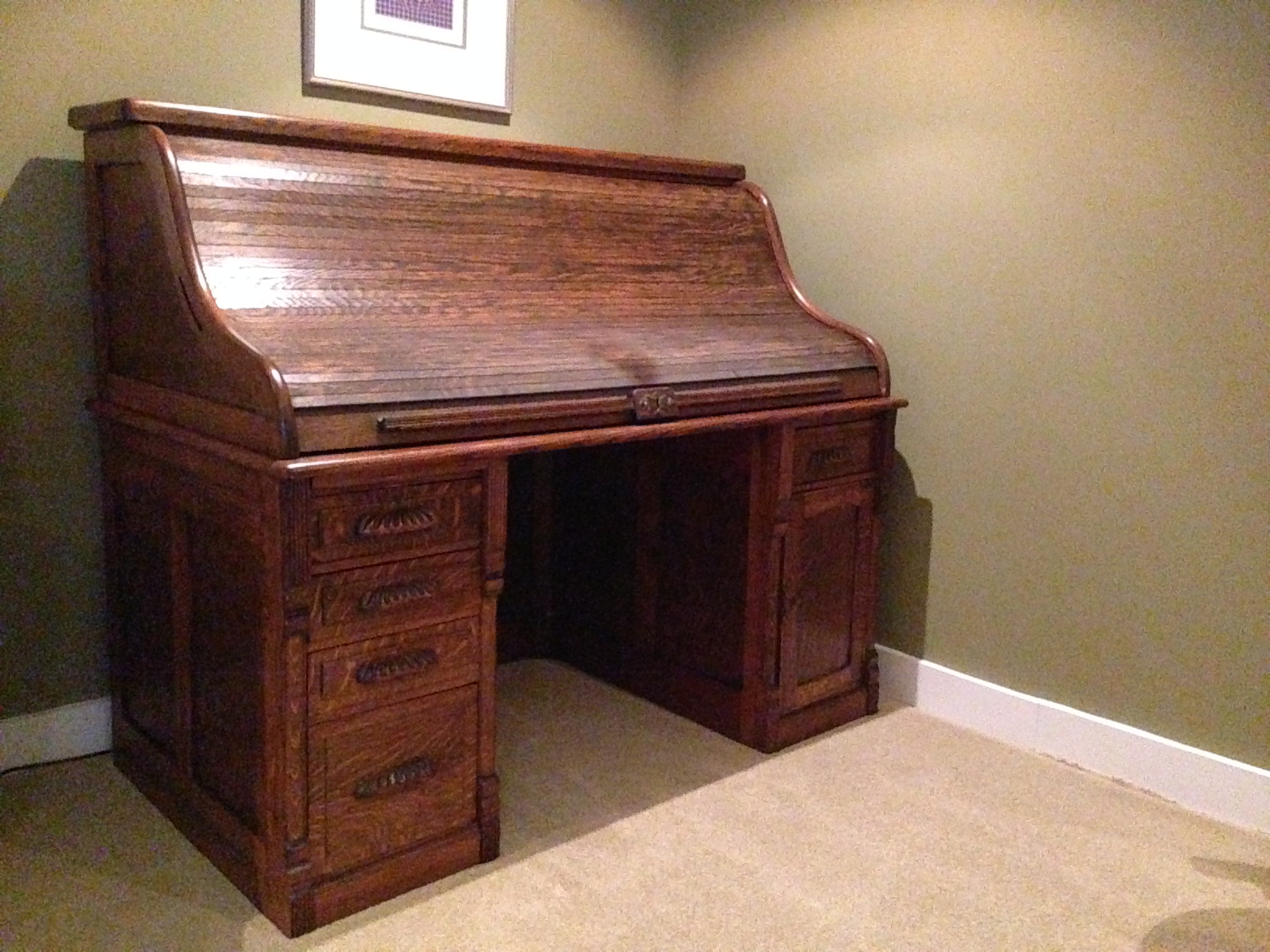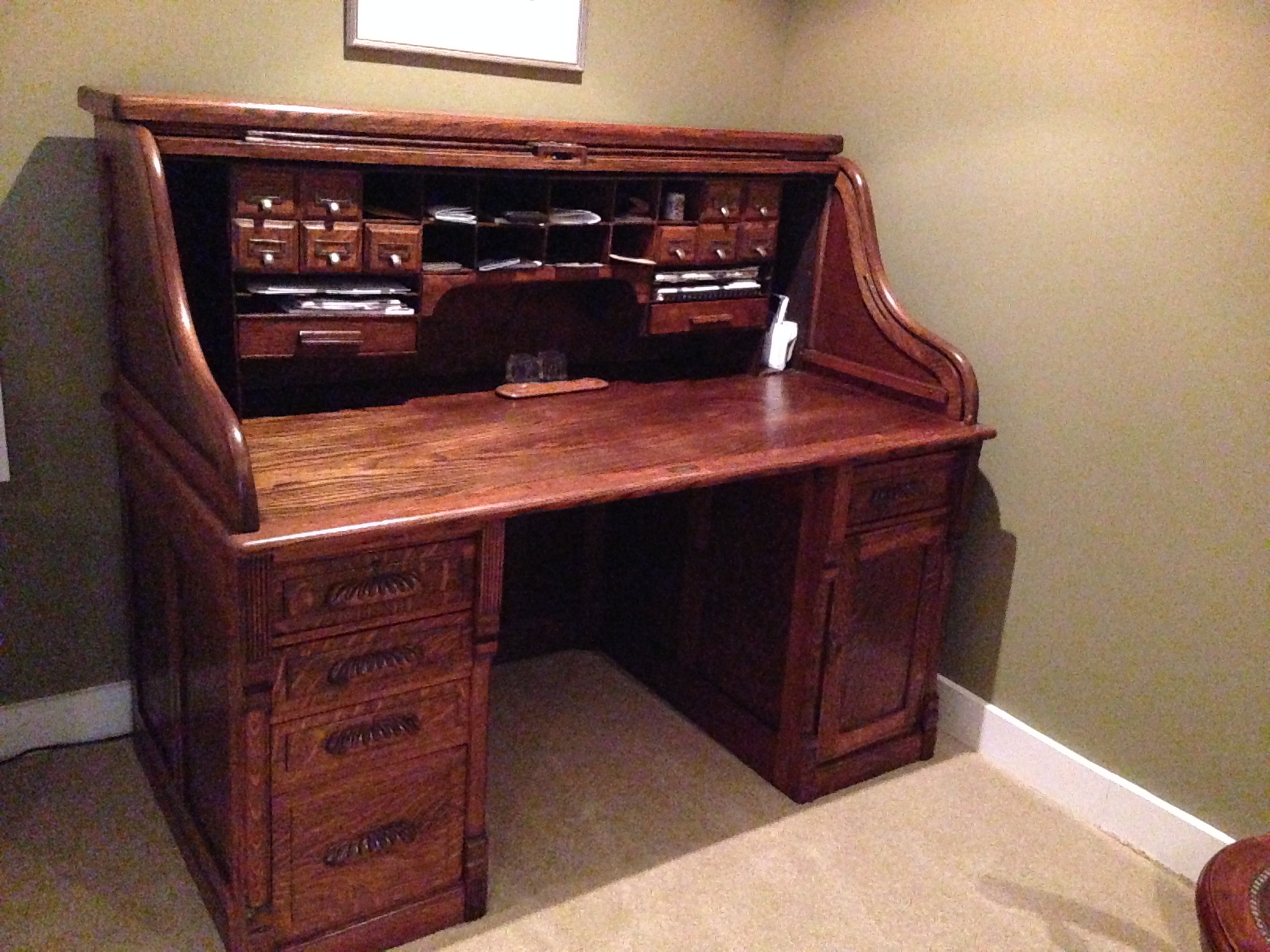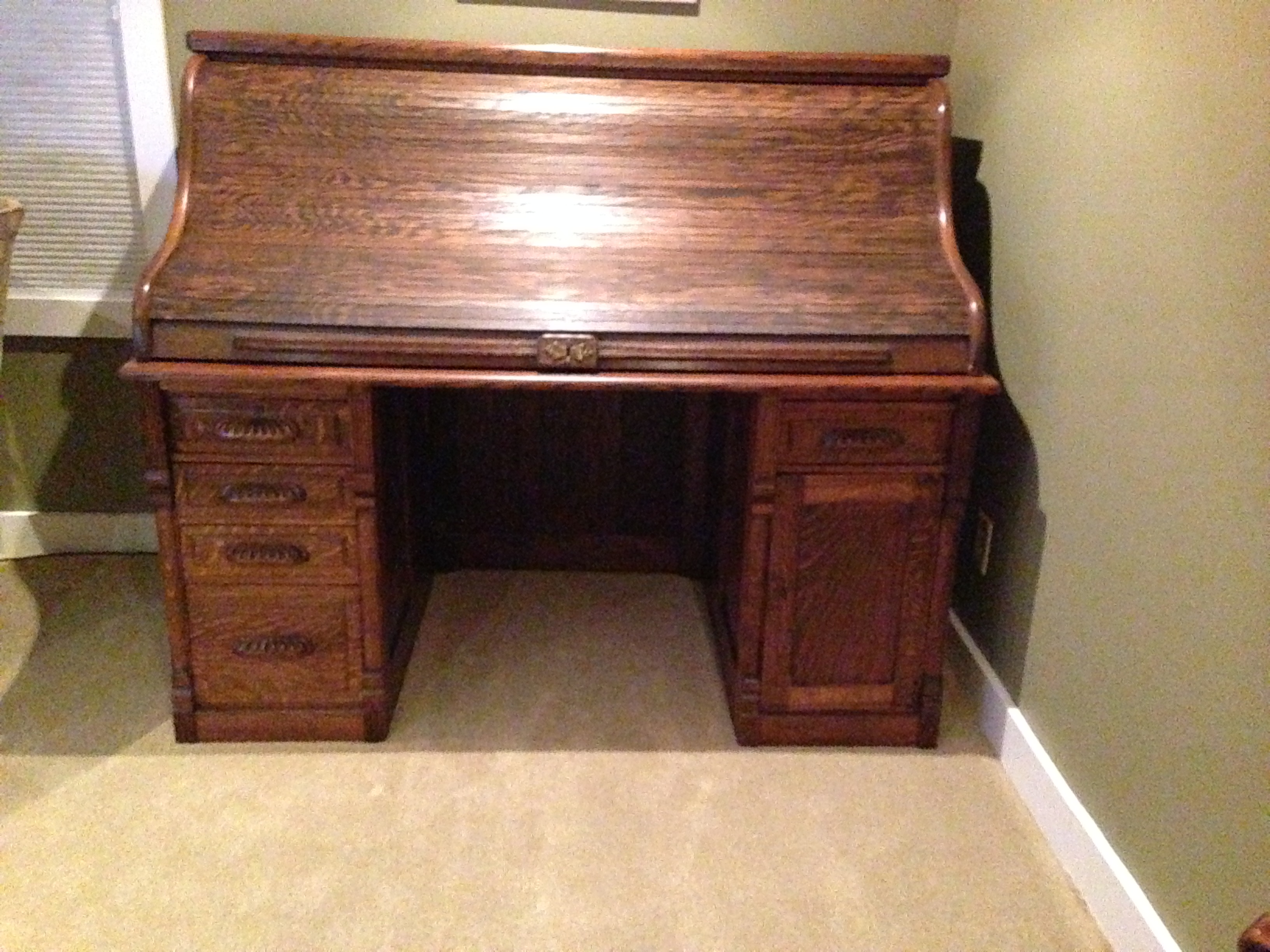 Oak roll top desk that I have owned for 42 years, purchased from a reputable antique dealer in Indianapolis for $500.00. Estimate date of manufacture 1880's.