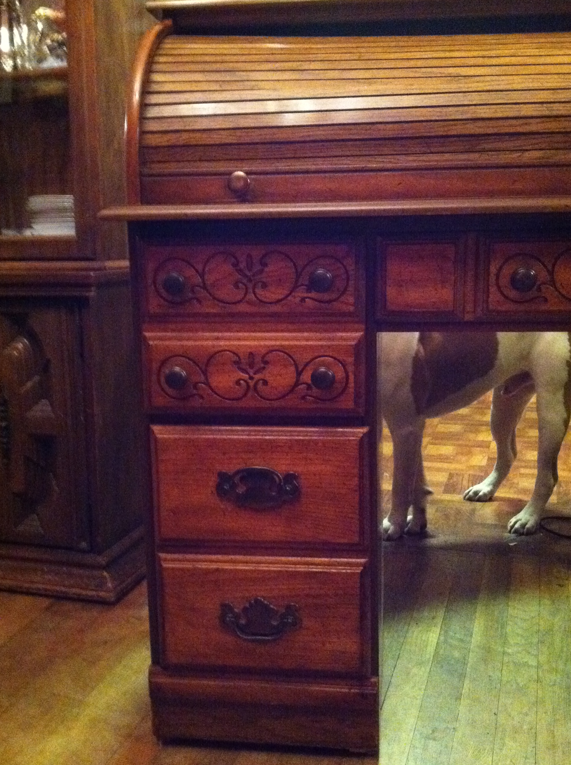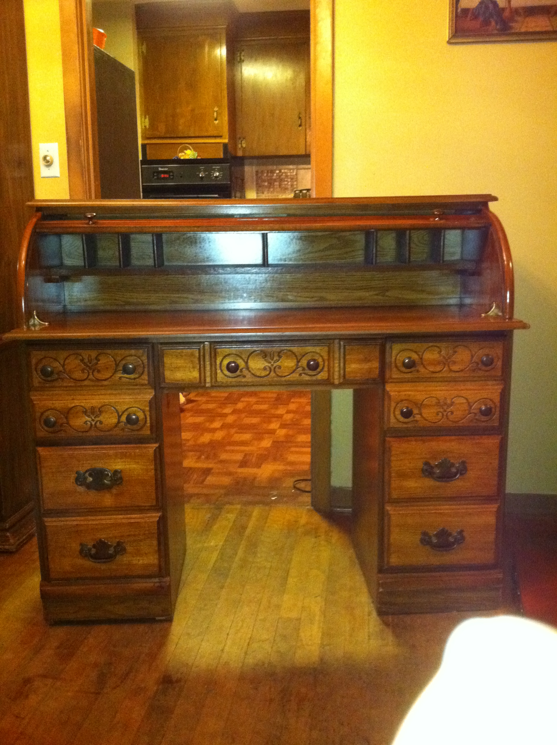 This desk was passed on to us when we bought thye house. My Husbands Grandfather bought this desk and used it often. My father in law tells us it was bought in the 30's or 40's. There are no markings that I have found however there are numbers stanped on the bottom of one of the drawers. We have the key that goes to the lock.