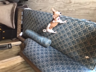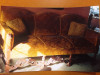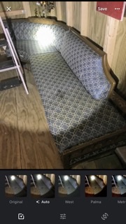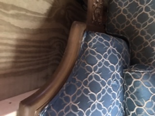 Hi have a antique a three-piece curved round sectional yes 180 and being a lounge the middle section curved and the other section a loveseat. It is blue with gold embroidering made of foam rubber the tag says and the ends have what appeared to be handcarved designs in them. It Has a peg legs on each section and the wood is a light brown not sure what kind. He's very heavy the ends are curved and the material is kind of stiff.Hi inherited it from my great grandmother it has no name on it as in who made it a long everyone tag losing what it's made out of and the care for it I really know nothing about it I would love to know more about this piece that I love so much