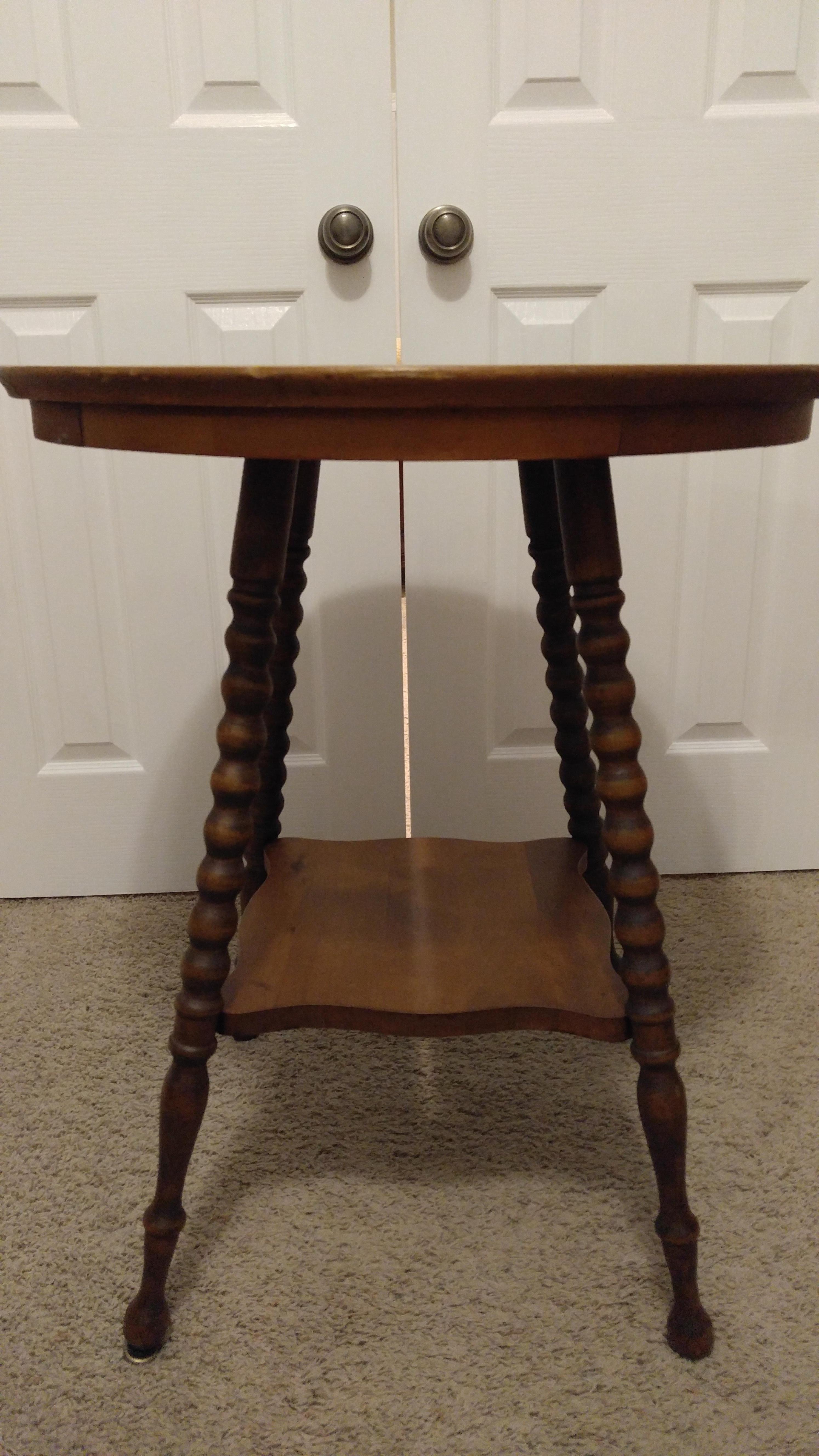 This is a round top antinque table with barley twist legs. It is in excellent condition. I purchased this table from my aunt & uncle about 25 years ago. I believe they were the original owners. It may have been "refinished" before I purchased it. It does have some type of stamp on the underside of the table top and the underside of the bottom shelf, but they are difficult to read.