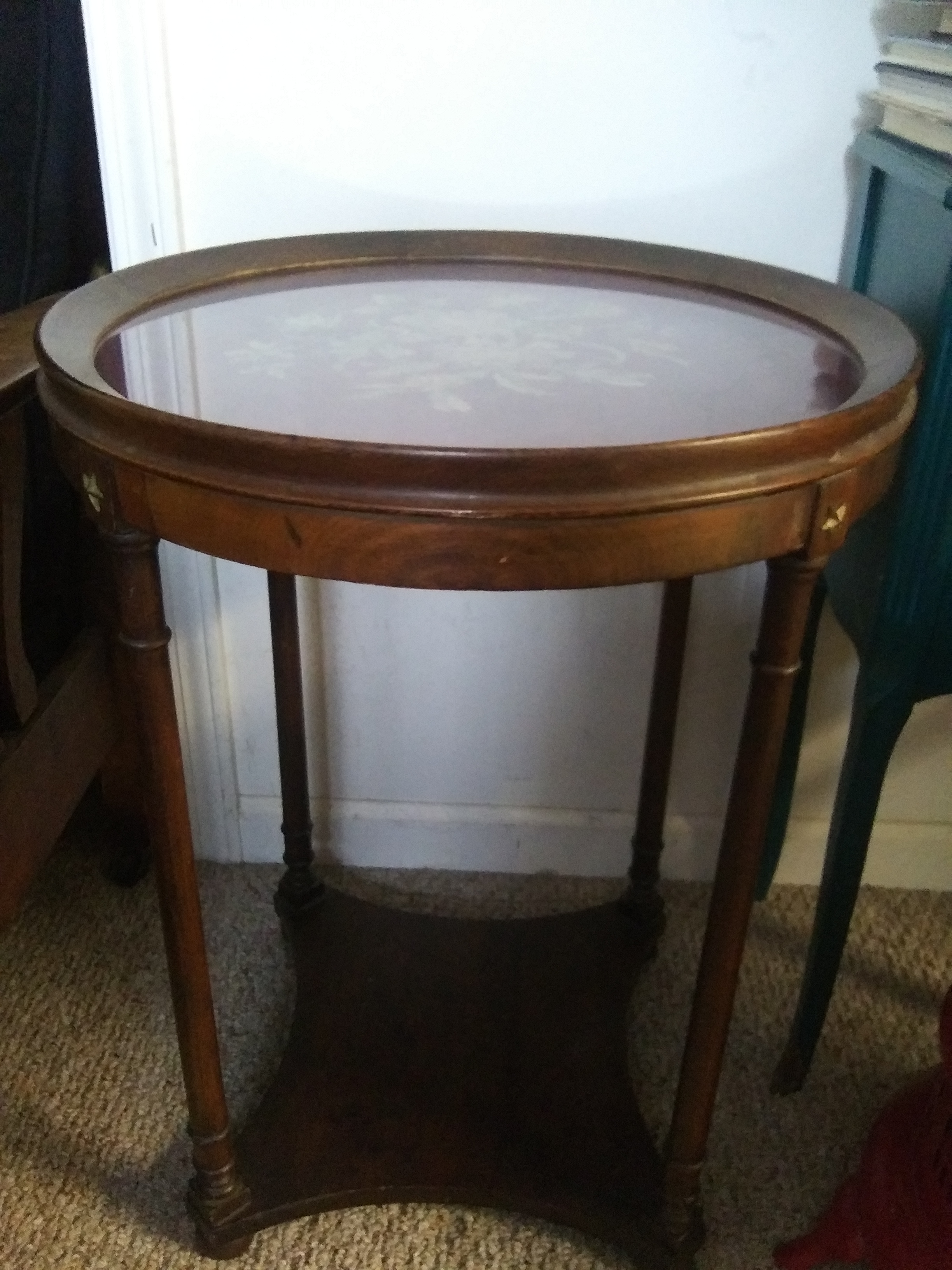 I have no idea the value of this table so am hoping to get some advice. It was purchased in a local Antique Shop approximately 30 years ago. I can't find anything online to compare & there are no manufacturing marks. I don't know the type of wood but it's dark reddish brown, so I'm guessing Mahogany, Cherry or Walnut. The top has an enclosed glass over a beautiful handmade (I assume) tapestry. There are four legs between here & the lower surface which is held barely above the floor with four small ball shaped feet. At the top of each leg a tiny gold color wooden star is attached. Everyone comments about how unusual & pretty it is but no one knows what it might be worth. I need to sell it for financial reasons, so will appreciate any knowledge or even guesses on the value. Local pick-up sale only - located in Triad area of NC.