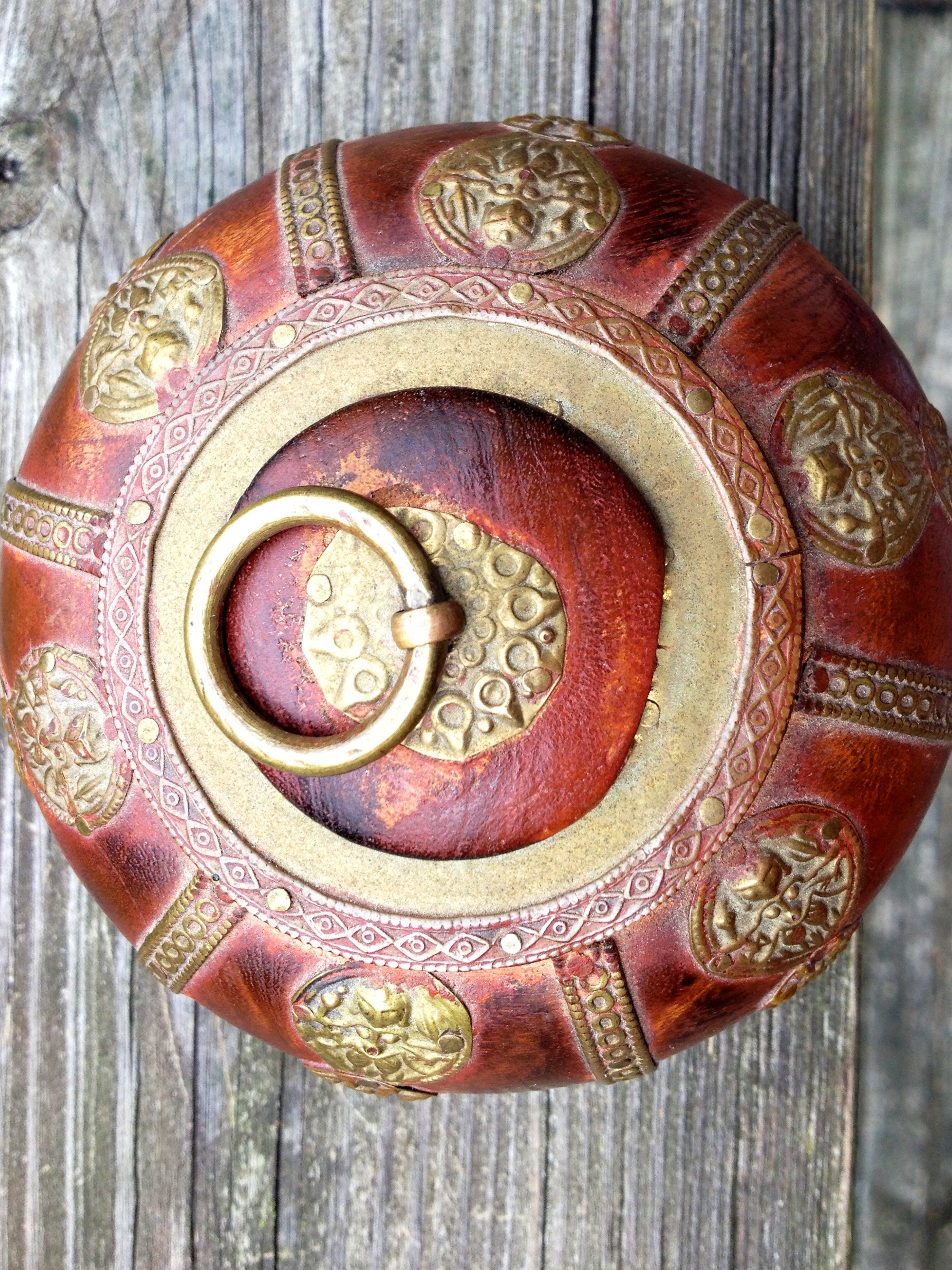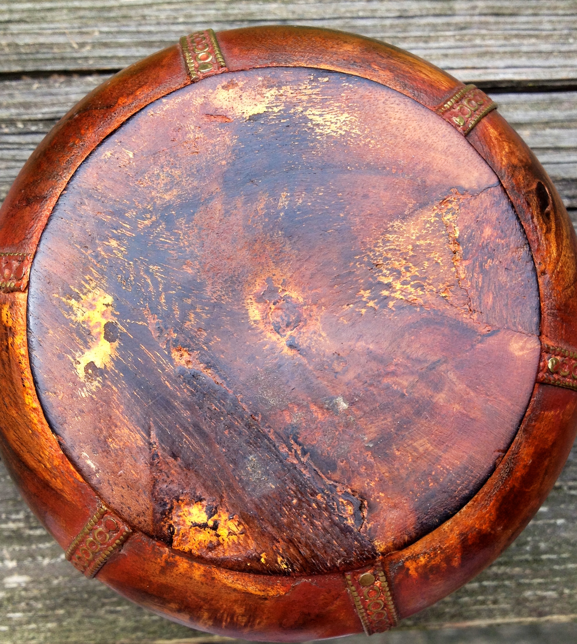 I have a wooden snuff box with brass inlays. It measures 4in at the widest part and stands 2 1/2 in tall. It is very unique looking.