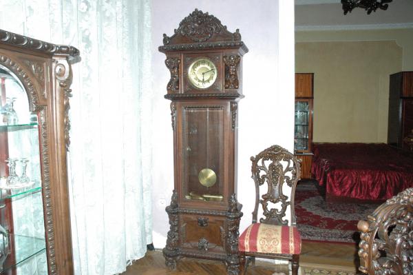 The set includes a round table with expandable leaf, 10 chairs, china cabinet, large buffet with hutch, small buffet, brandfather clock.