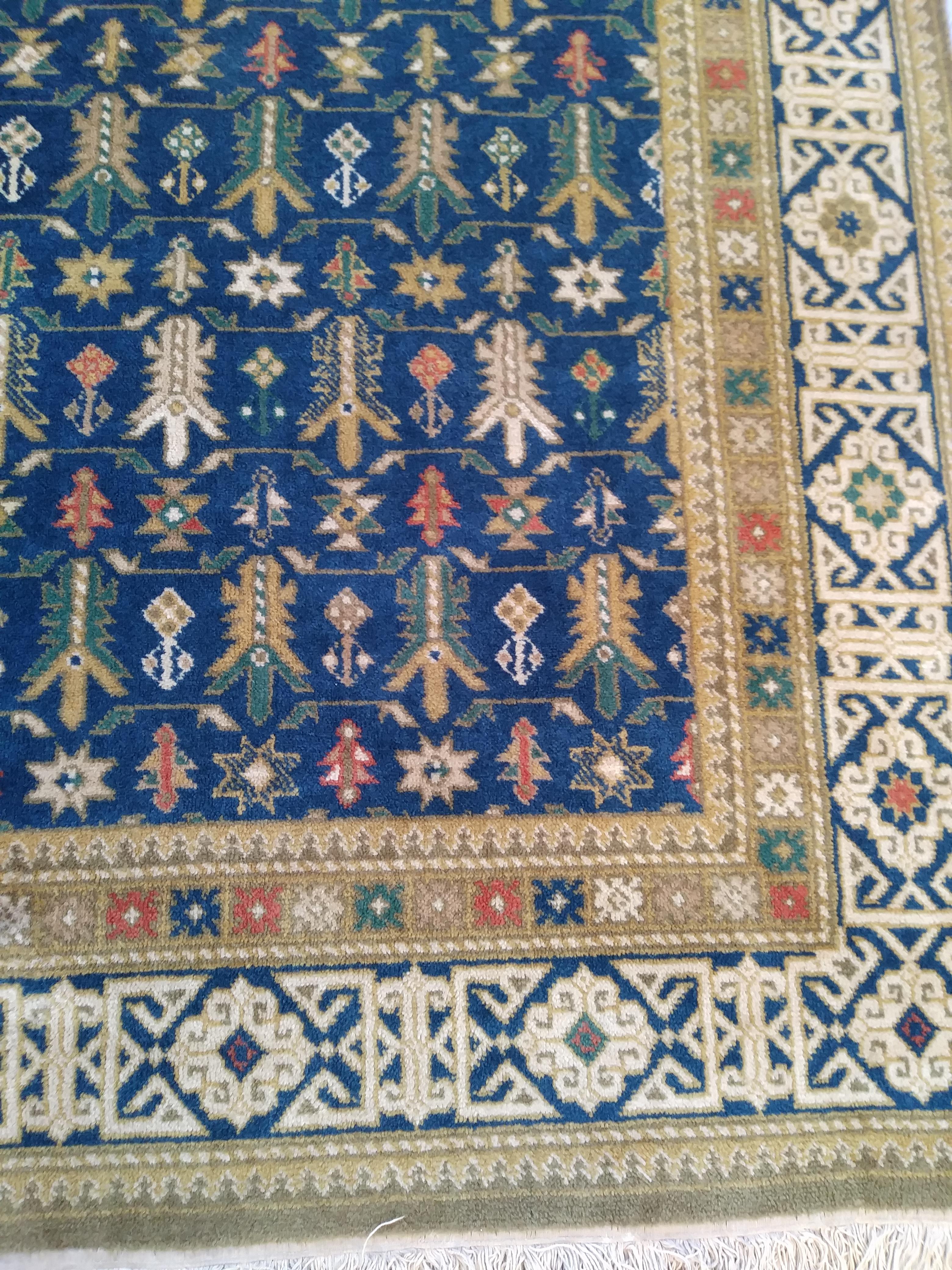I purchased this rug from a garage sale. The tag on the back states this. 5.7x8.6. Color blue abistan 234. Made in Holland Made expressilly for hayim & co. Inc 295 5th ave new york n.y. 10016 R.N. 16169 100% Virgin wool This is in really good condition the color is very vibrant. There is stains on the back but they dont show on other side one of them shows a little.