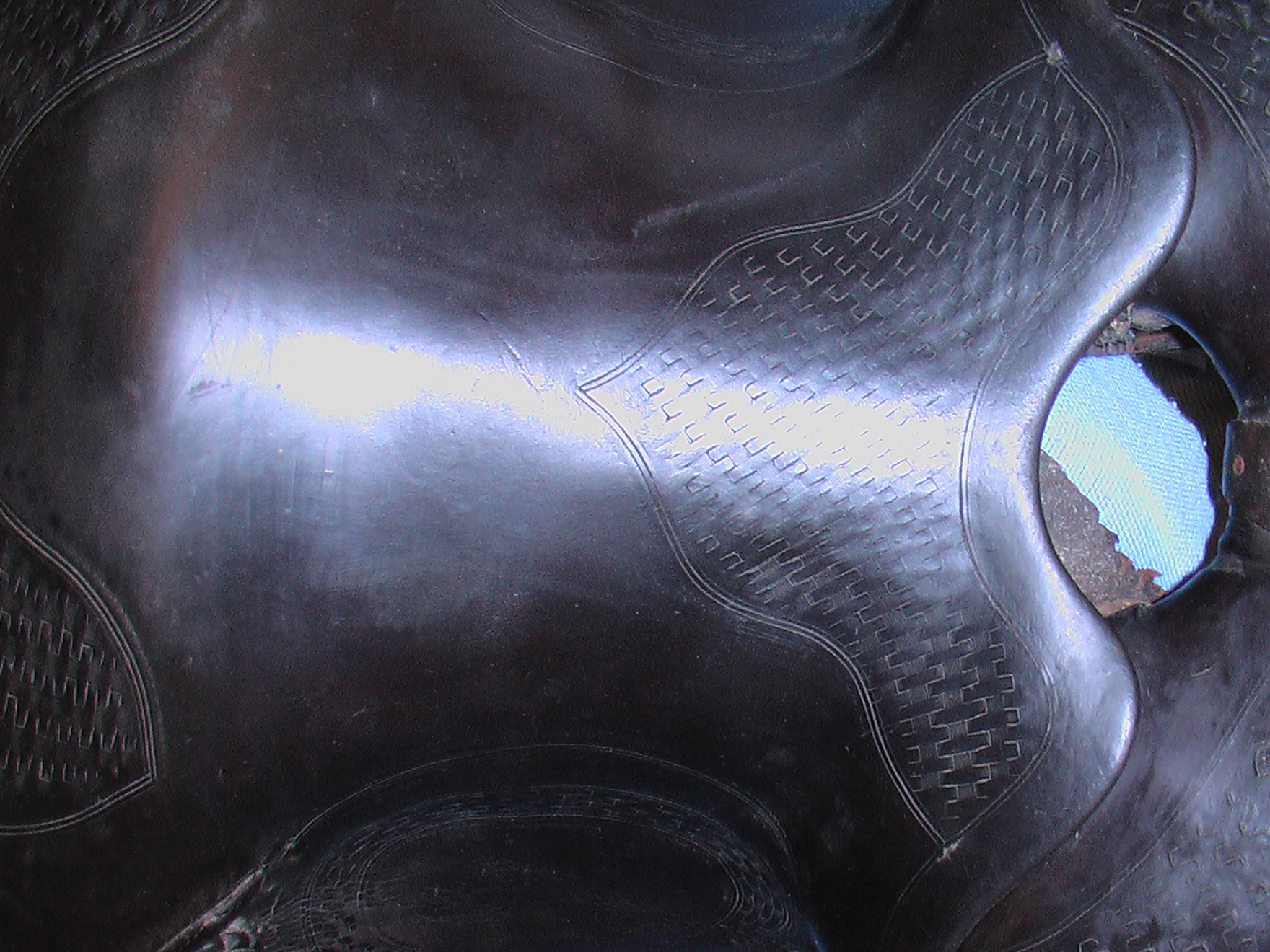 This saddle has not been well cared for, and I'm sure was used a lot. It is not a parade style saddle, it is more of a working mans saddle. Two conchos are missing on one side, and the fleece underneath is almost all gone.The tooling pattern is a simple weave. I am pretty sure I have the stirups out in the tack room.