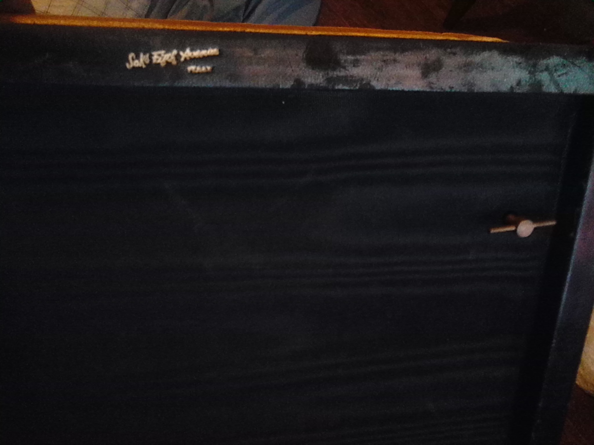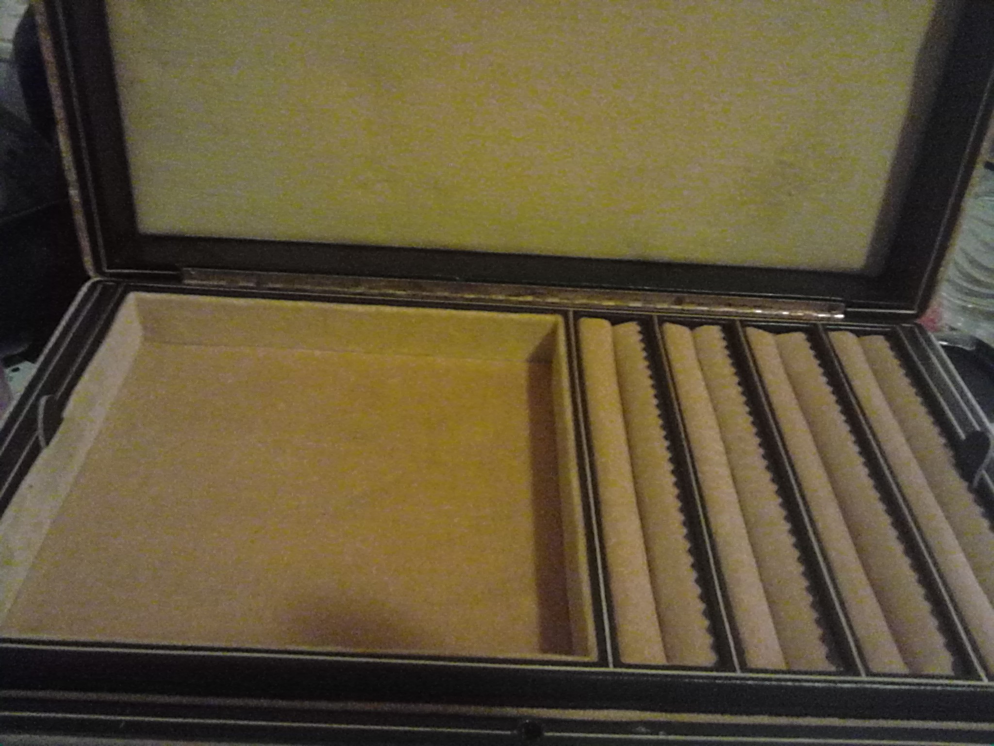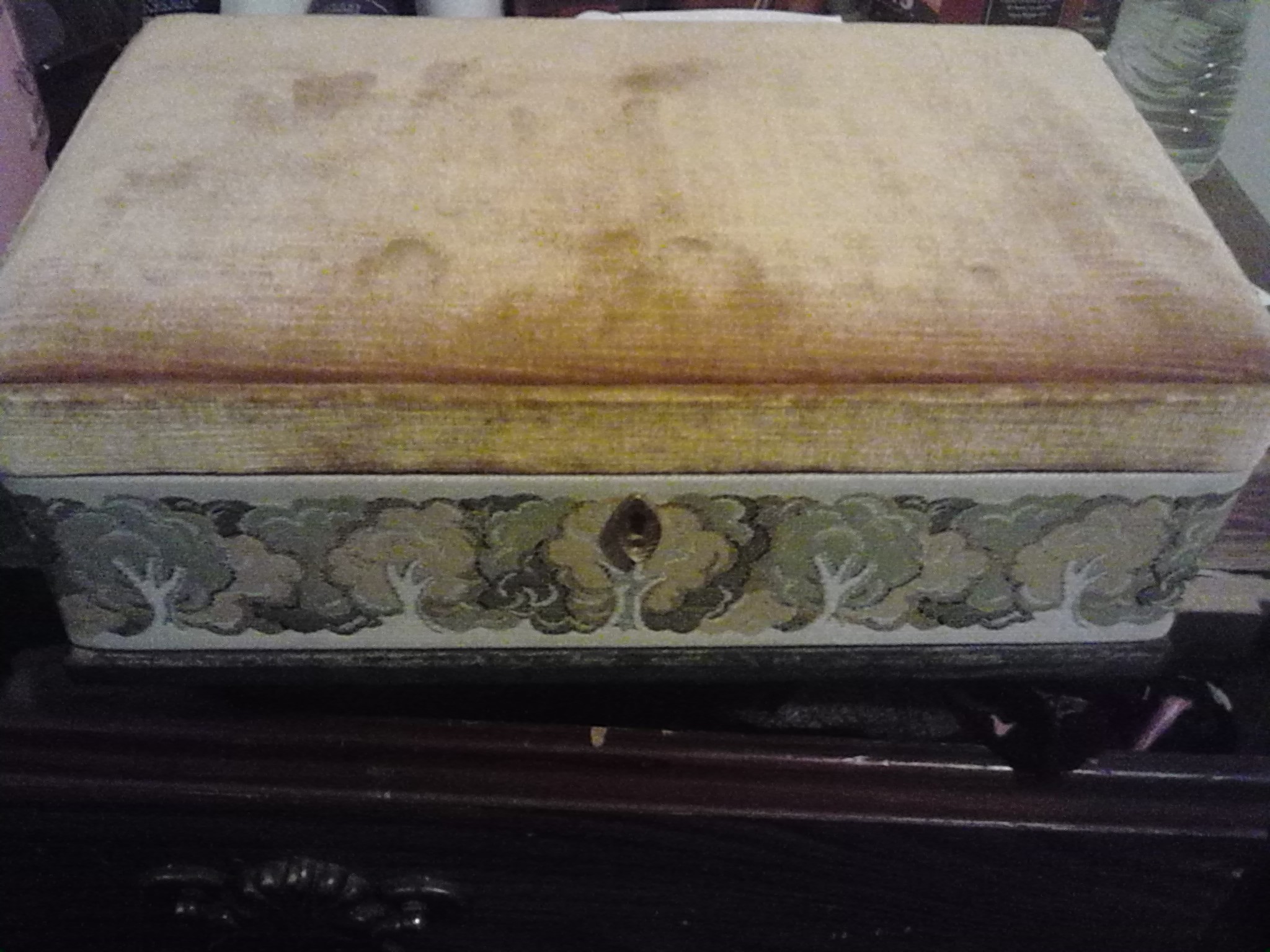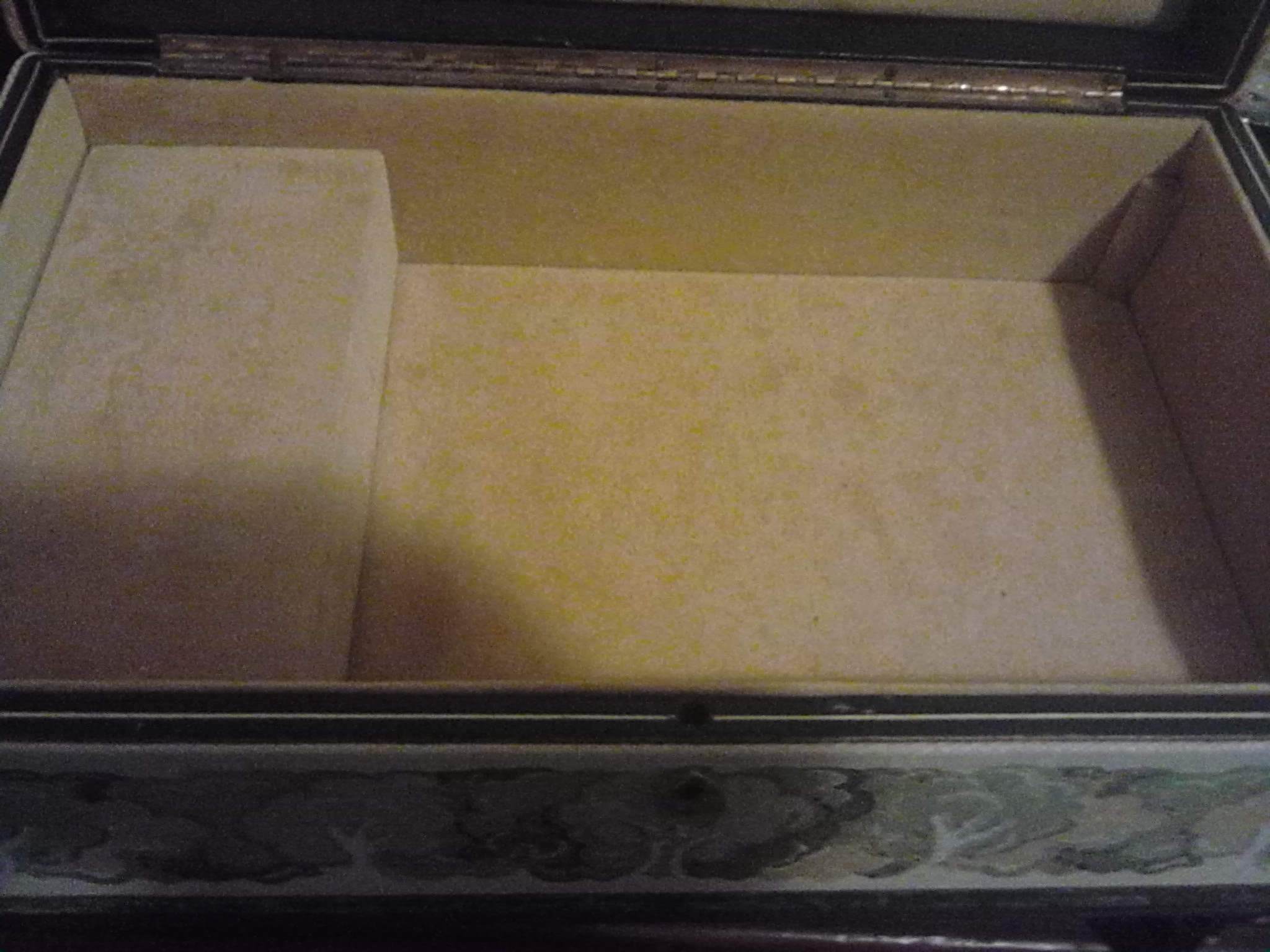 It's a gold silky material on to opens up and plays music via wind up has flower embroidery on bottom half to shelf has four columns for rings and that lifts out for bigger pieces. Has Saks signature on bottom