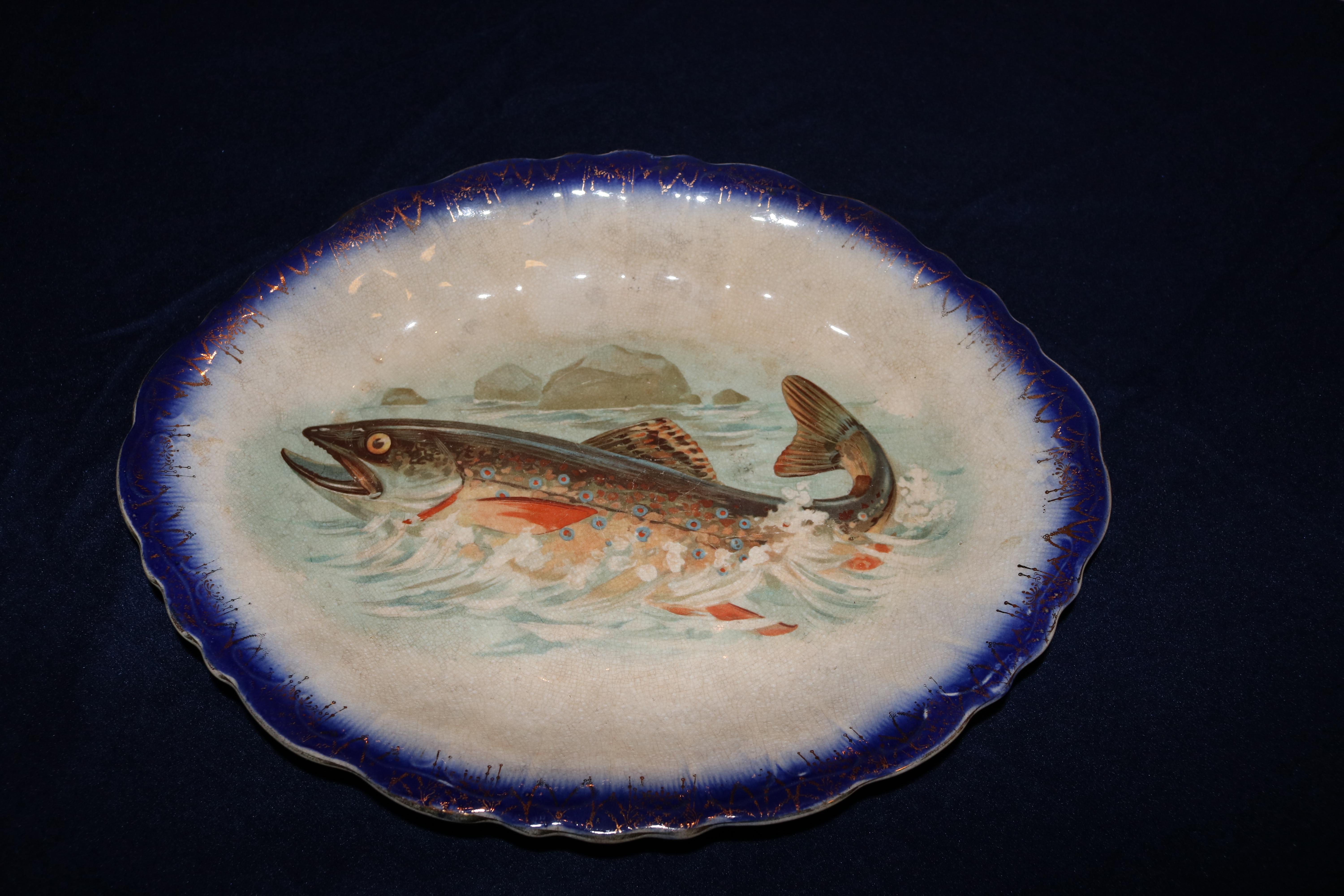 I have 13 3/4" wide by 10 1/2" high platter with cobalt blue trim and gold accents with a swimming salmon...I saw a set with a different fish (trout I think) in green with the same gold pattern and they said it was Limoges (French)...but there are no markings whatsoever on this plate - so, looking for some help...I am looking to sell this piece so ID and a price would be great! It is a heavy plate...like pottery but not as thick as pottery.