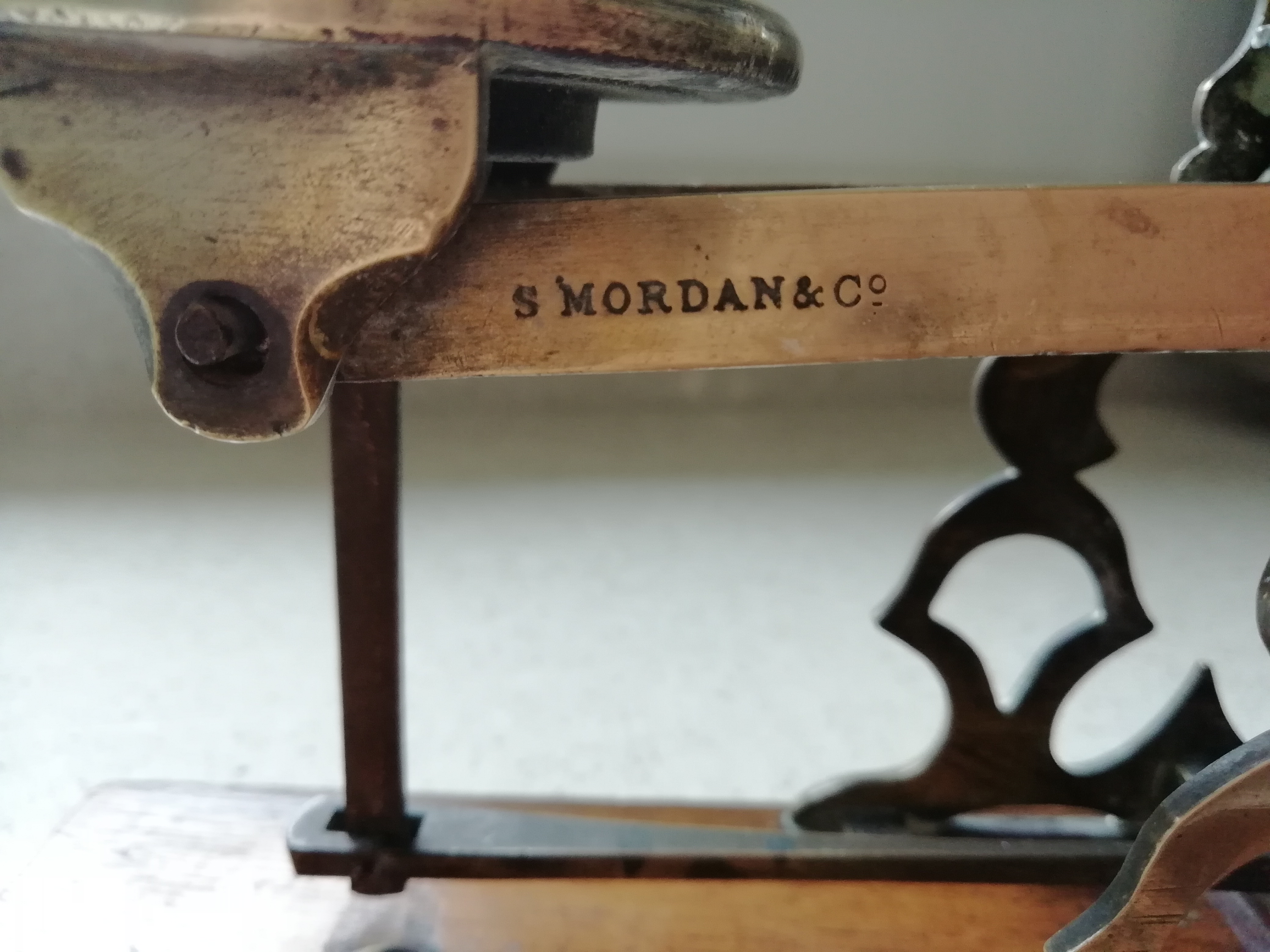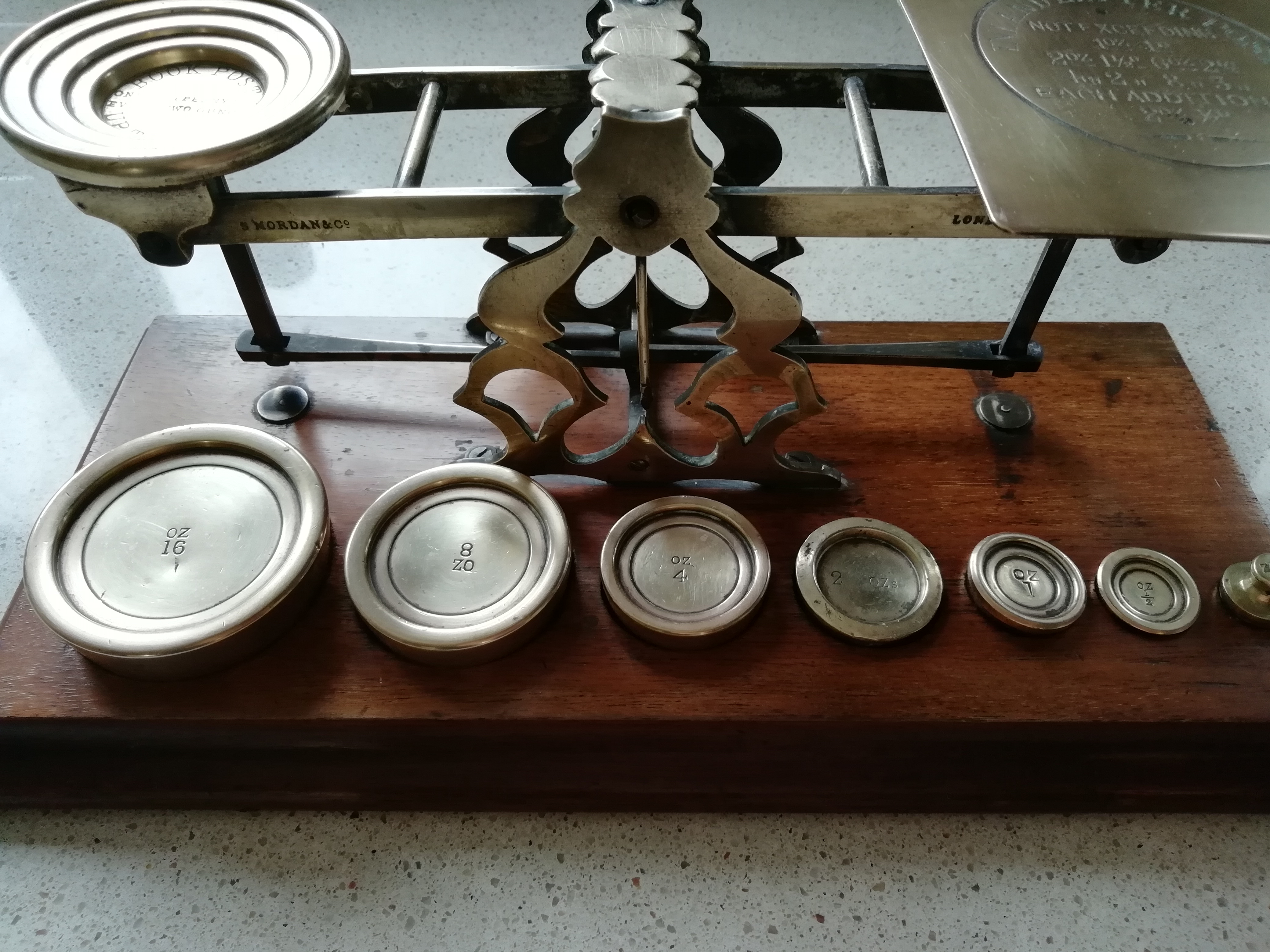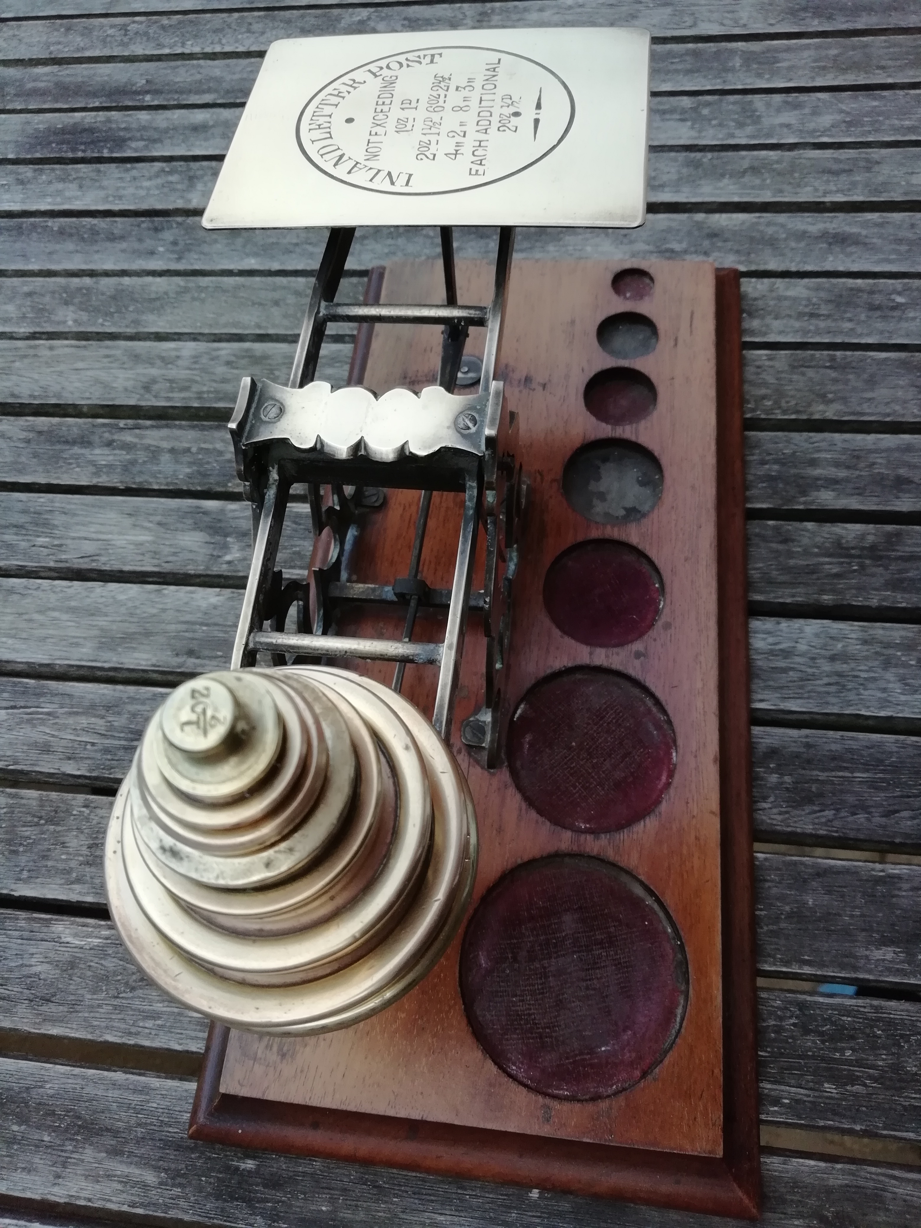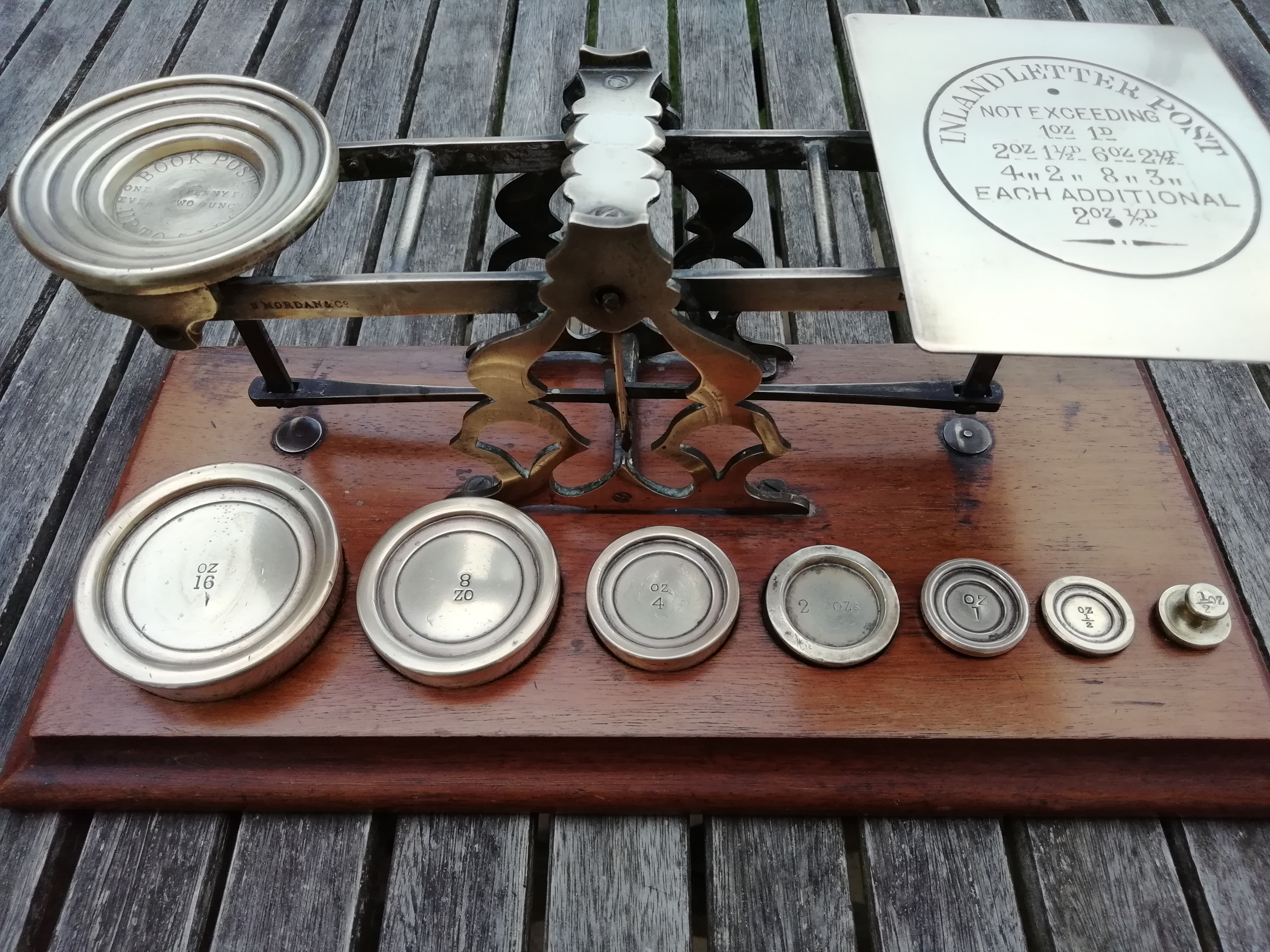 A set of wooden and brass letter scales by S.Mordan&Co. It houses a set of 7 weights ranging from 1/2 an ounce to 16 ounces. The letter pan is engraved with the postage rates for 'Inland Letter Post'. Dimensions are 31.5 x 15cm.