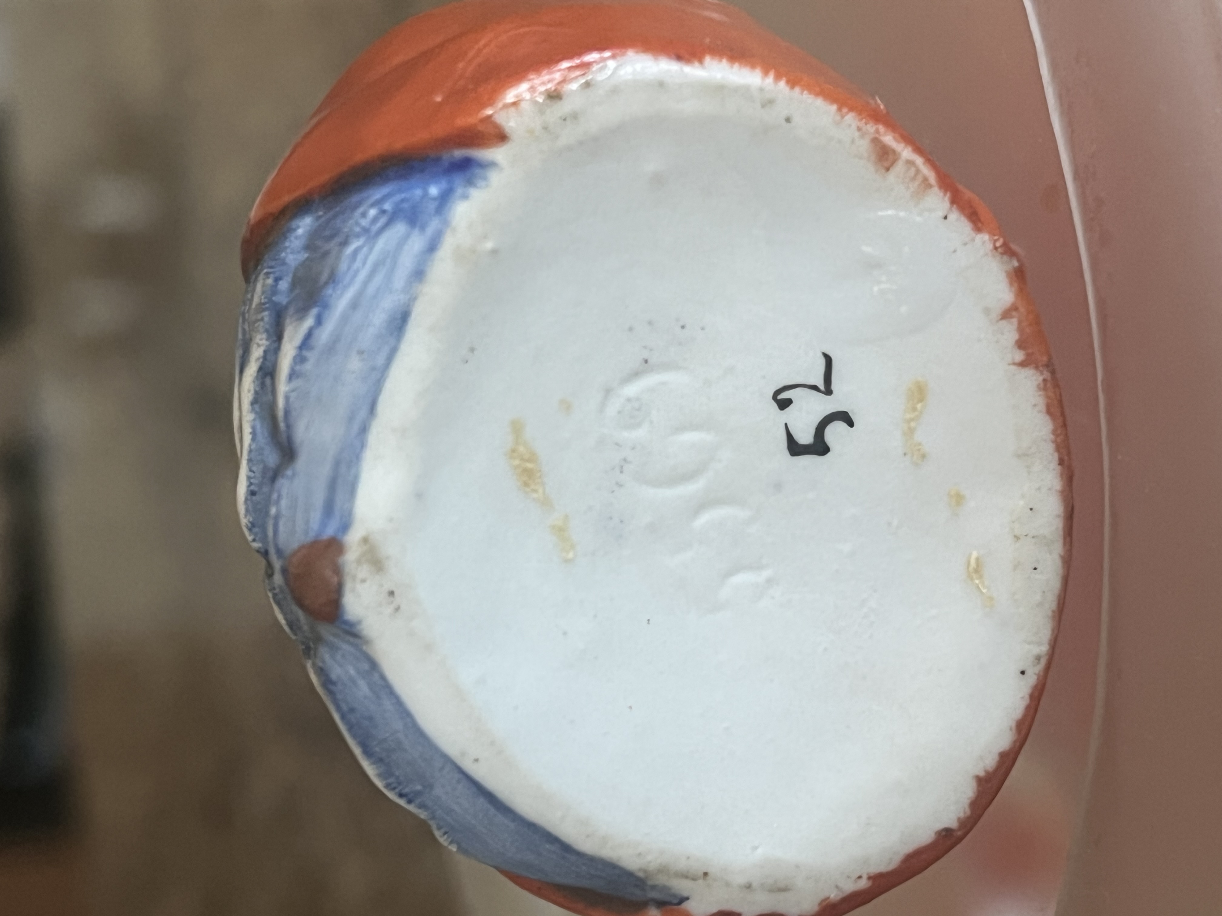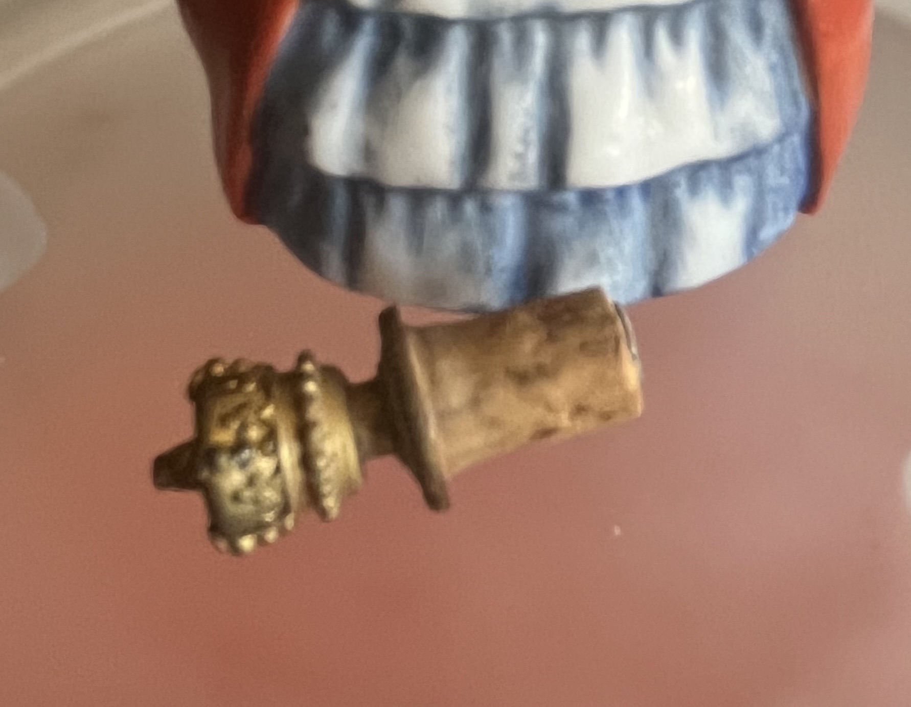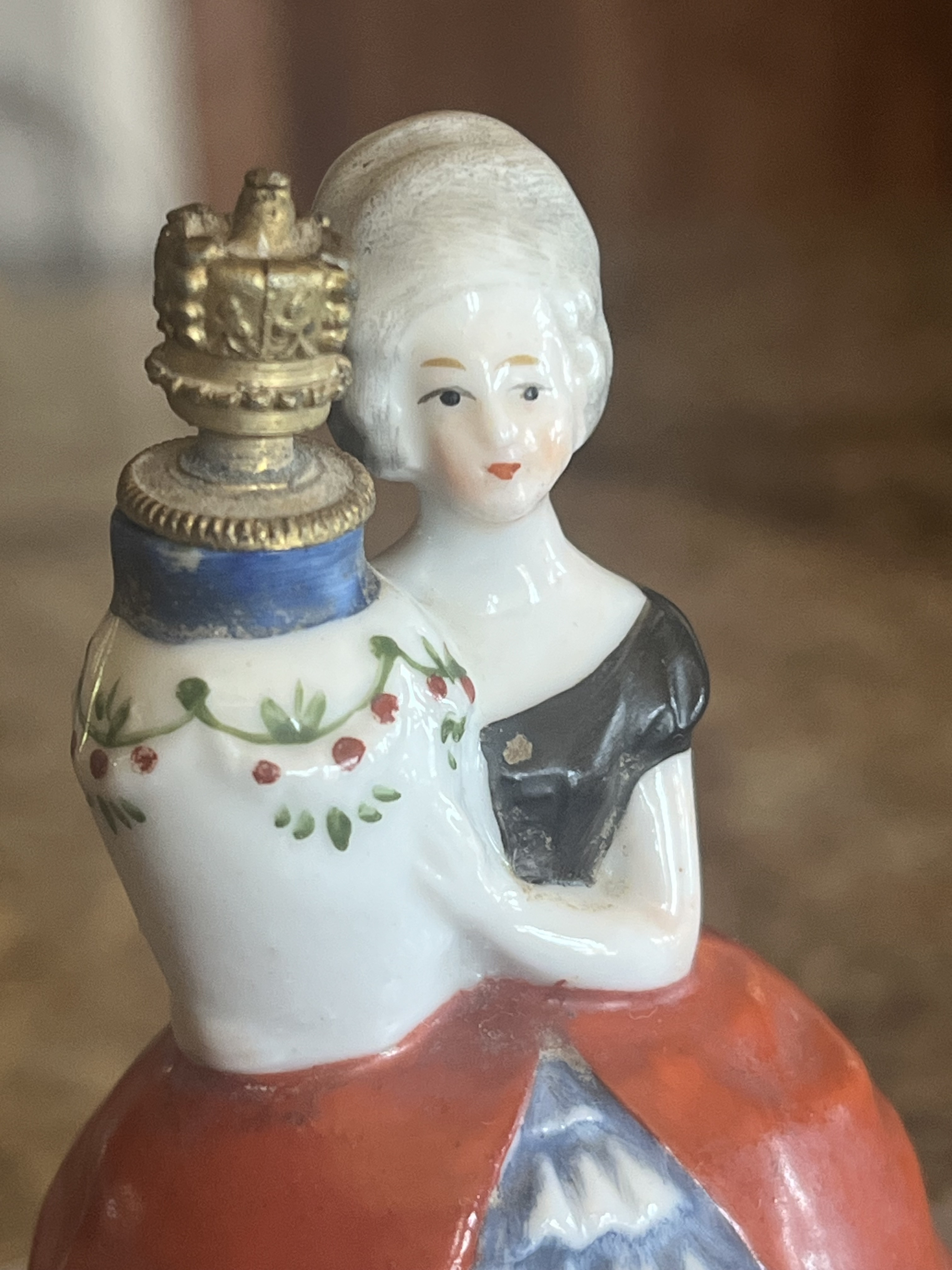Physical Description: This charming antique scent bottle is crafted from porcelain, featuring a delightful figure of a woman in a colorful dress. The dimensions are approximately 3.5 inches tall. The bottle is adorned with intricate hand-painted details, including floral motifs and a striking color palette of red, blue, and white. Notably, it has a gold-toned crown-shaped stopper, adding to its allure. The base is marked with '5569' in the porcelain and '52' in black ink.