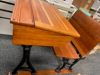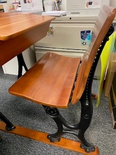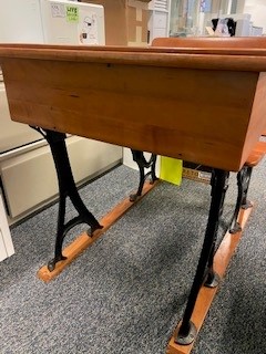 Antique school desk with inkwell. Made of solid wood and iron legs. Foldable tabletop and seat.