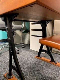 This desk was purchased at an auction around 15 years ago. It has been refurbished twice. The only marking are on the iron legs. Otherwise, there are no additional indications about this desk.