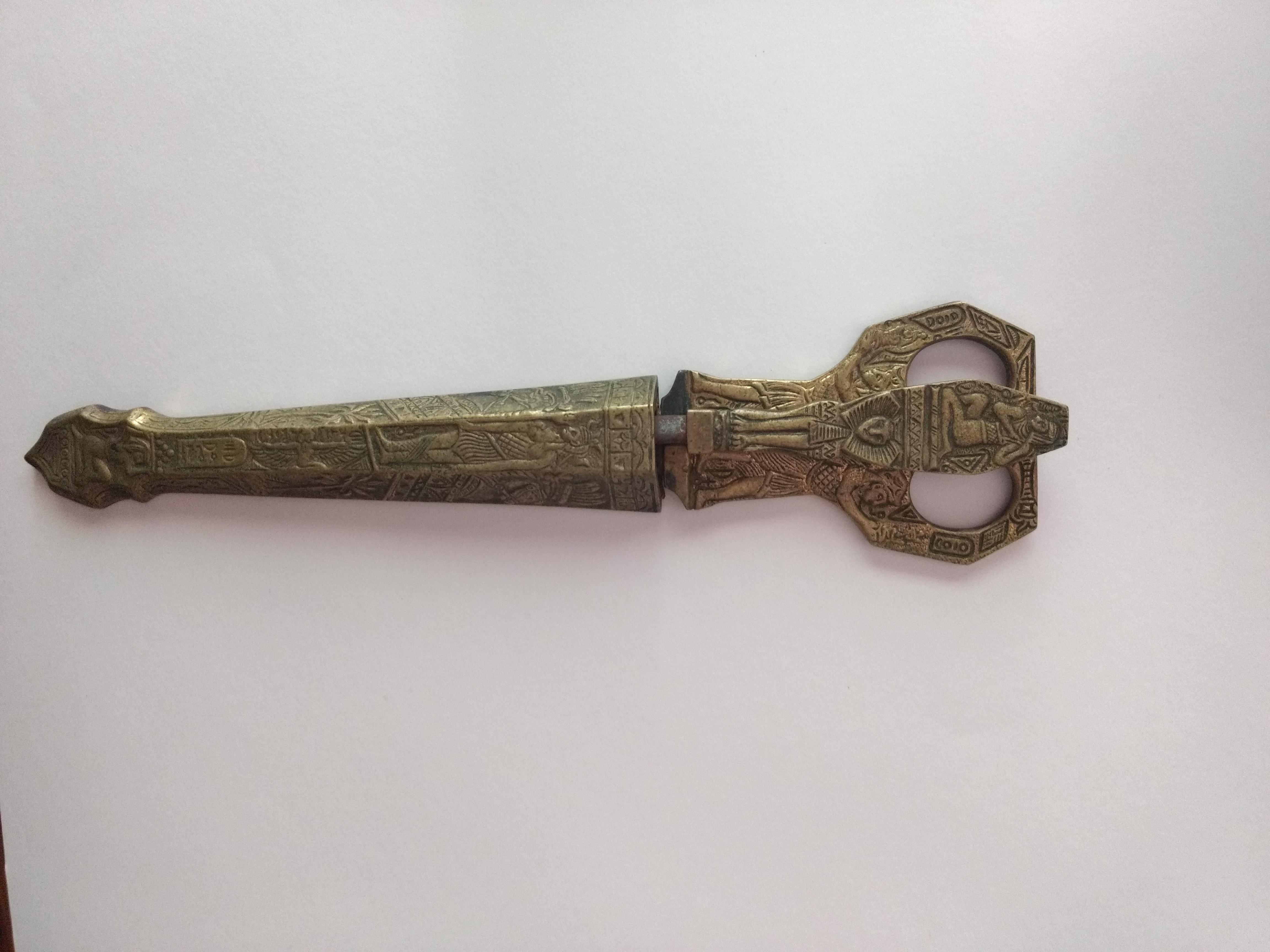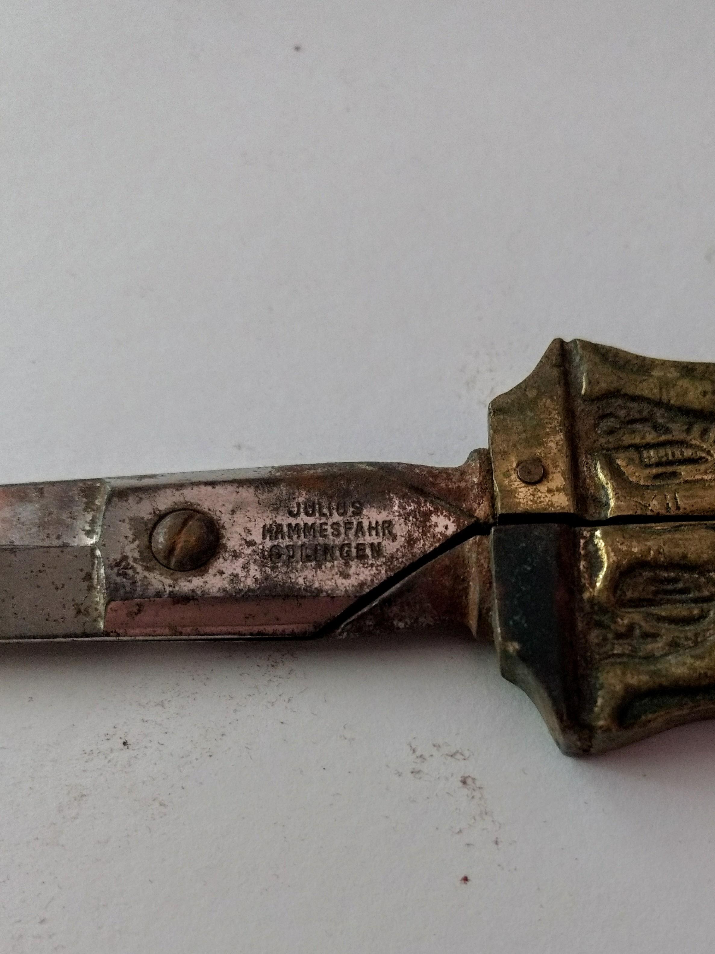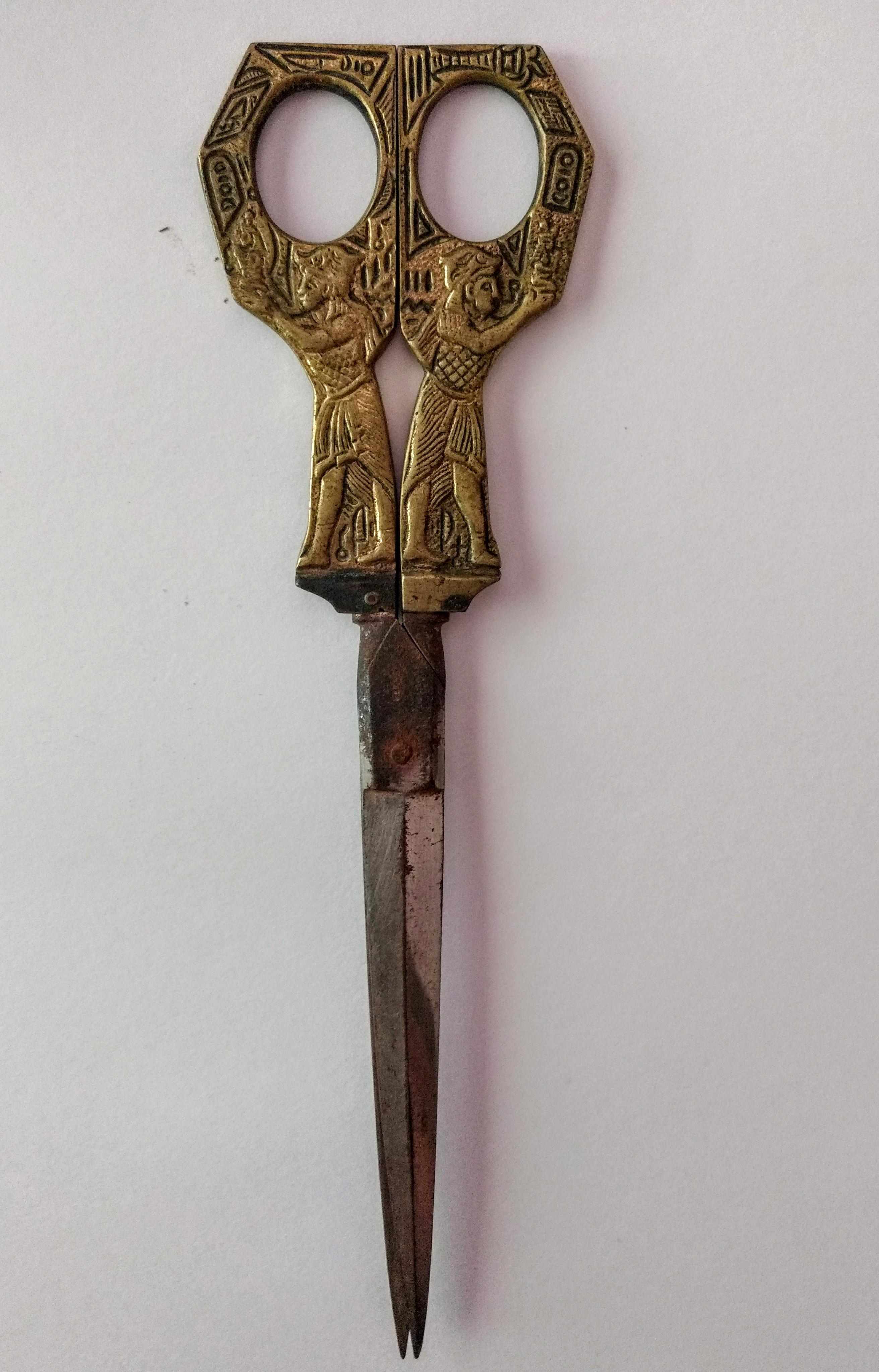 They are brass with a steel blade. Covered in ancient Egypt styled decorations. They are marked Germany and Julius Hammesfahr