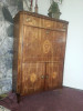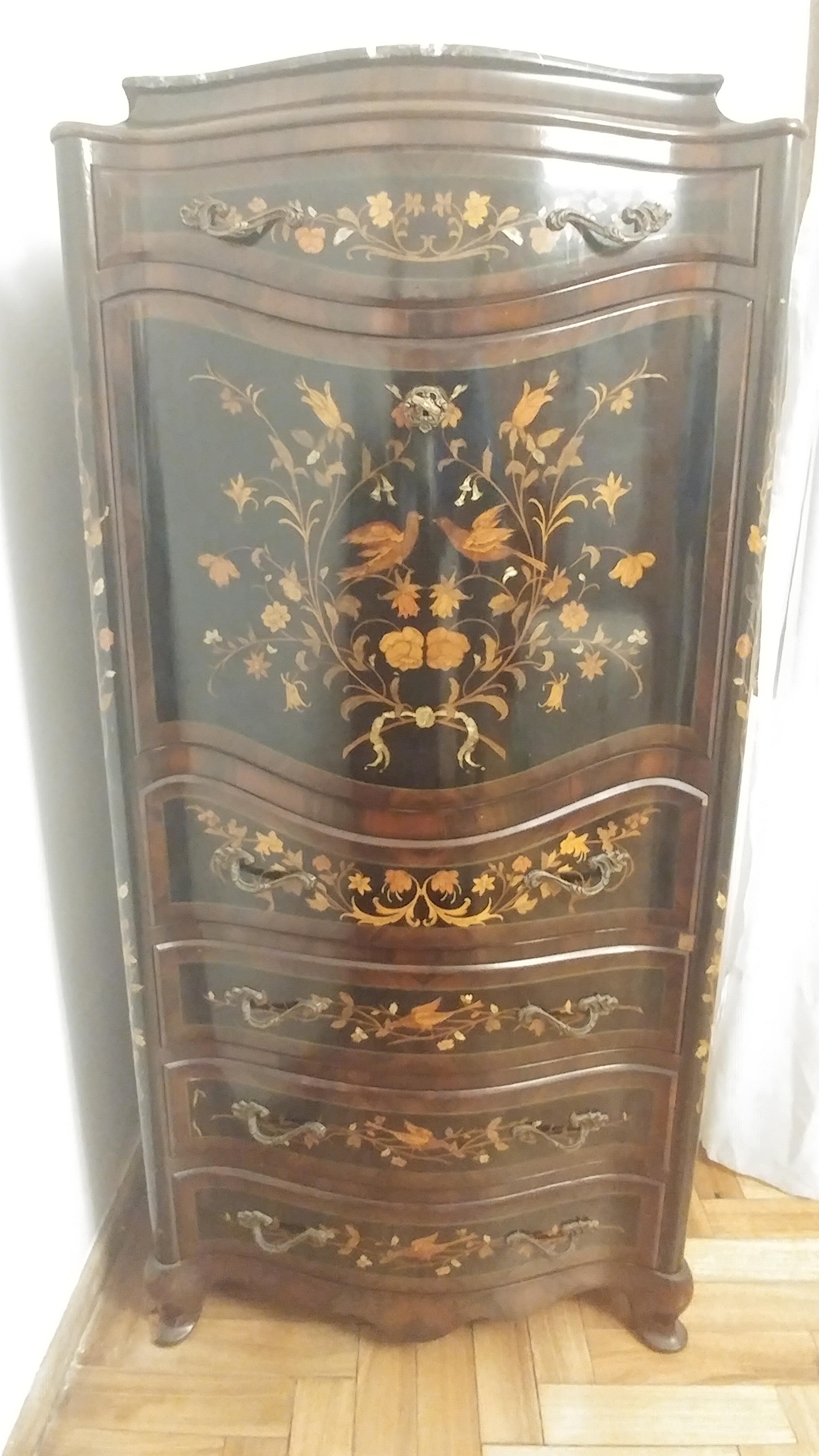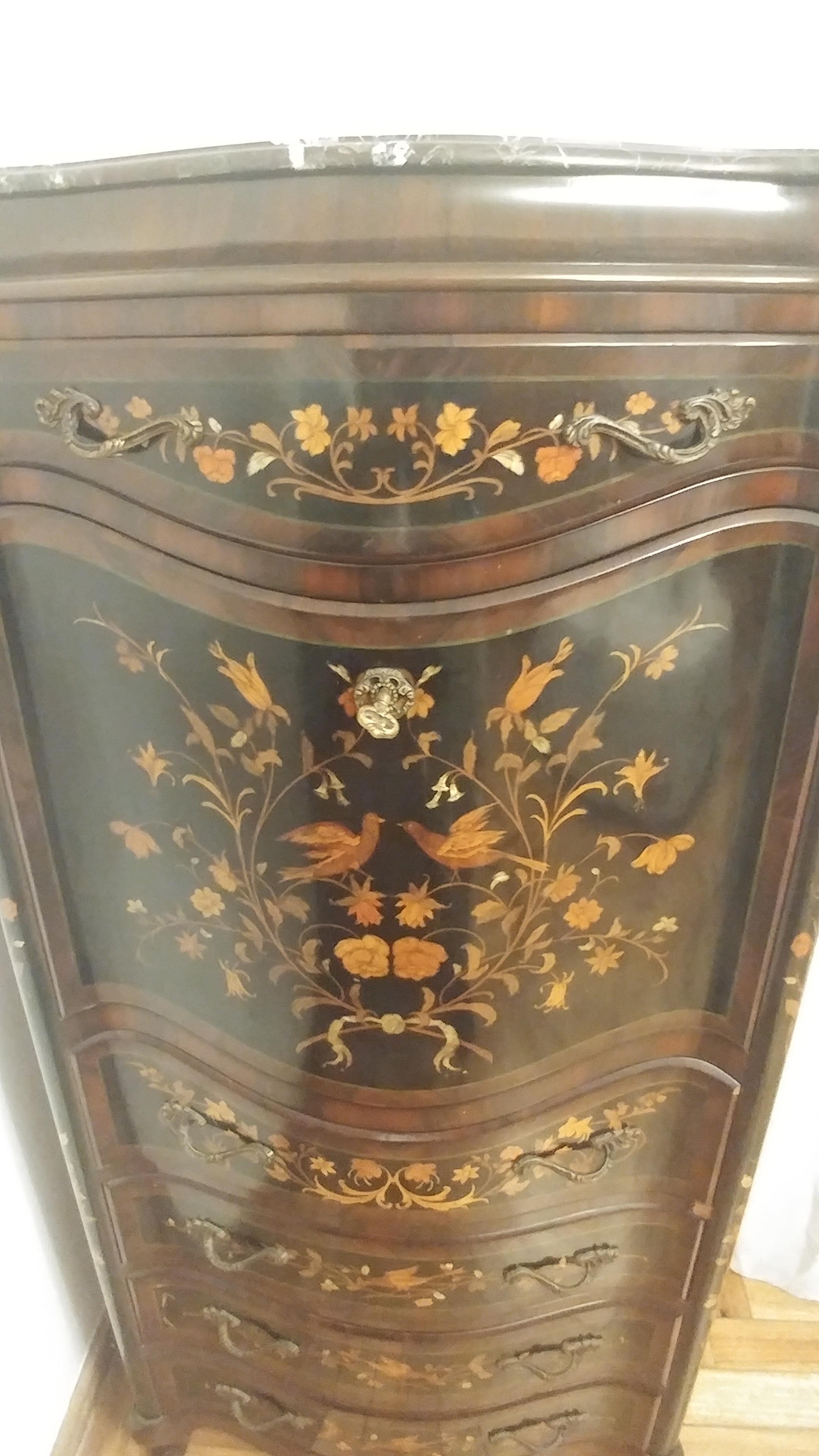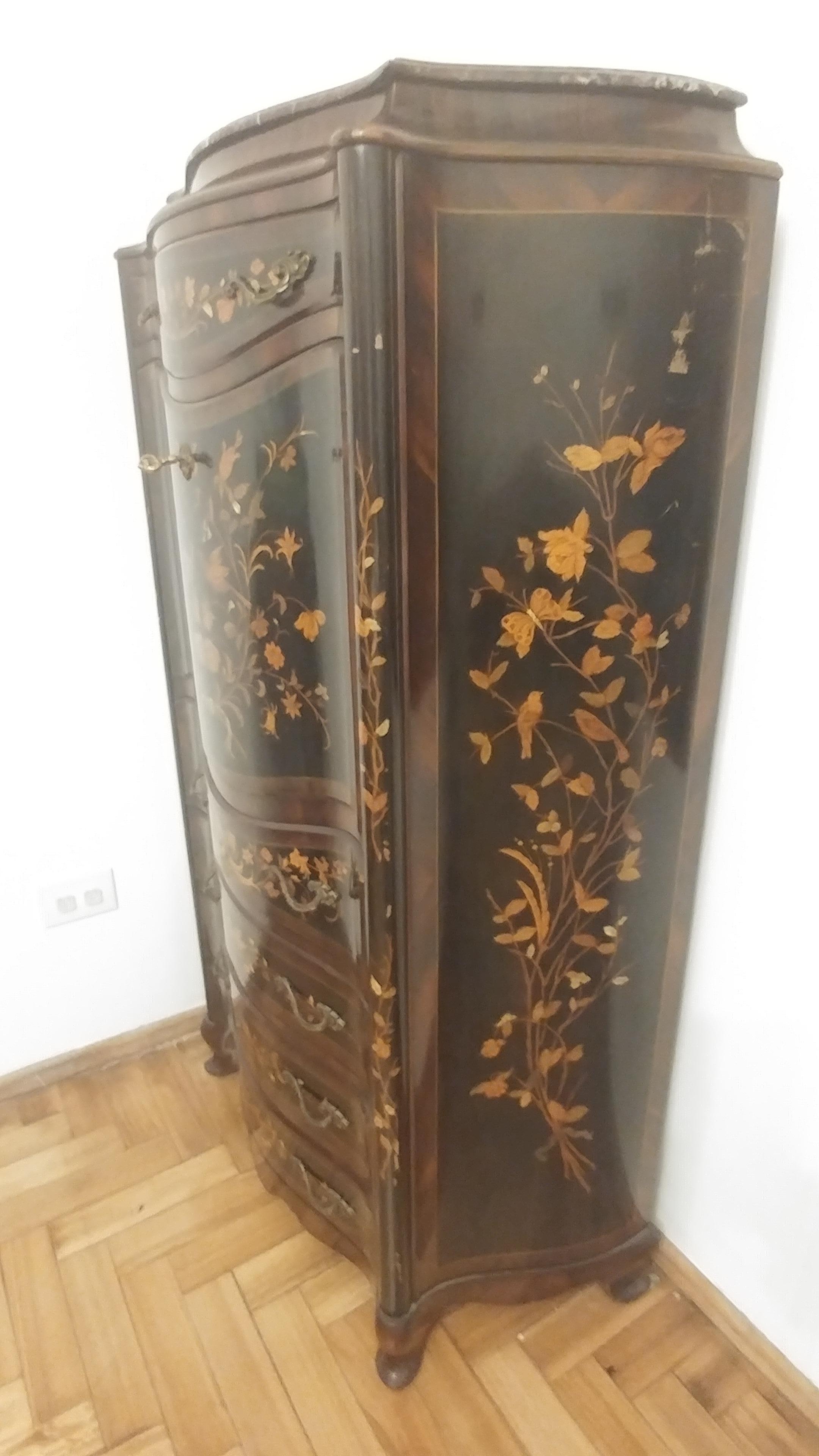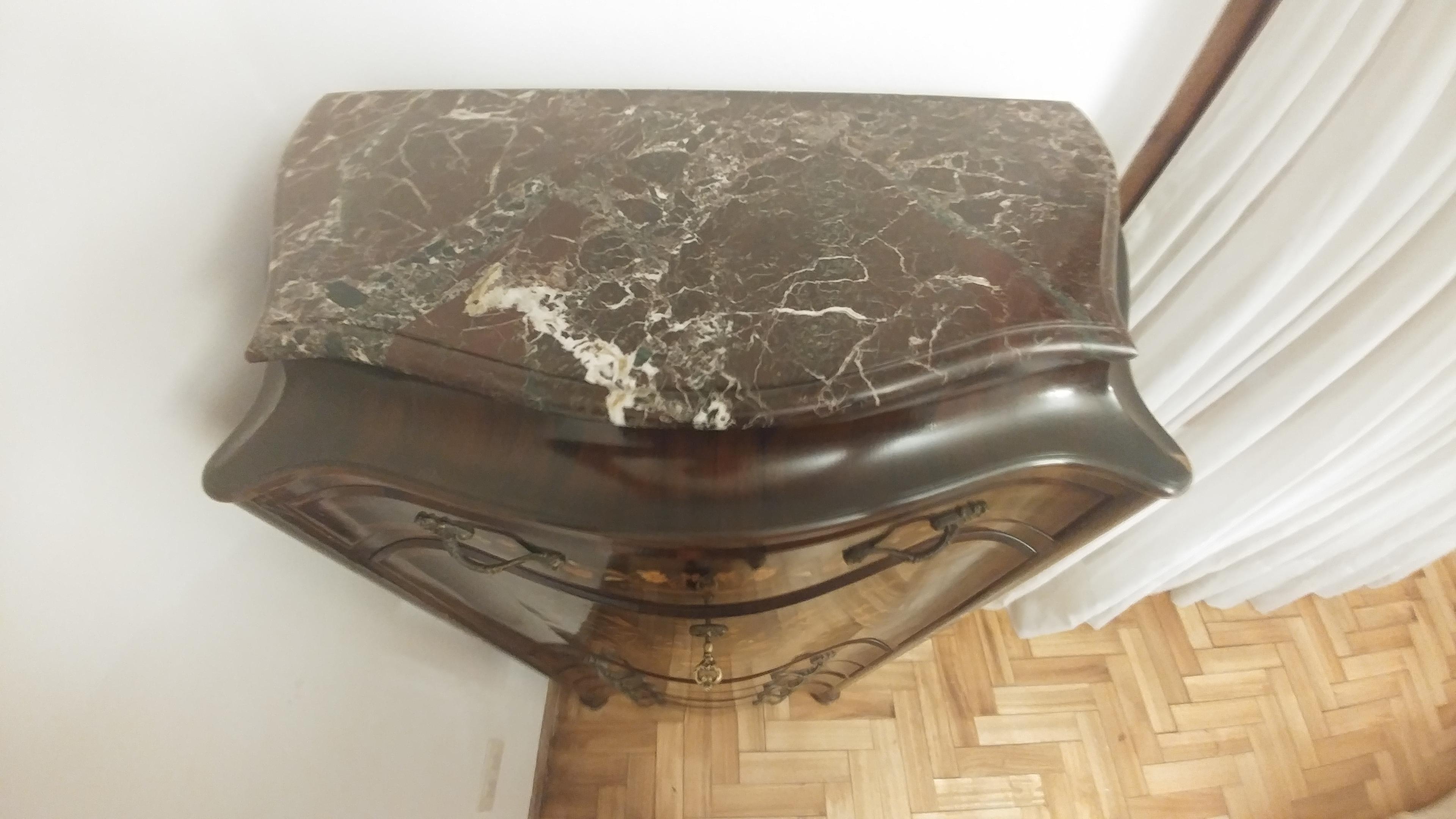 Antique secretaire, with carved wood and stone-like inserts. Bronze appliques and top marble. Height: 150cm; width: 60cm.