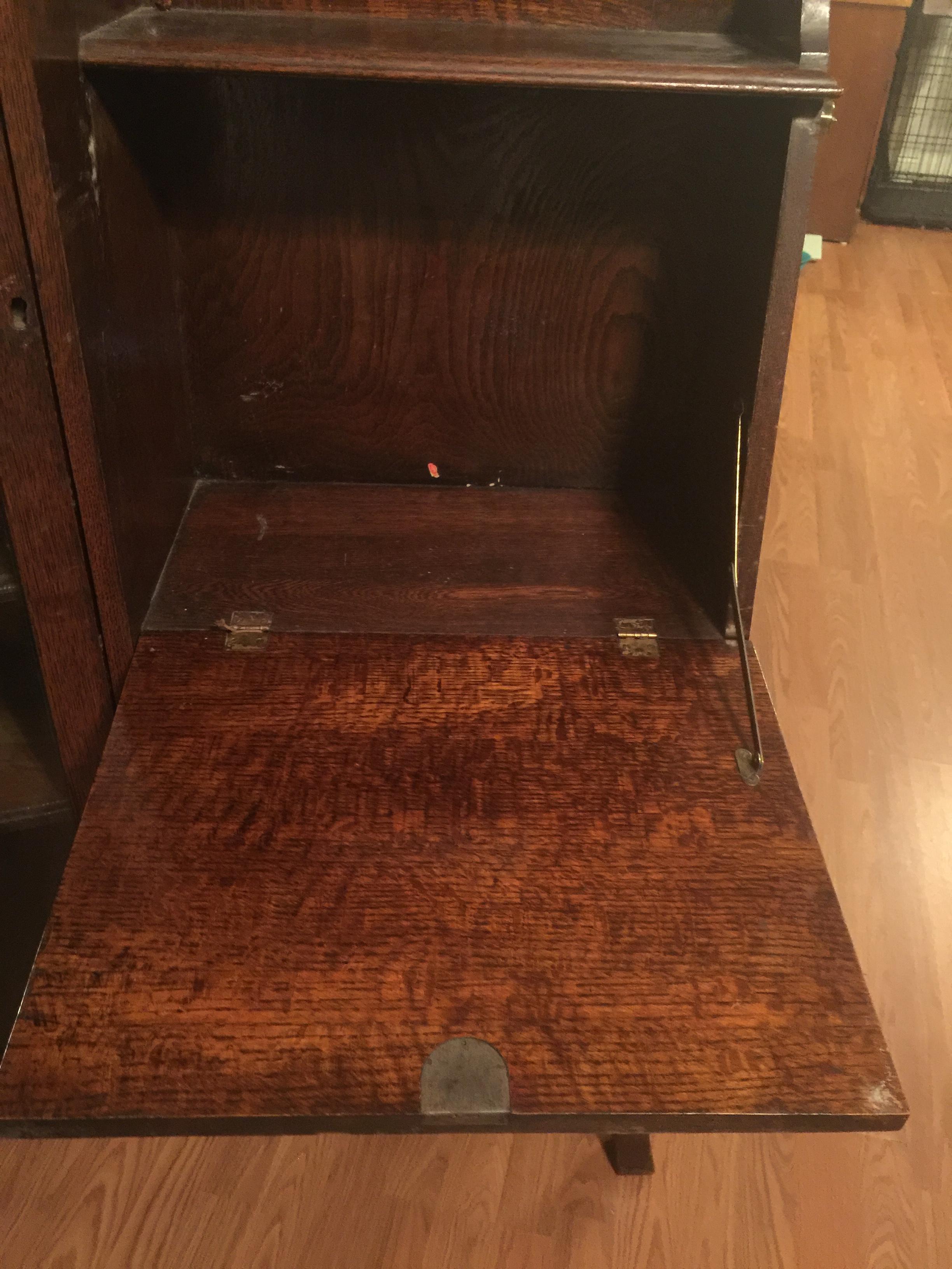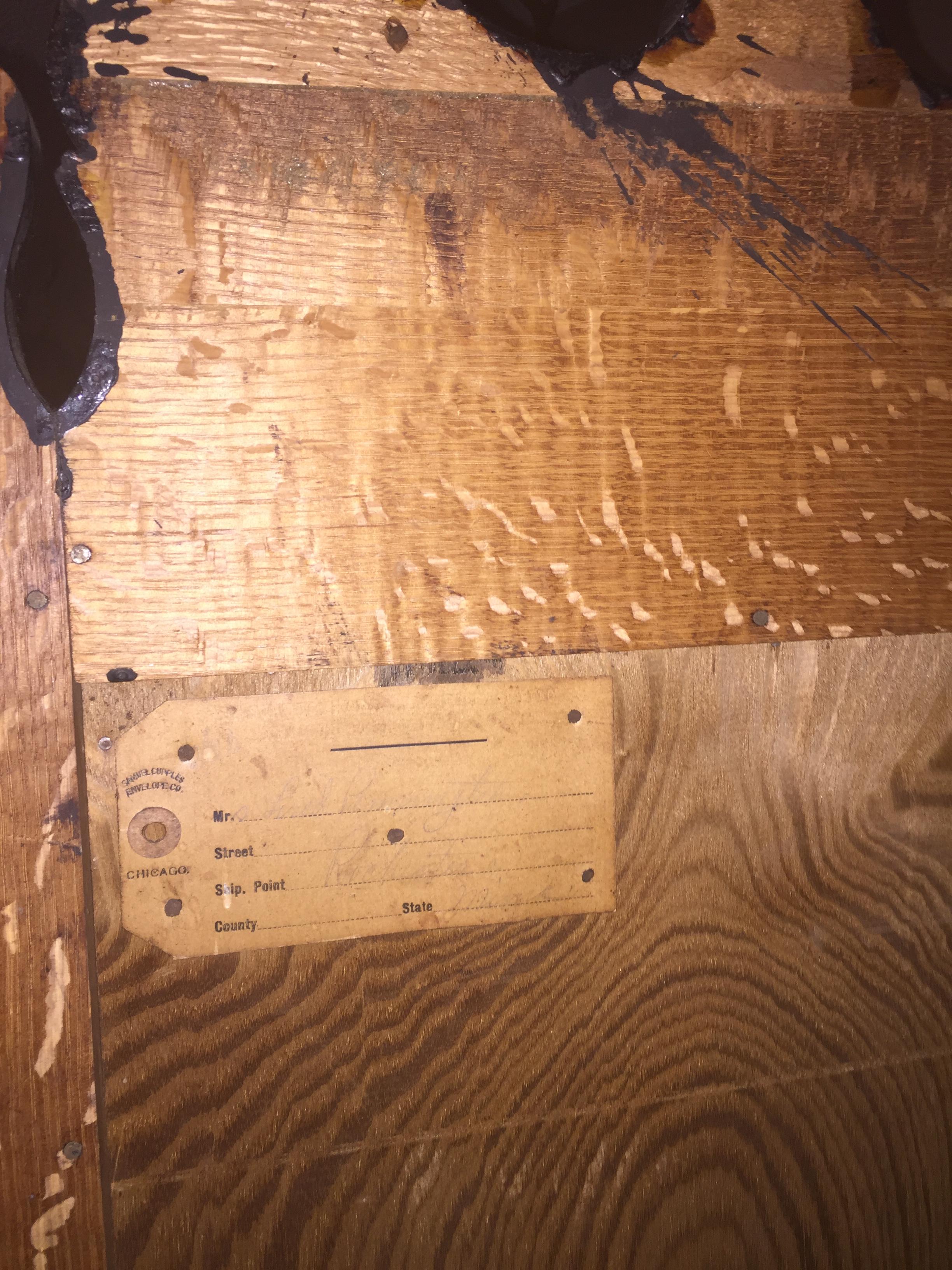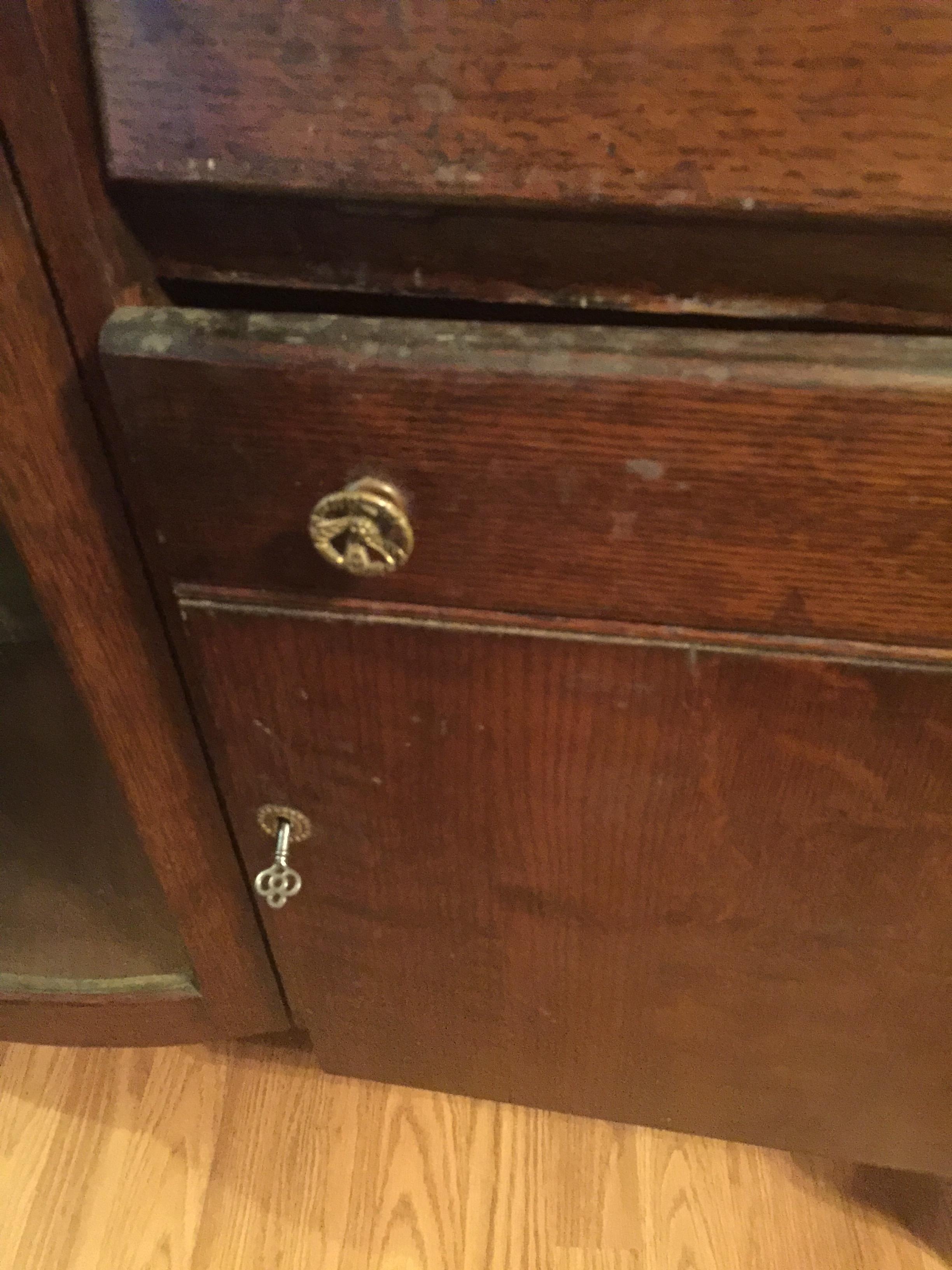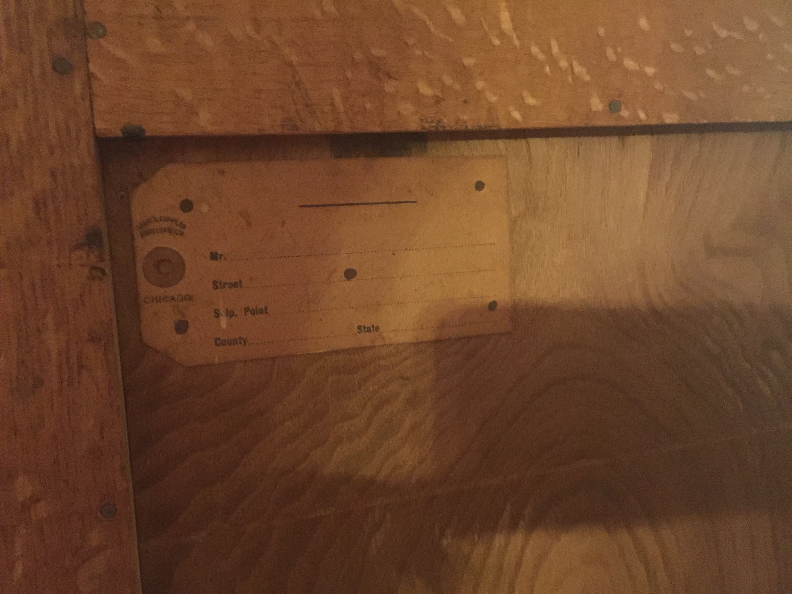 It has the original key. Curved glass on the door which is secured at the top and bottom by rope. The stain looks very thick. There is a shipping label on the back from Chicago to a person in either Missouri or Mississippi.