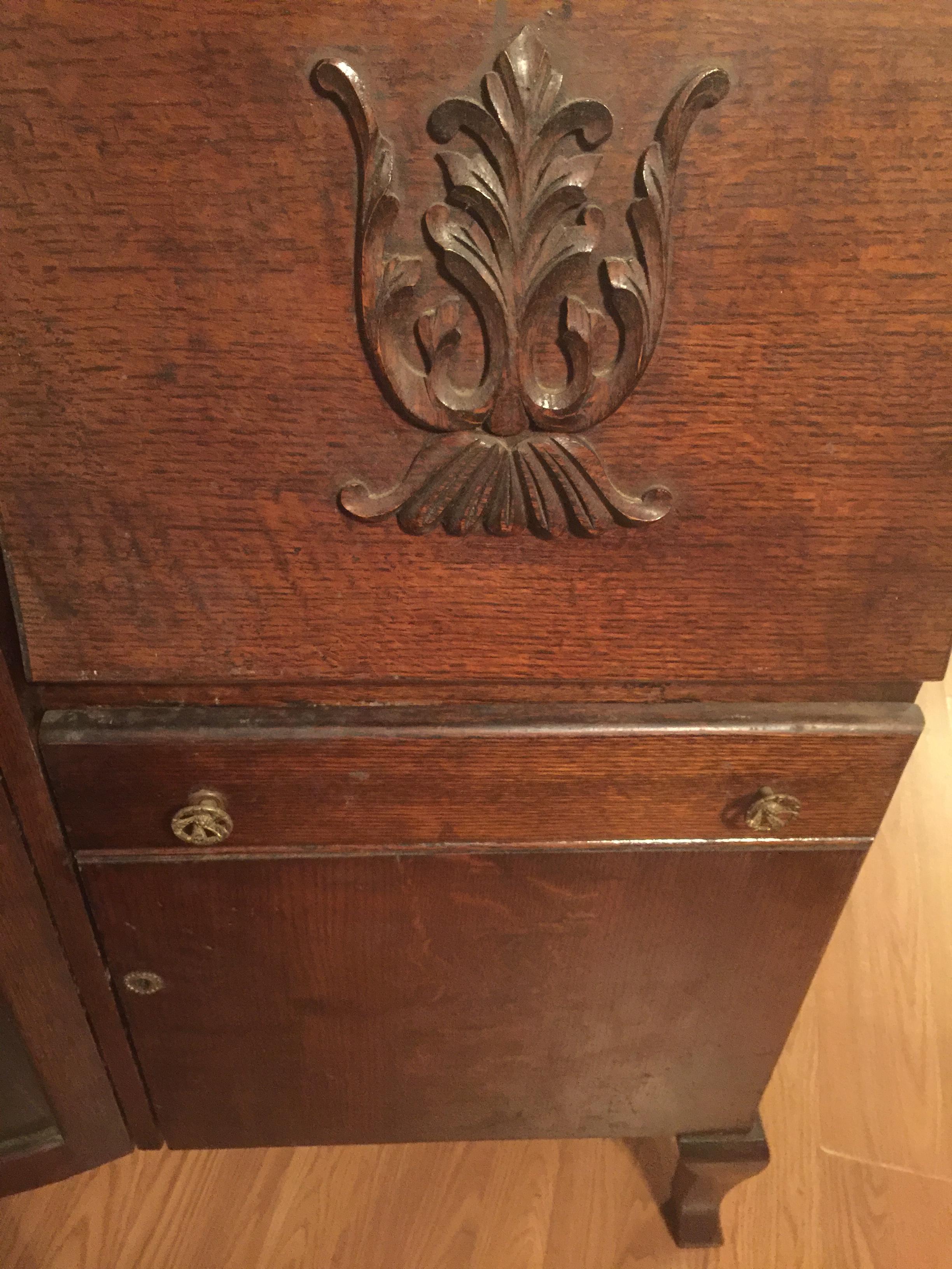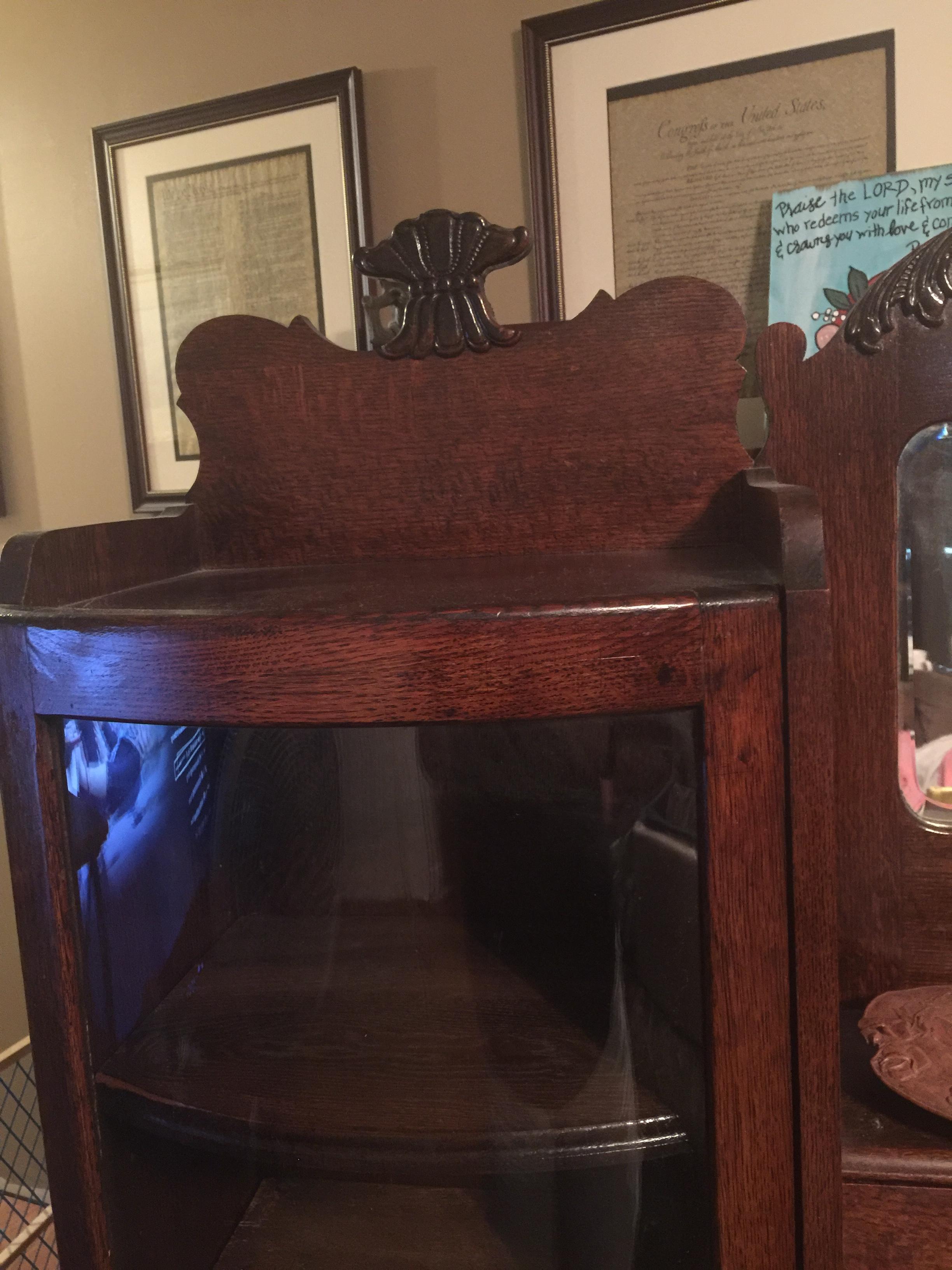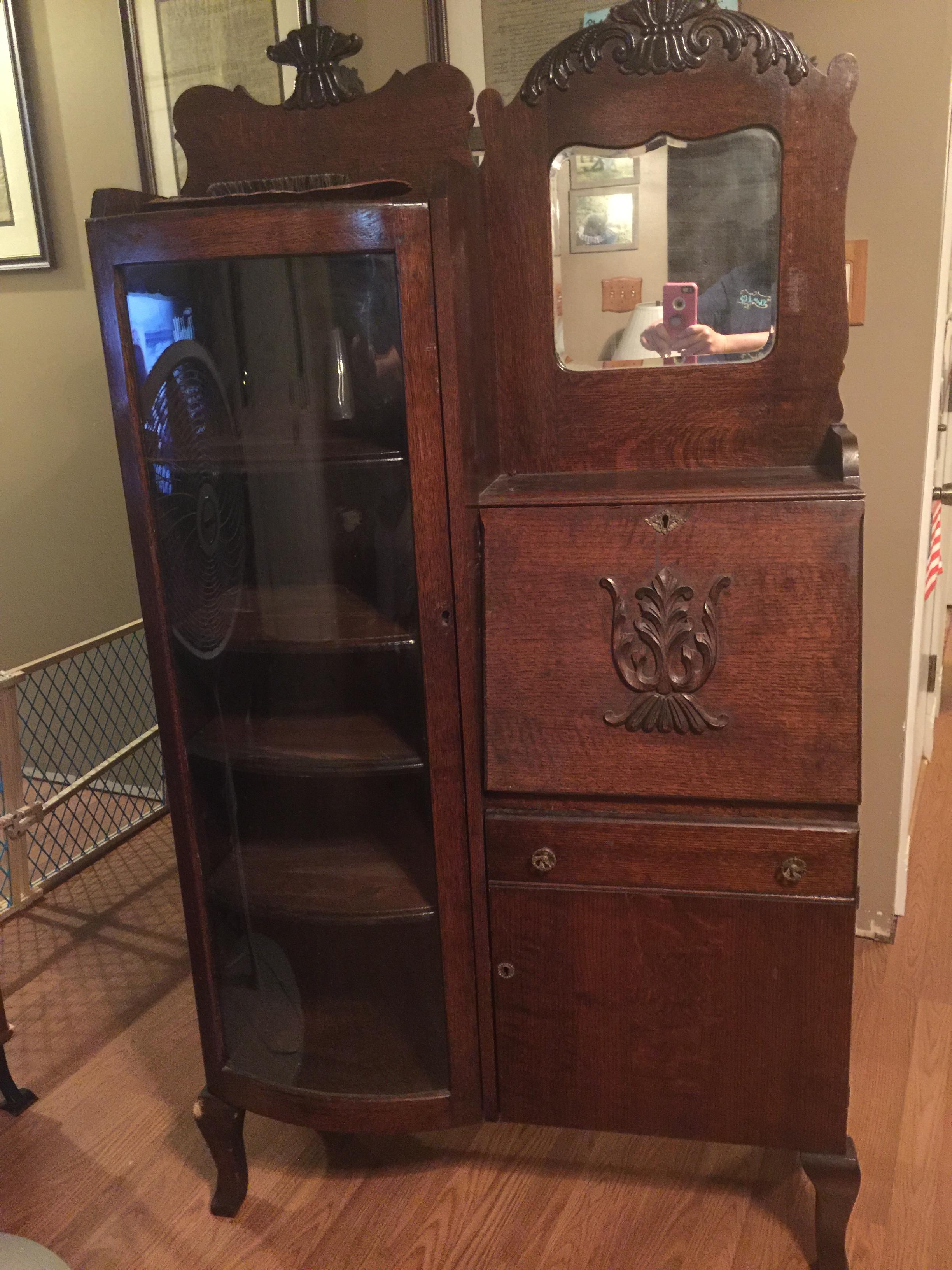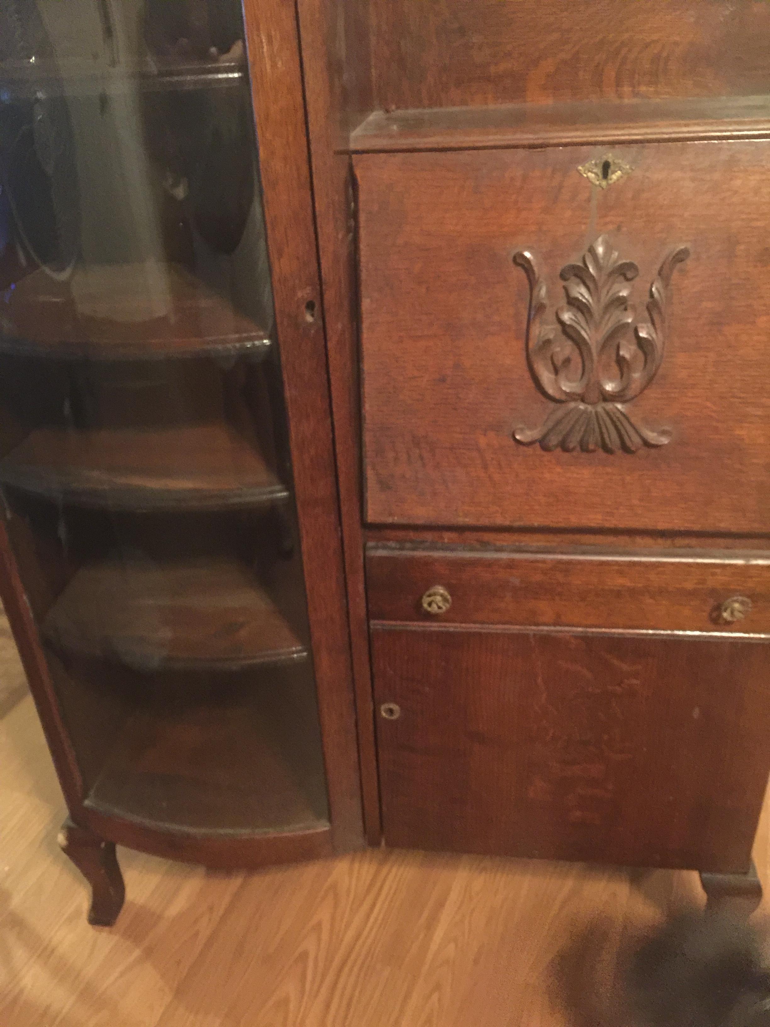 It has the original key. Curved glass on the door which is secured at the top and bottom by rope. The stain looks very thick. There is a shipping label on the back from Chicago to a person in either Missouri or Mississippi.