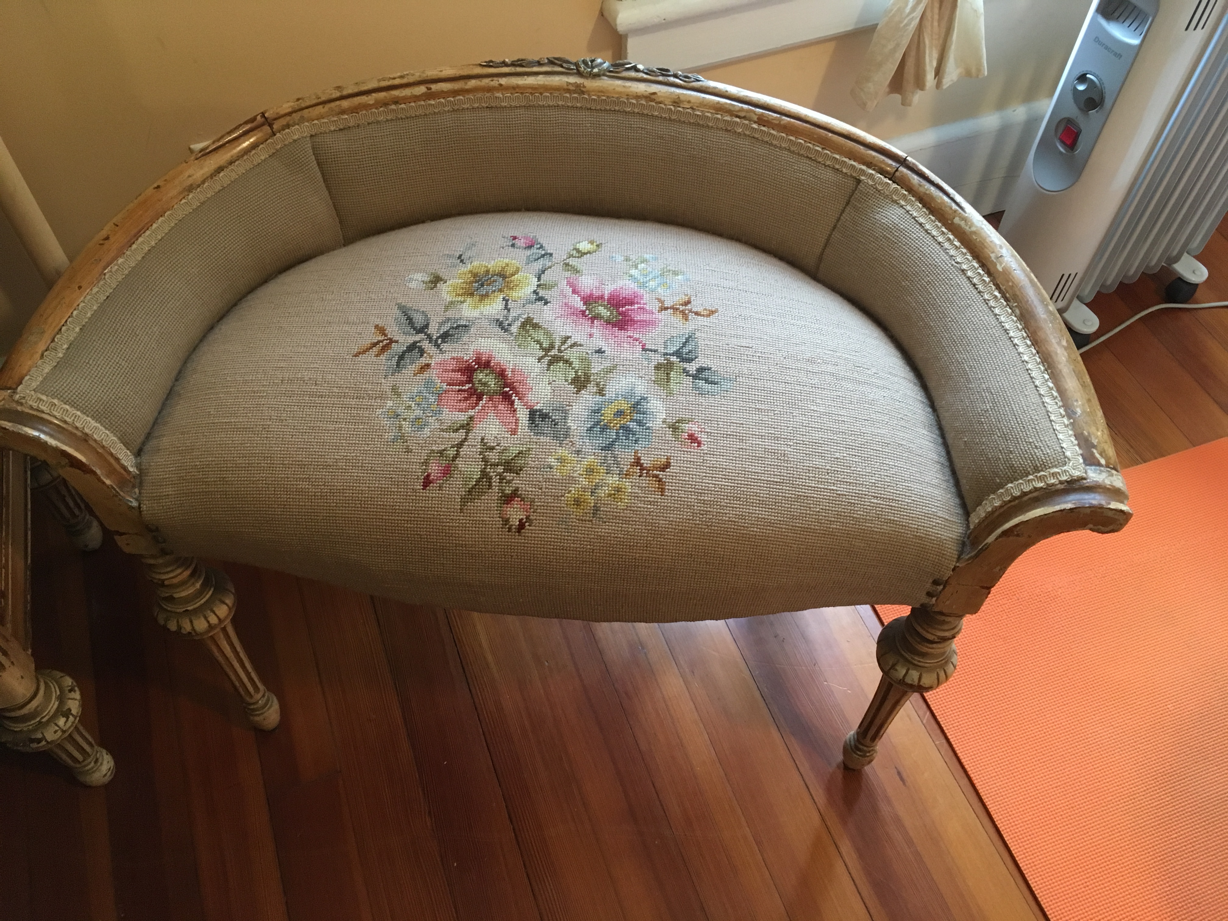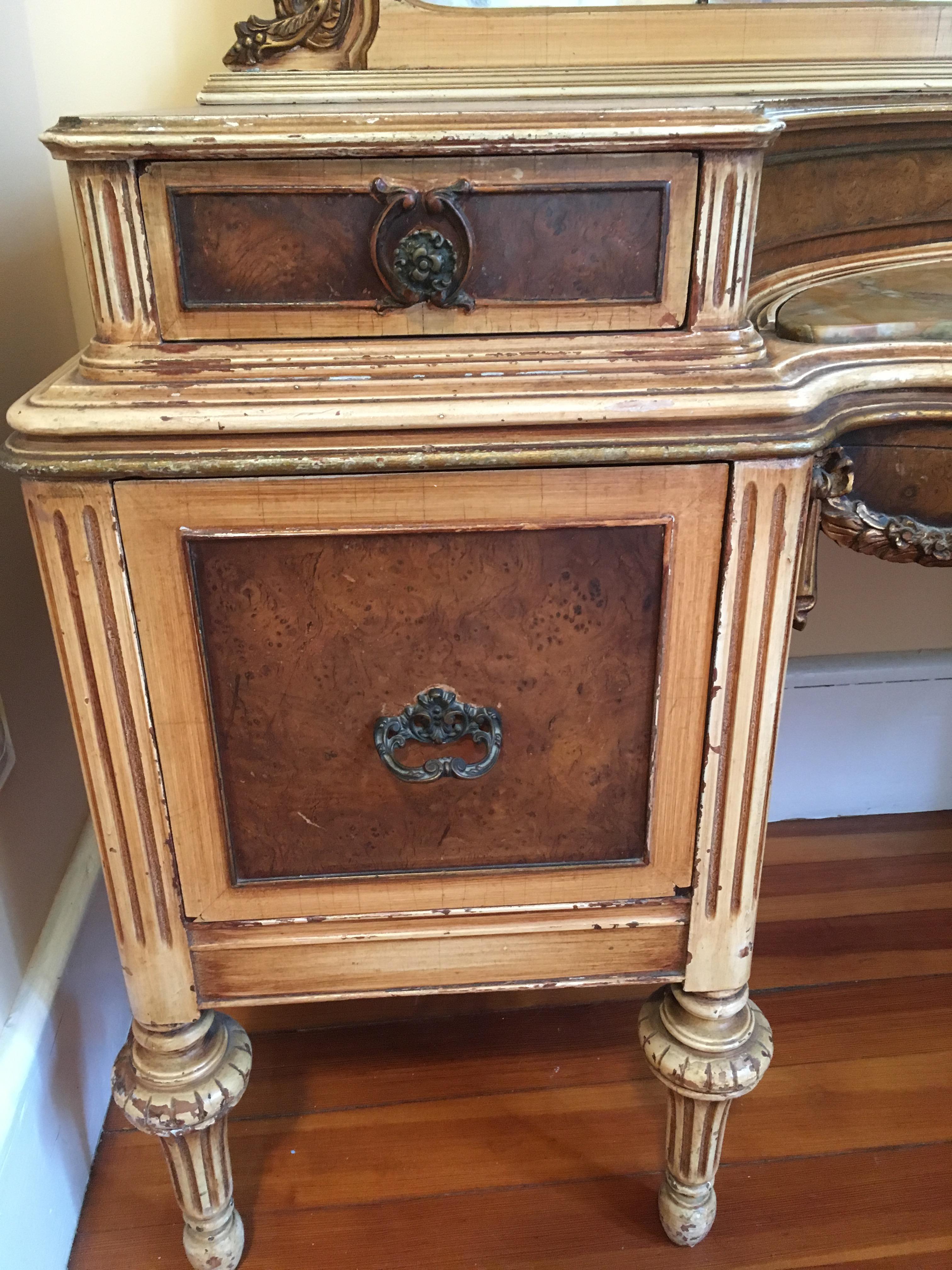 The dressing table I believe is, but do not know for sure, a replica of the French Provincial style. It has a large three-part mirror, an inset marble surface, two large drawers and two small, and a matching bench with hand-crafted needlework. The dressing table was part of a 7-piece bedroom set.