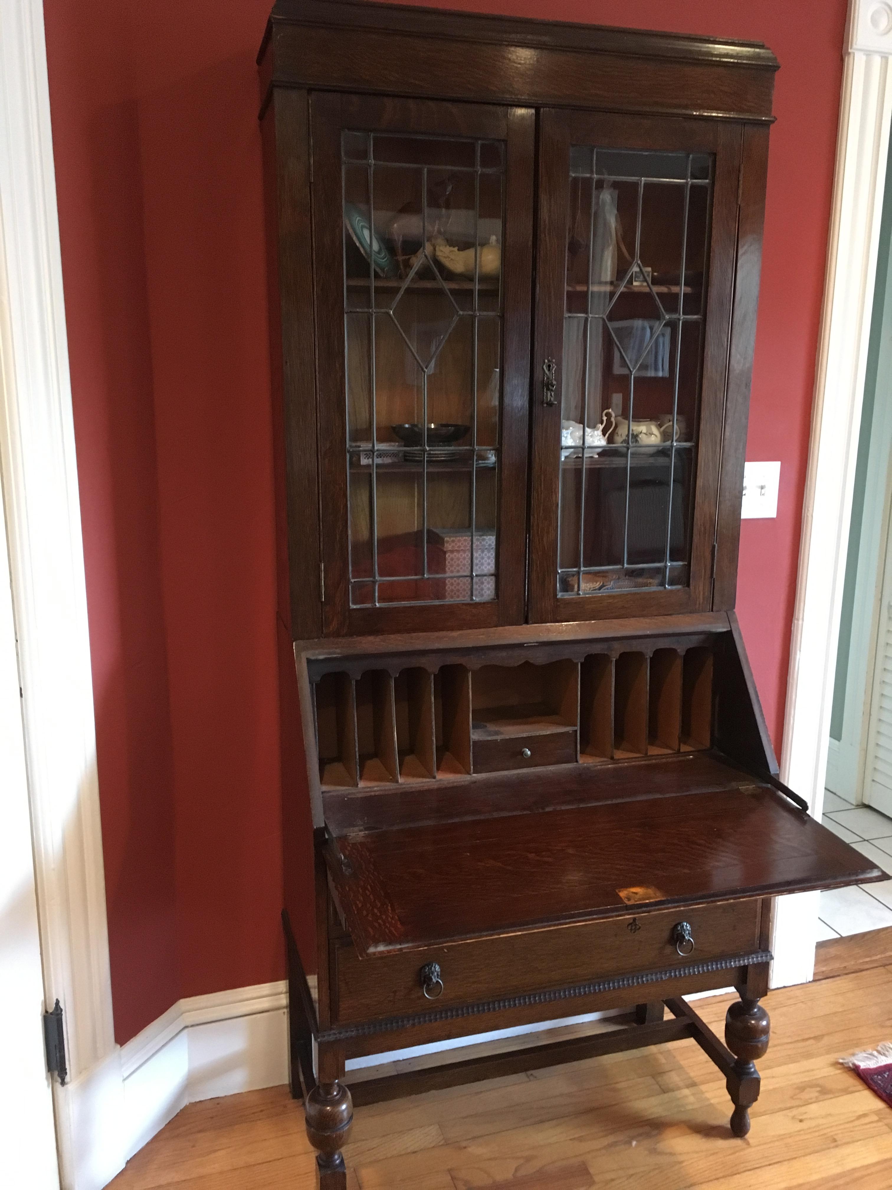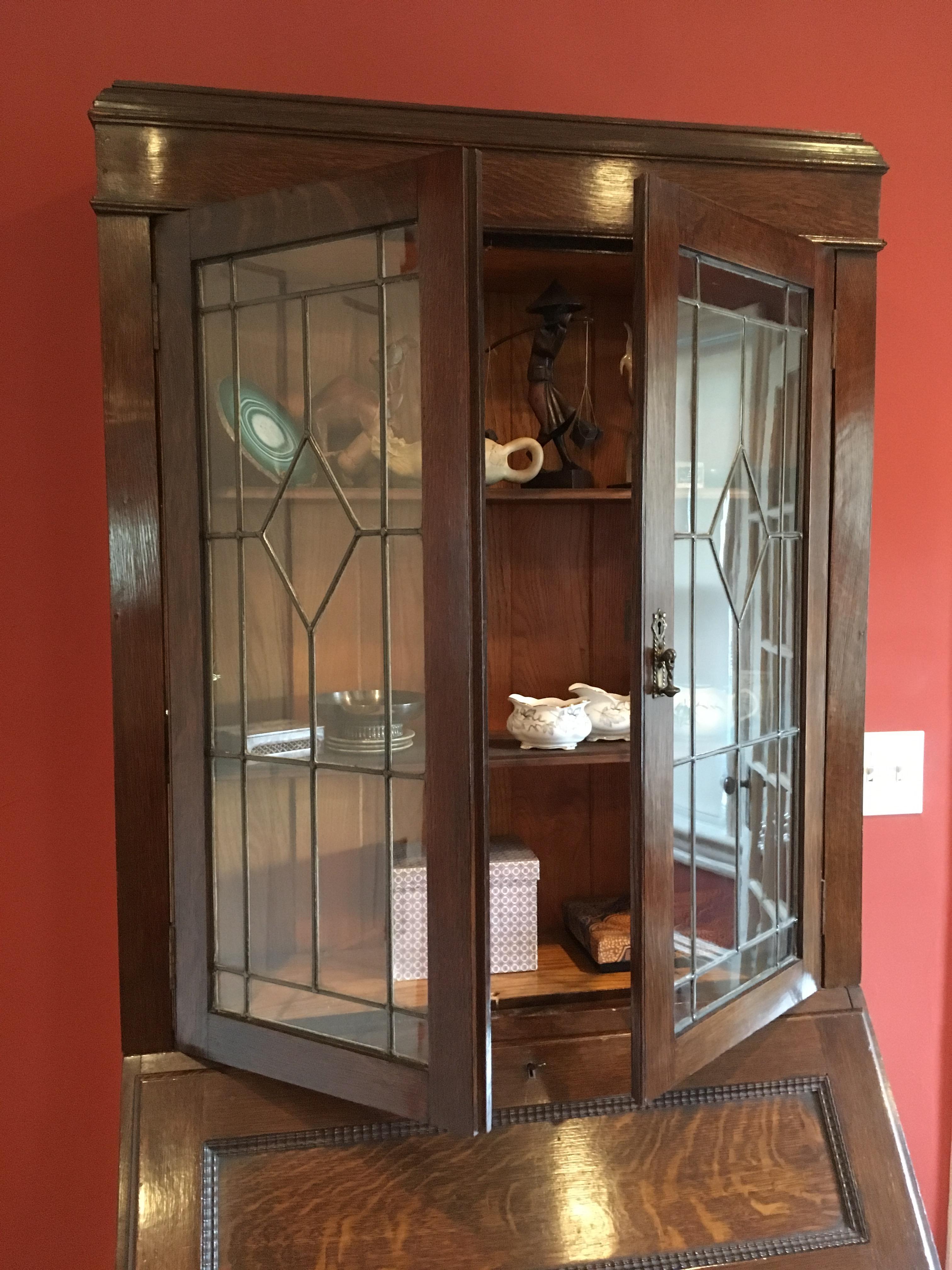 The antique secretary is oak, 19th century, with leaded glass windows, a drop down leaf for writing, and two large drawers.