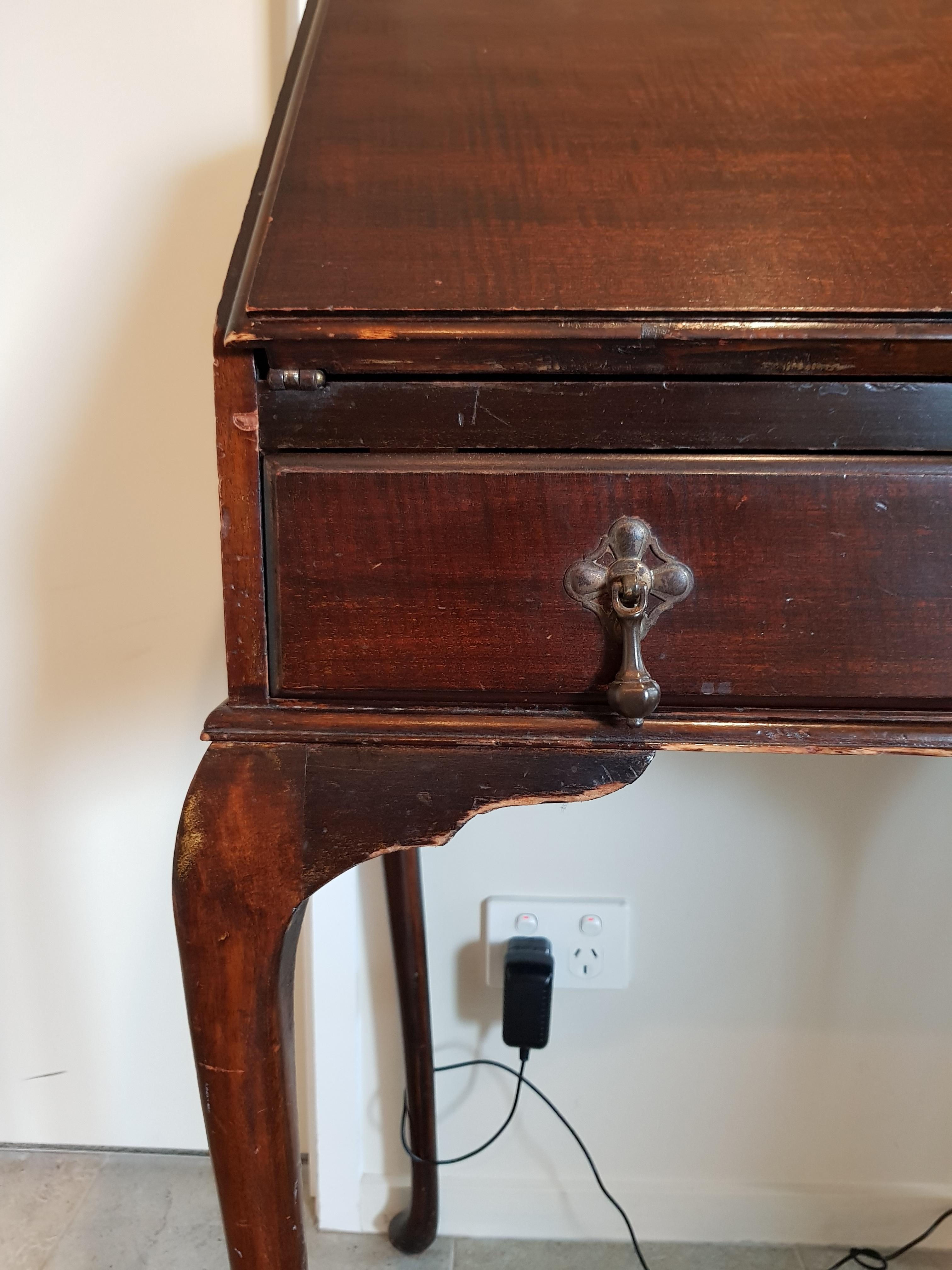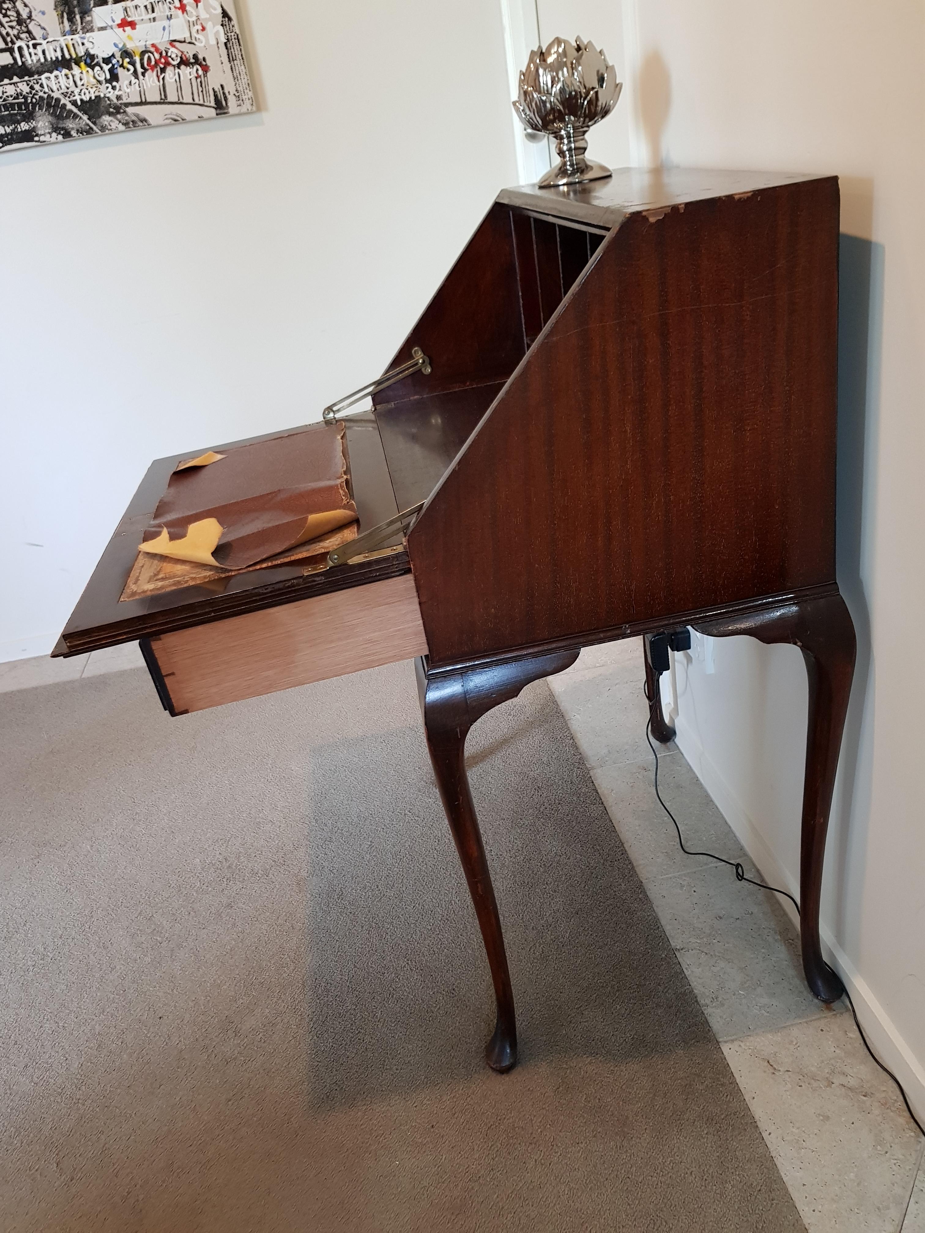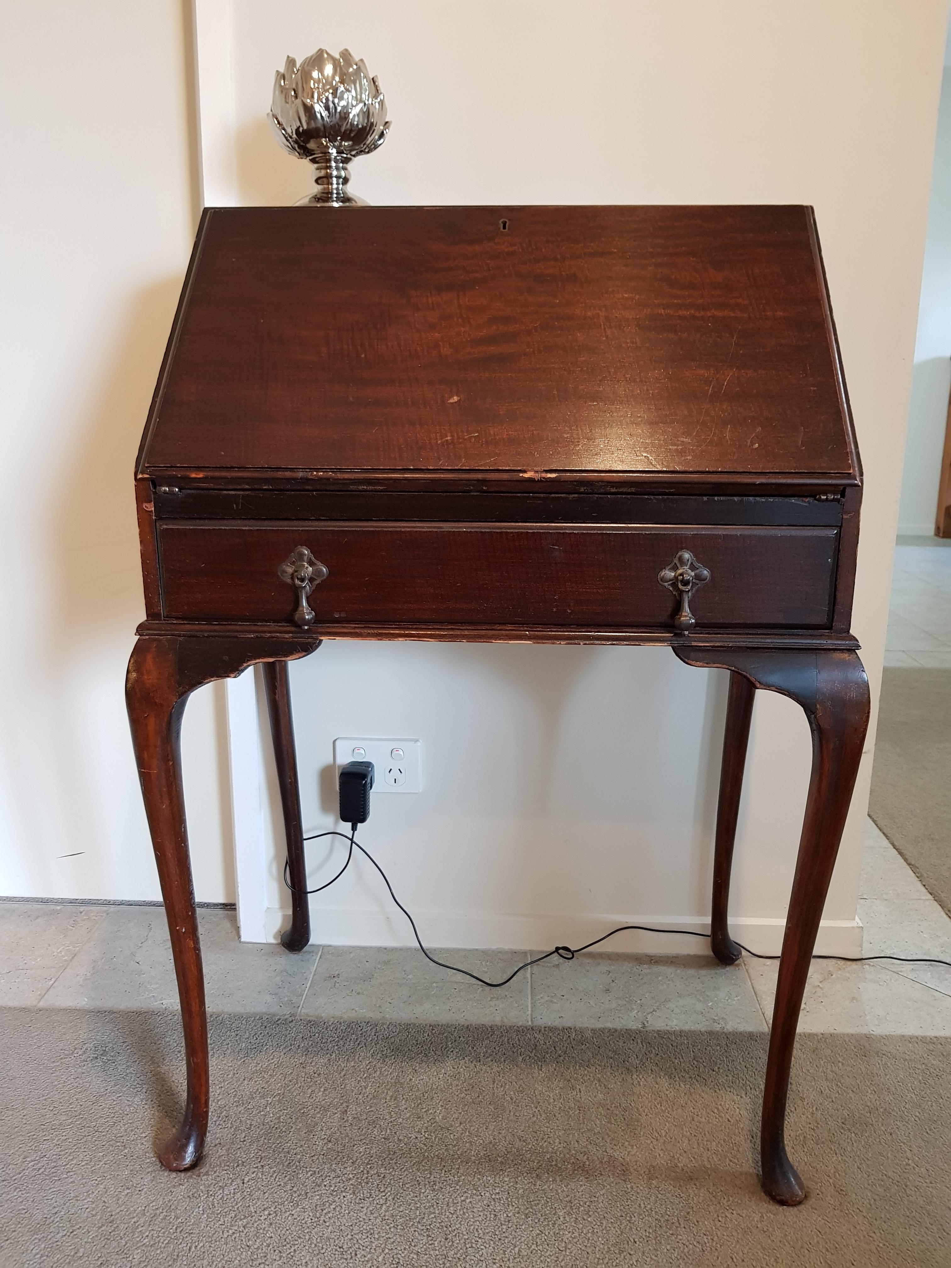 from England. drop front desk with veneer, wooden swing out ink bottle holder, leather mat on drop leaf. it came to me 28 years ago, from a maiden aunt who was born in the early 1900's, and always vowed it was an antique and worth money. but anyway... does anyone out there have any clues to offer about it's Era, possible age, maker, worth? thanks