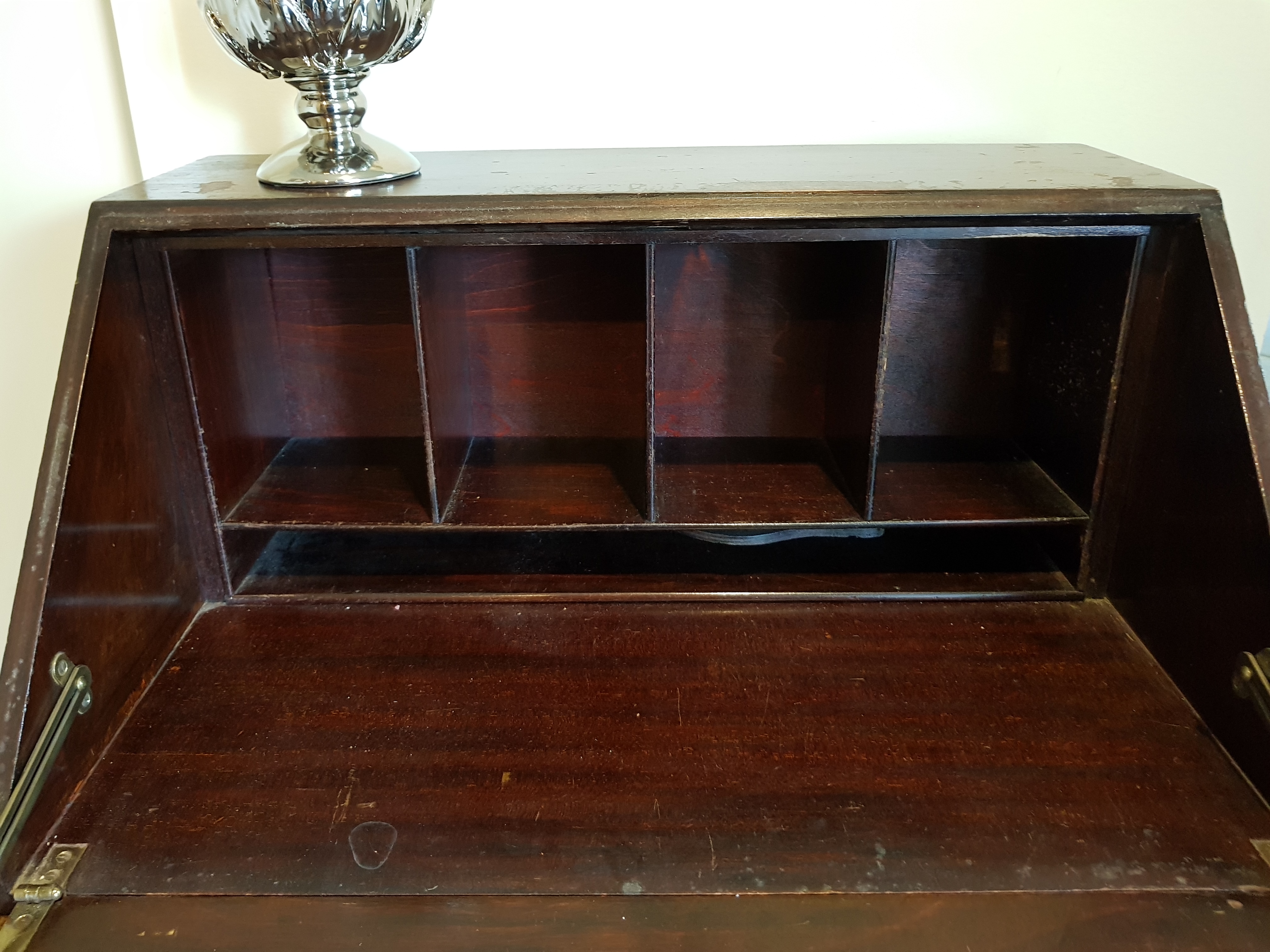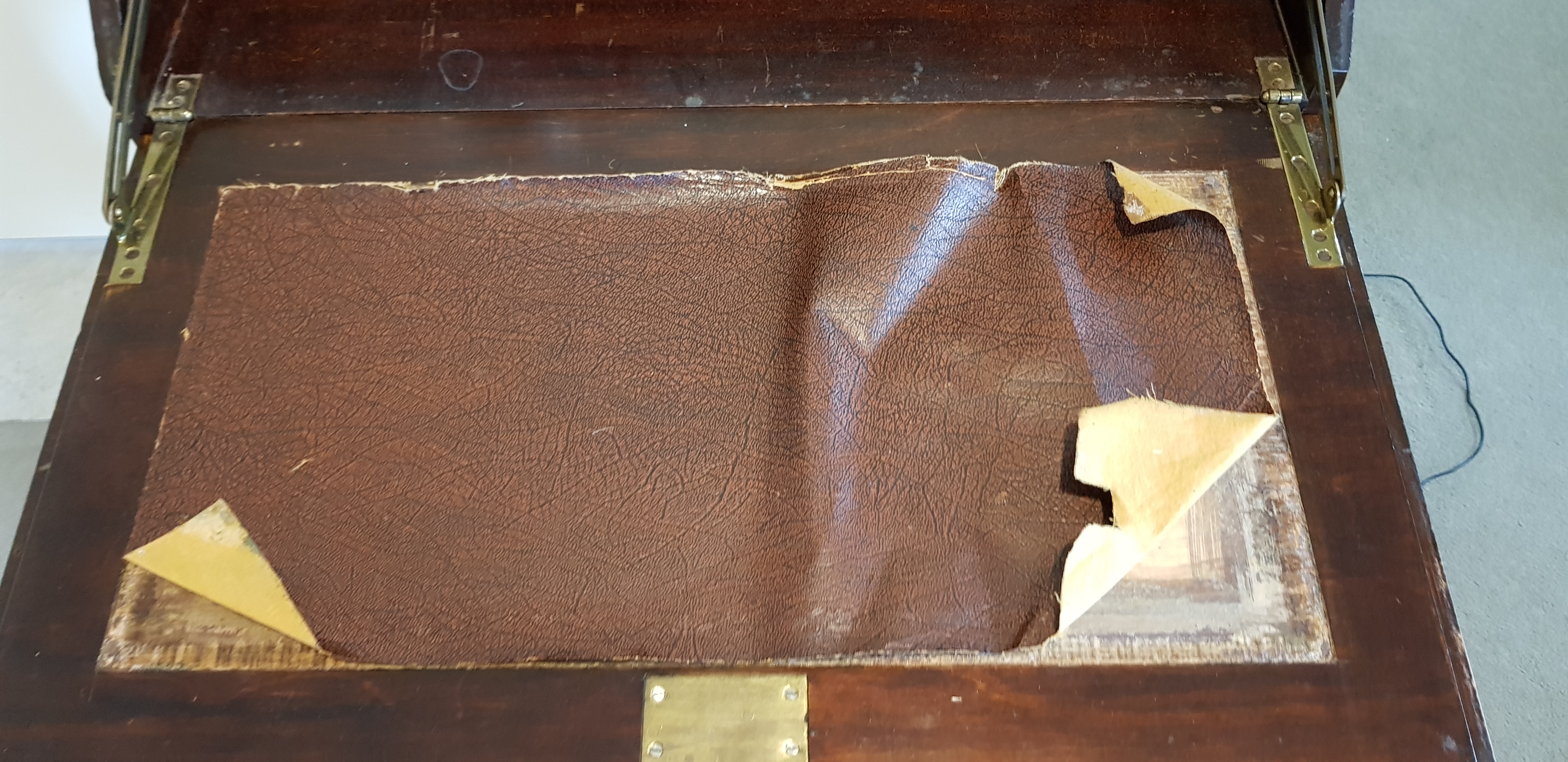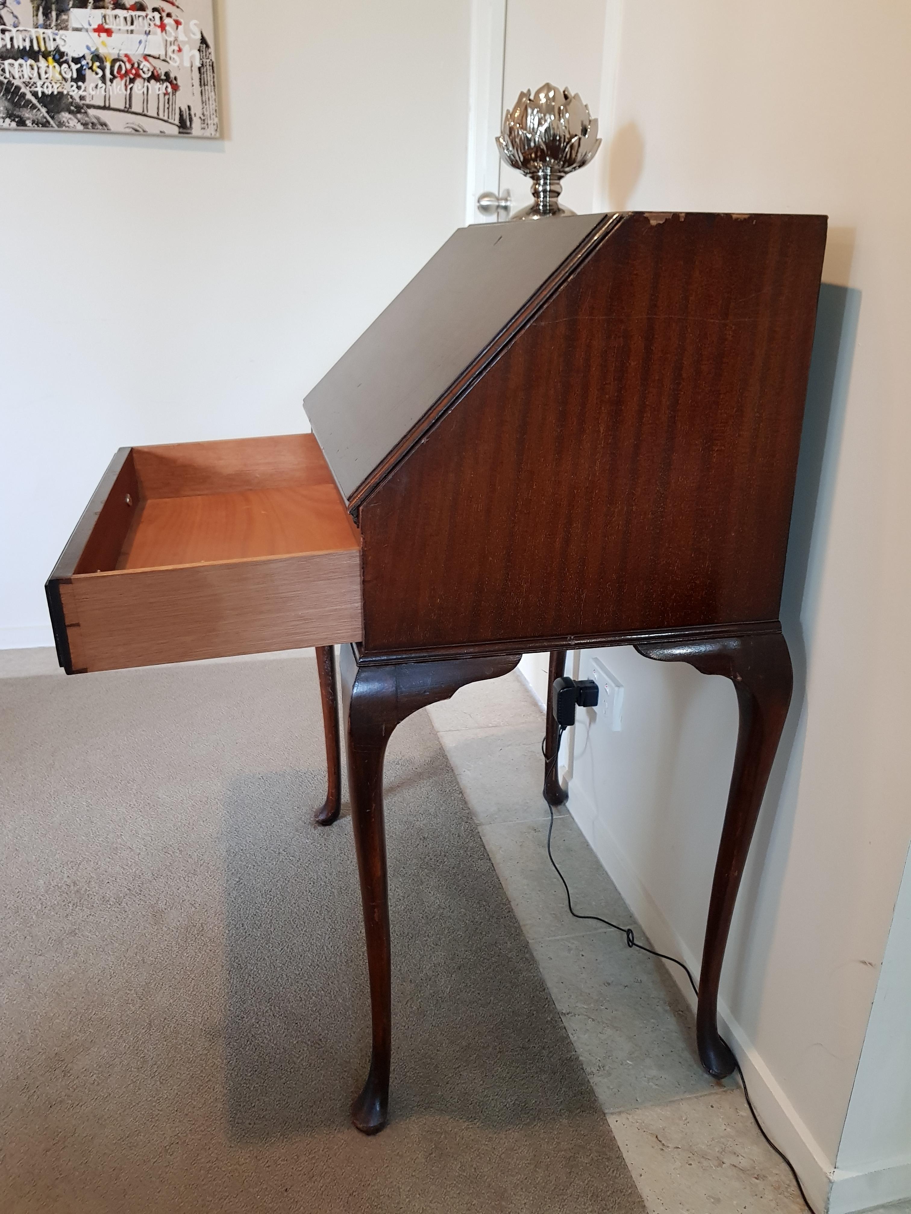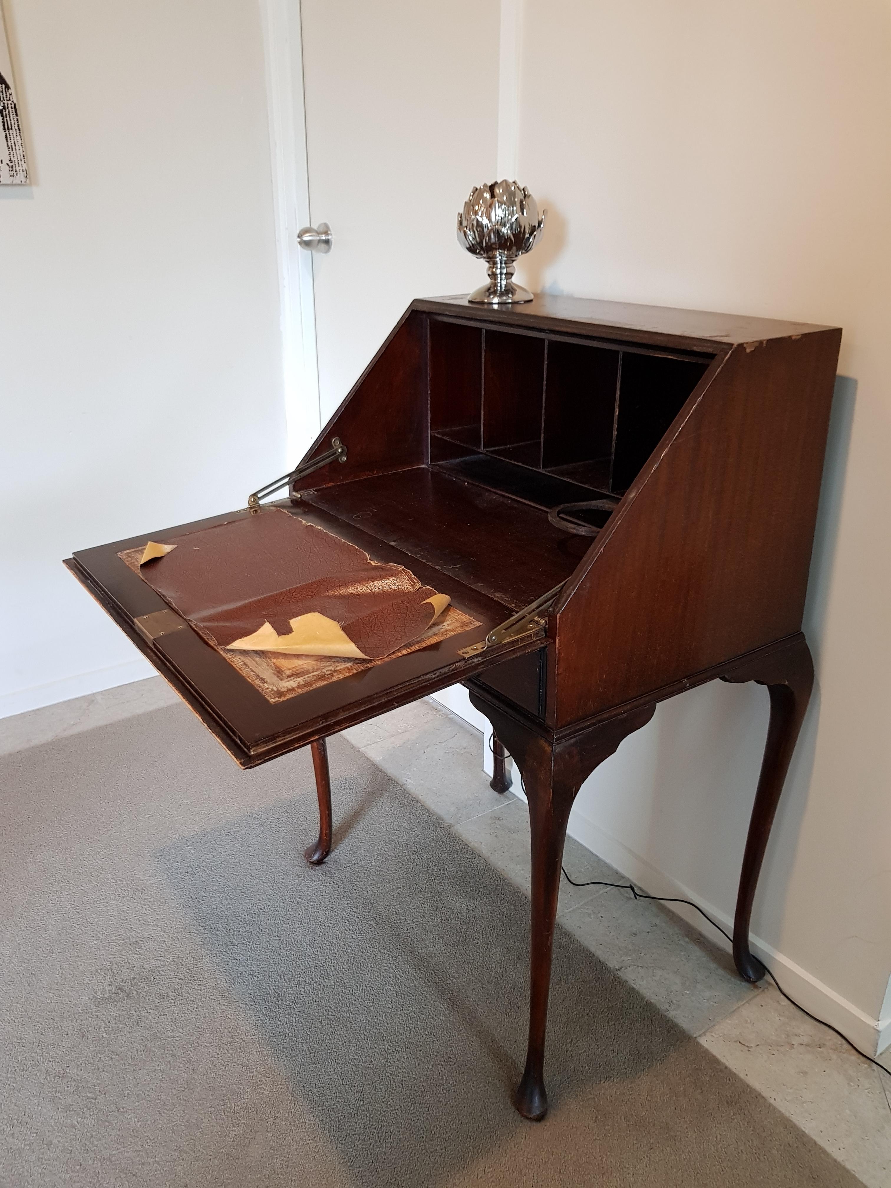from England. drop front desk with veneer, wooden swing out ink bottle holder, leather mat on drop leaf. it came to me 28 years ago, from a maiden aunt who was born in the early 1900's, and always vowed it was an antique and worth money. but anyway... does anyone out there have any clues to offer about it's Era, possible age, maker, worth? thanks