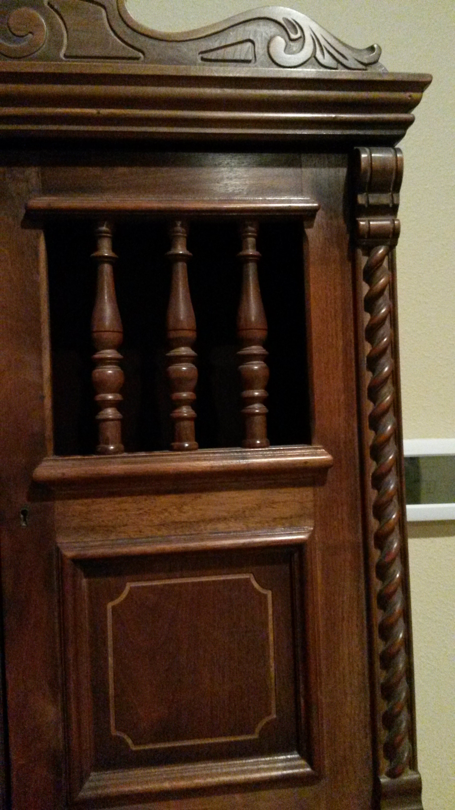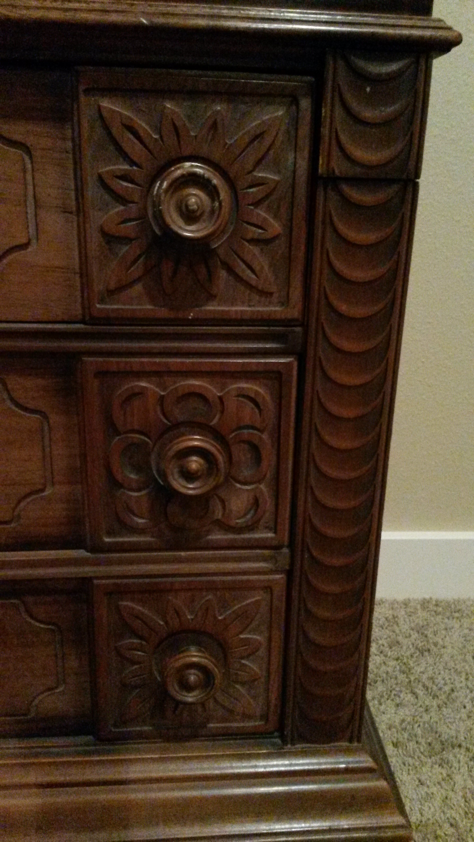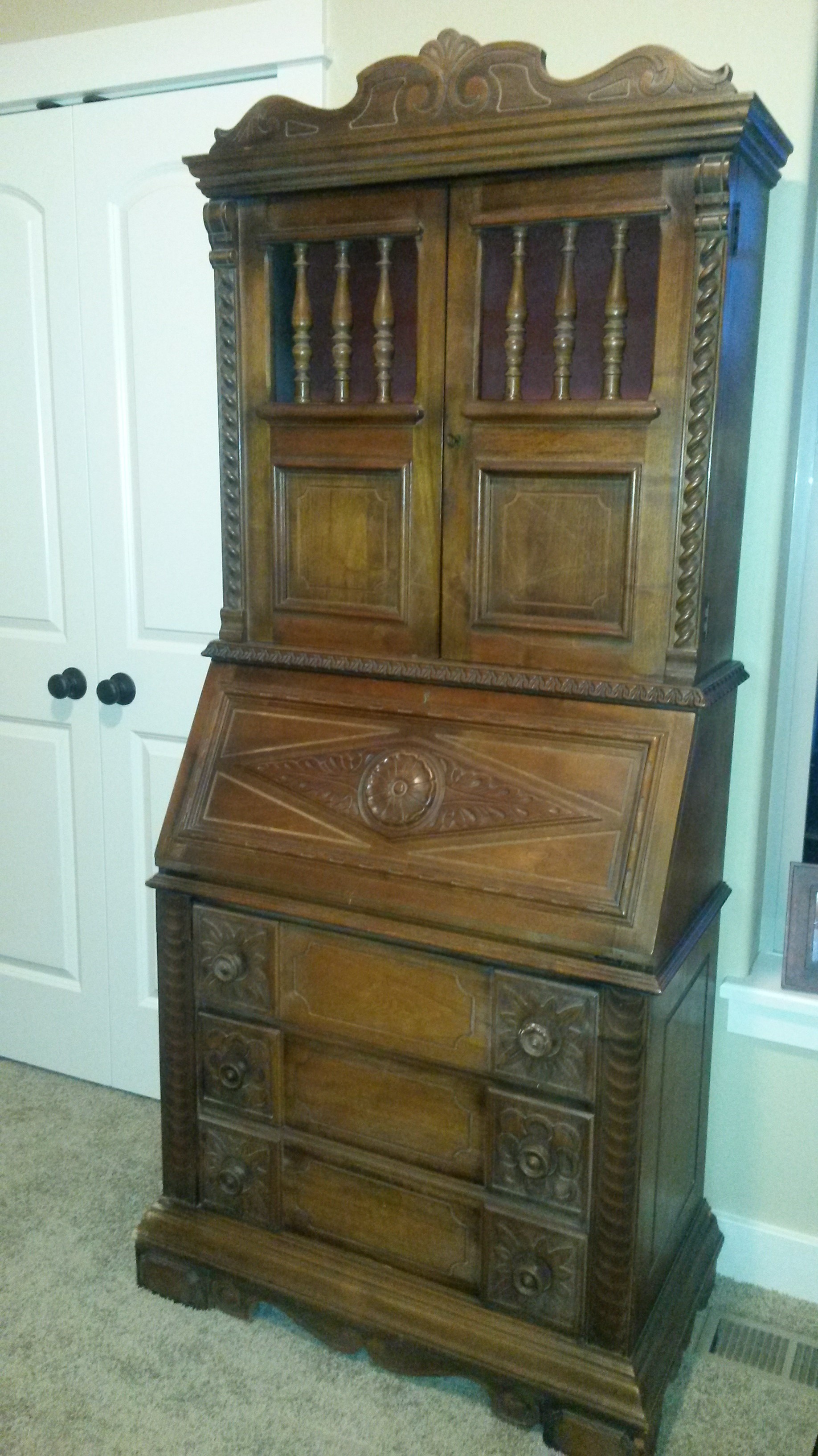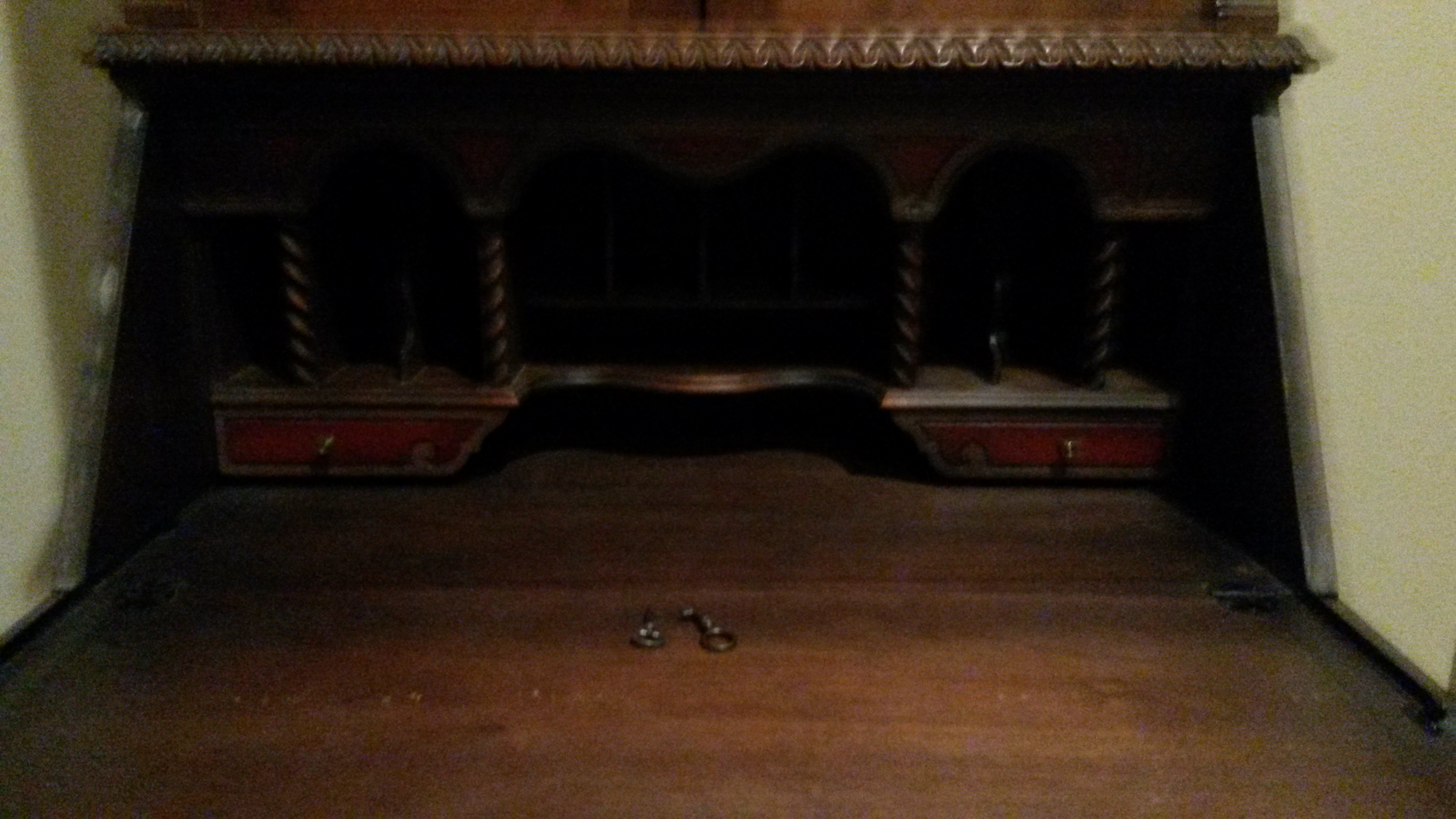 This was my Grandmother's secretary. I don't know much about it. It has a large Rosette on the slant, and two different  designs on the drawer fronts. The inside has red and green stains applied and there are two keys. One for desk top, and one for uppercase.