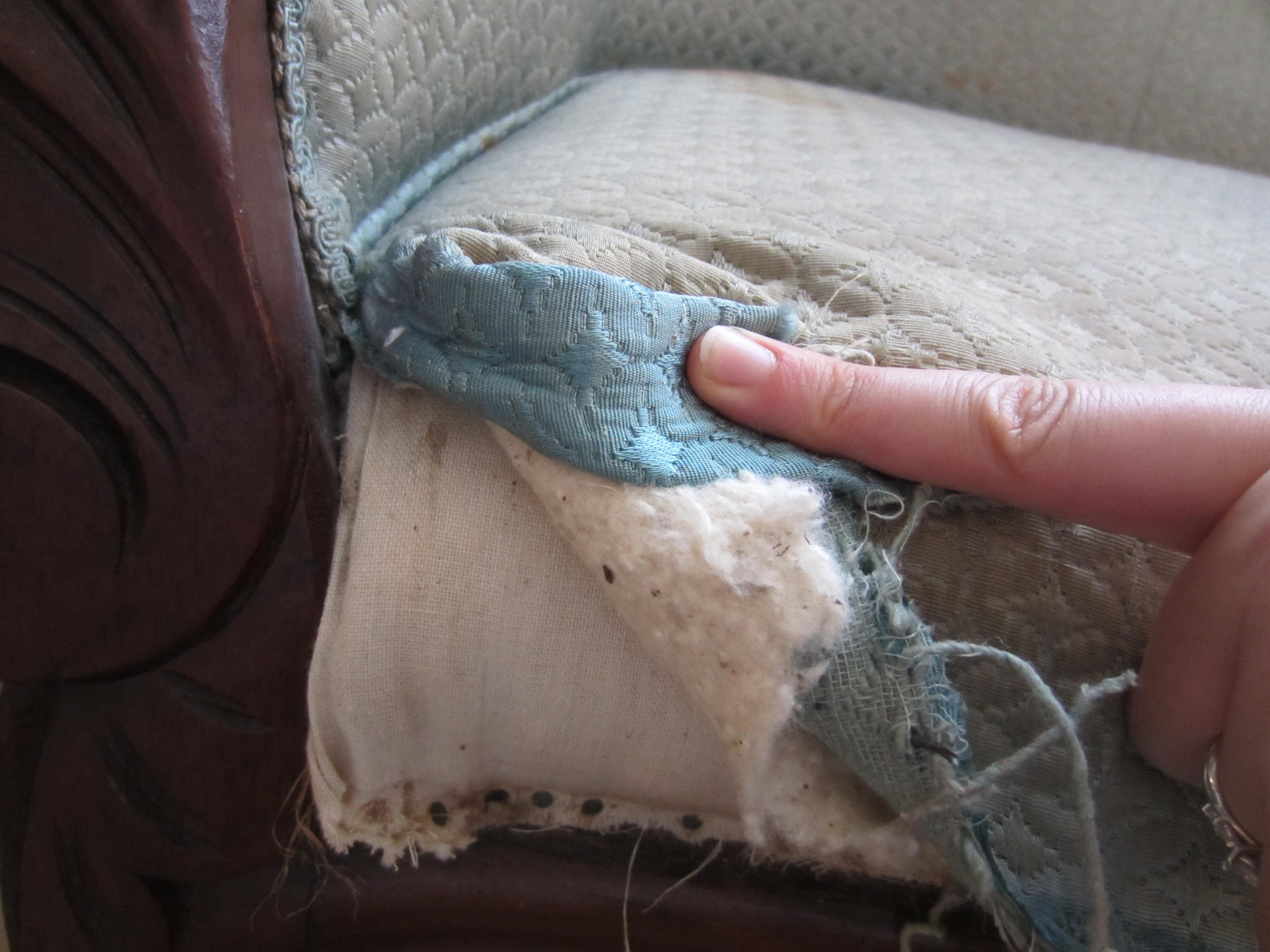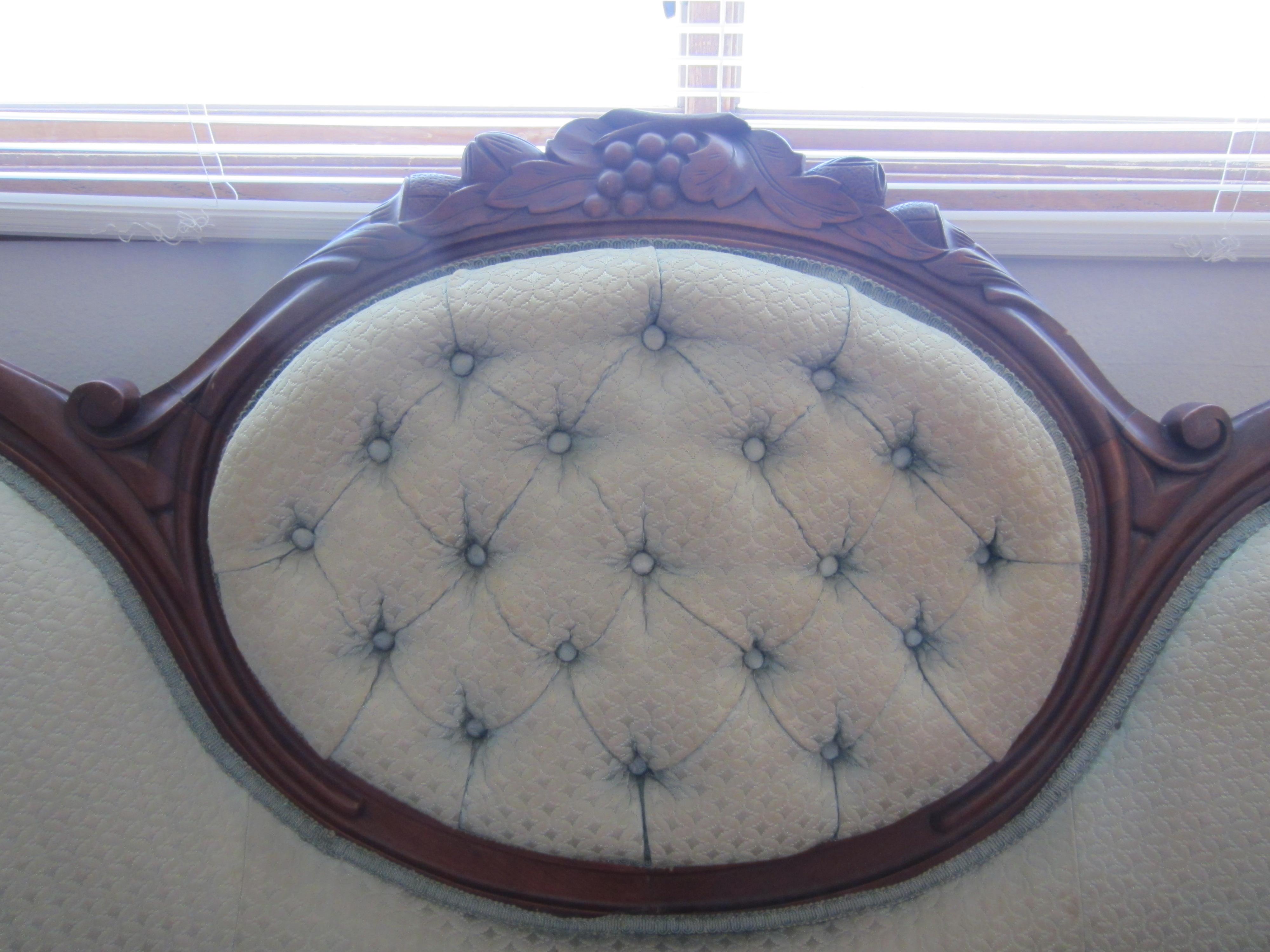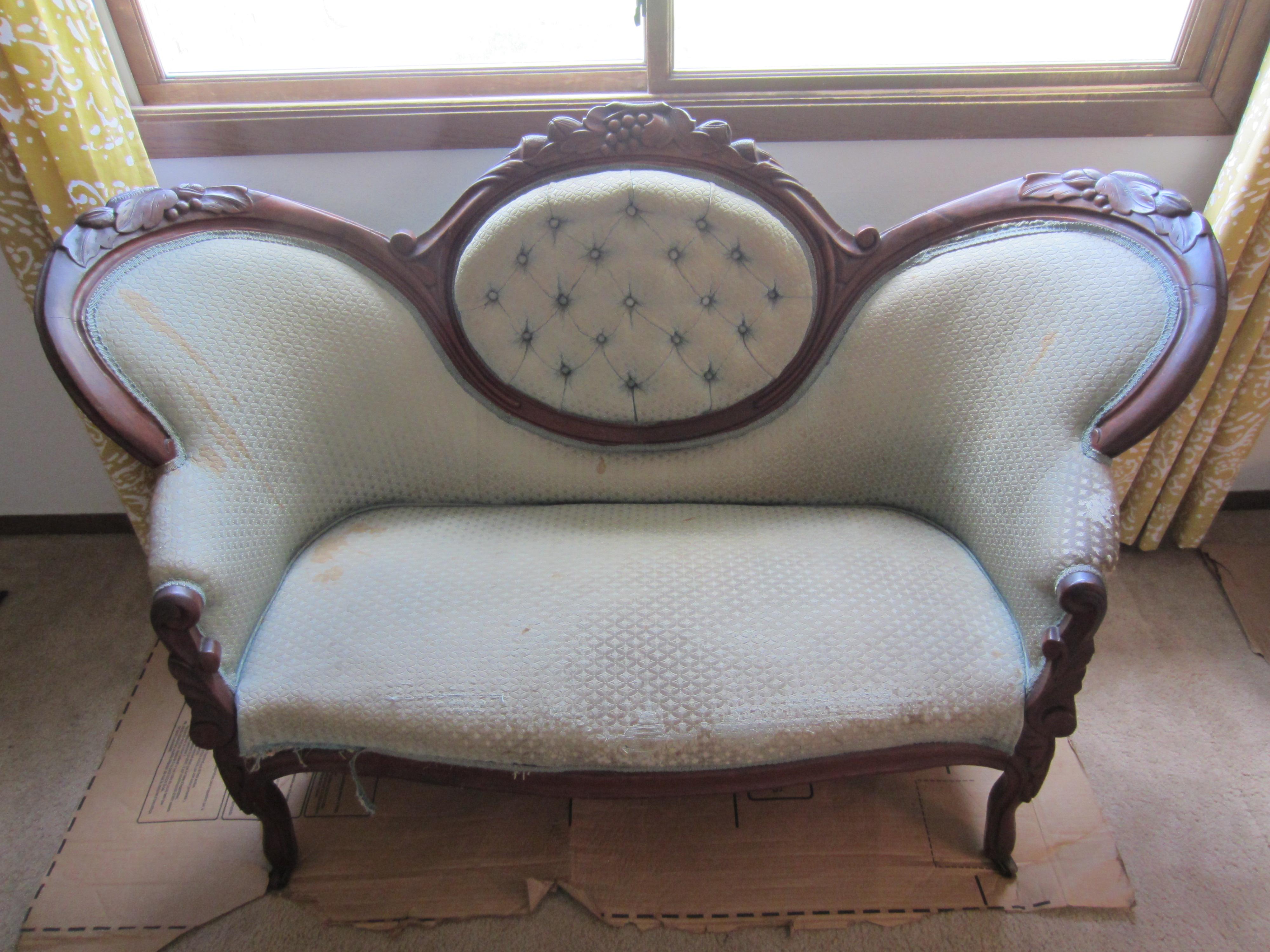 I purchased this settee and chair together in upstate New York. Although they are upholstered in the same fabric they are not a matching set. They were reupholstered in 1962 by Mardan Furniture according to the tag on the chair. They contain the original casters and the springs are all tied tightly and the seats are firm. There is wear and some staining on the fabric, some dings and chips in the wood, as well as, some flaking on the chair's finish. I would like to know the value of each of these peices and any information on the craftmanship and style. Thank you