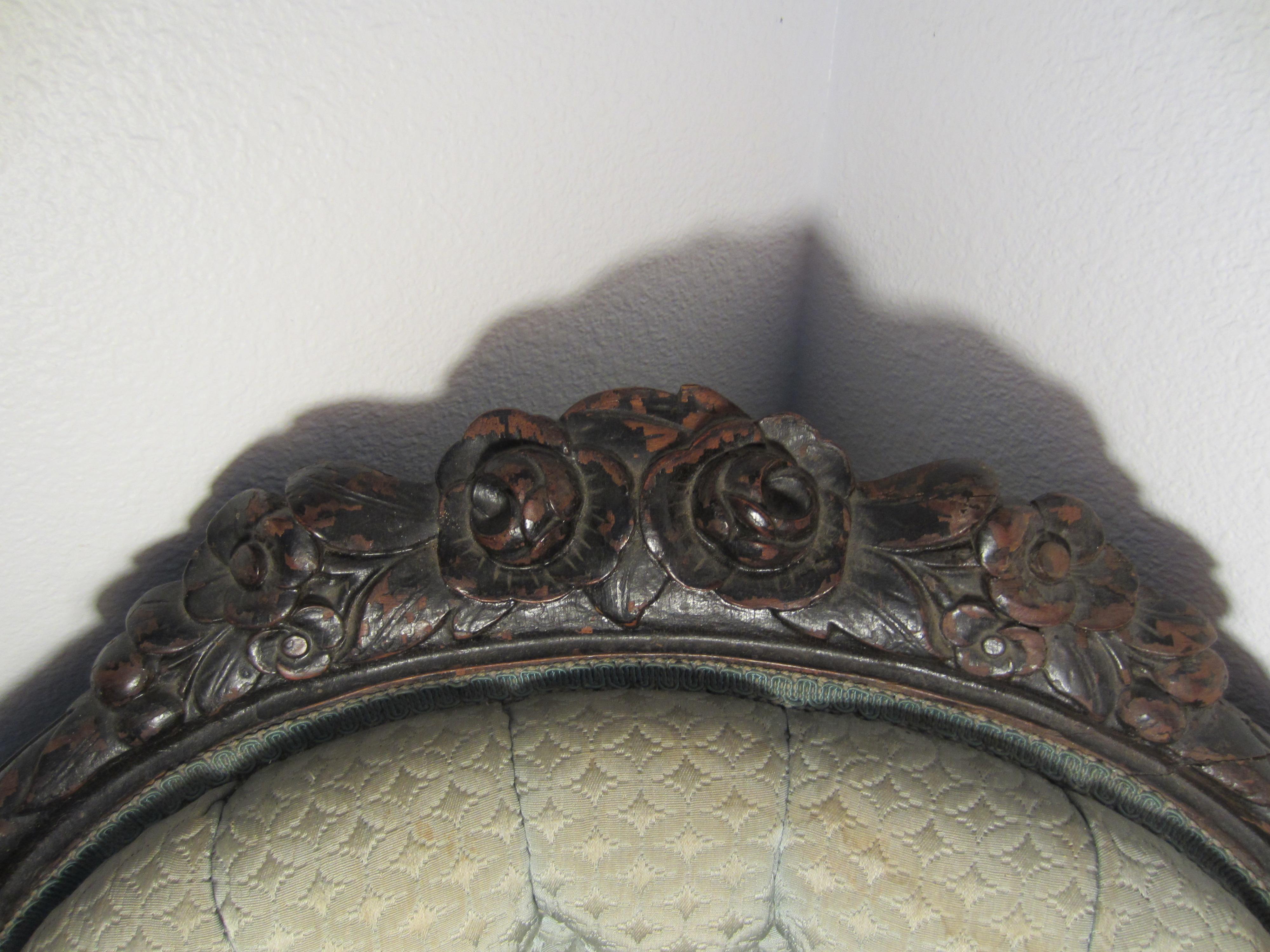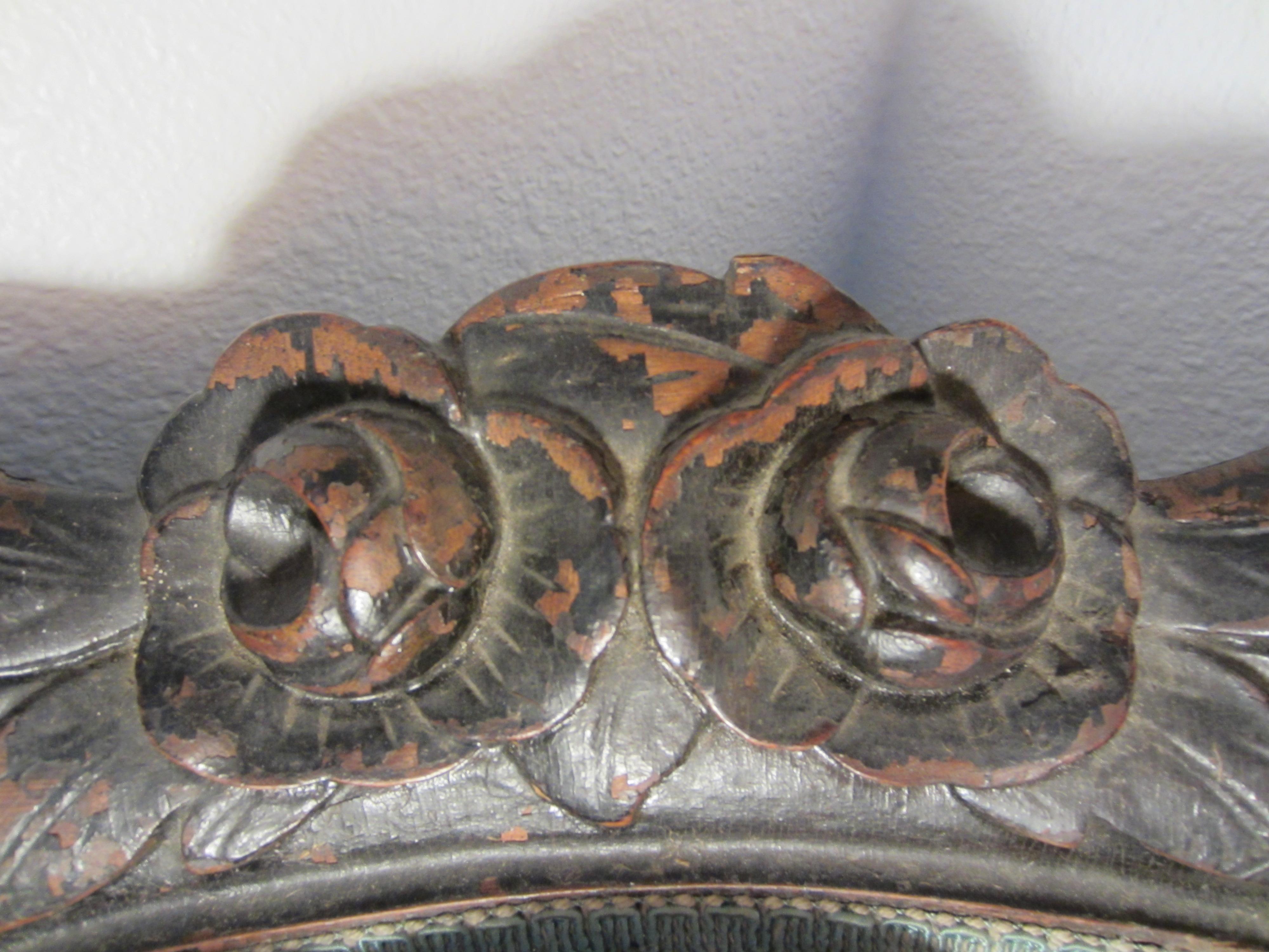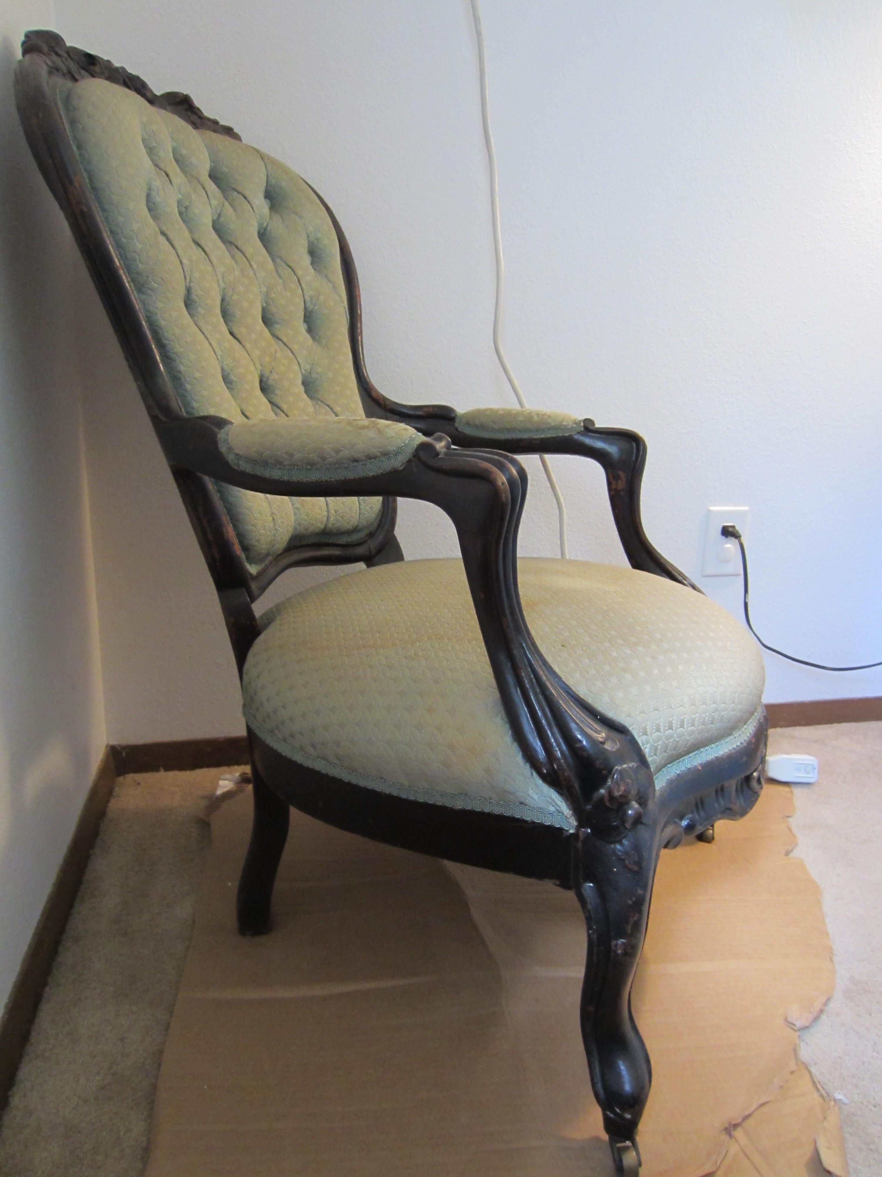 I purchased this settee and chair together in upstate New York. Although they are upholstered in the same fabric they are not a matching set. They were reupholstered in 1962 by Mardan Furniture according to the tag on the chair. They contain the original casters and the springs are all tied tightly and the seats are firm. There is wear and some staining on the fabric, some dings and chips in the wood, as well as, some flaking on the chair's finish. I would like to know the value of each of these peices and any information on the craftmanship and style. Thank you