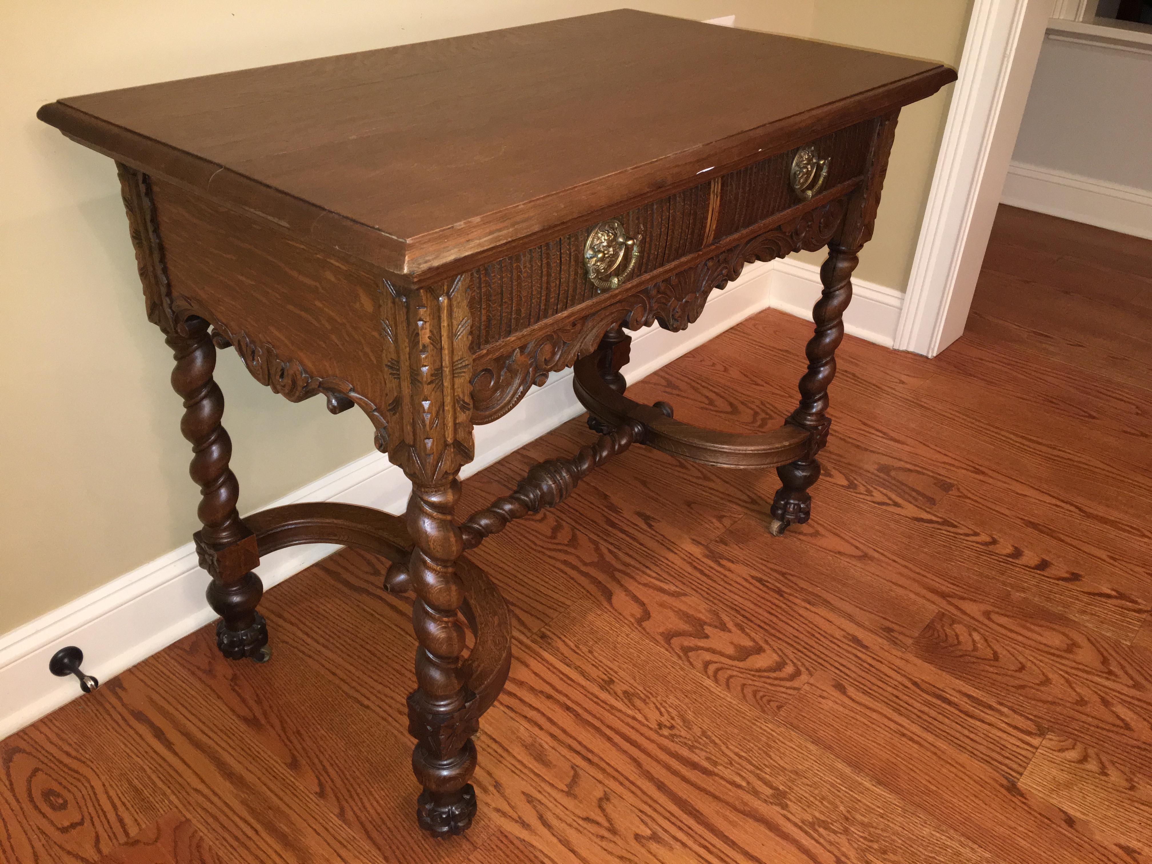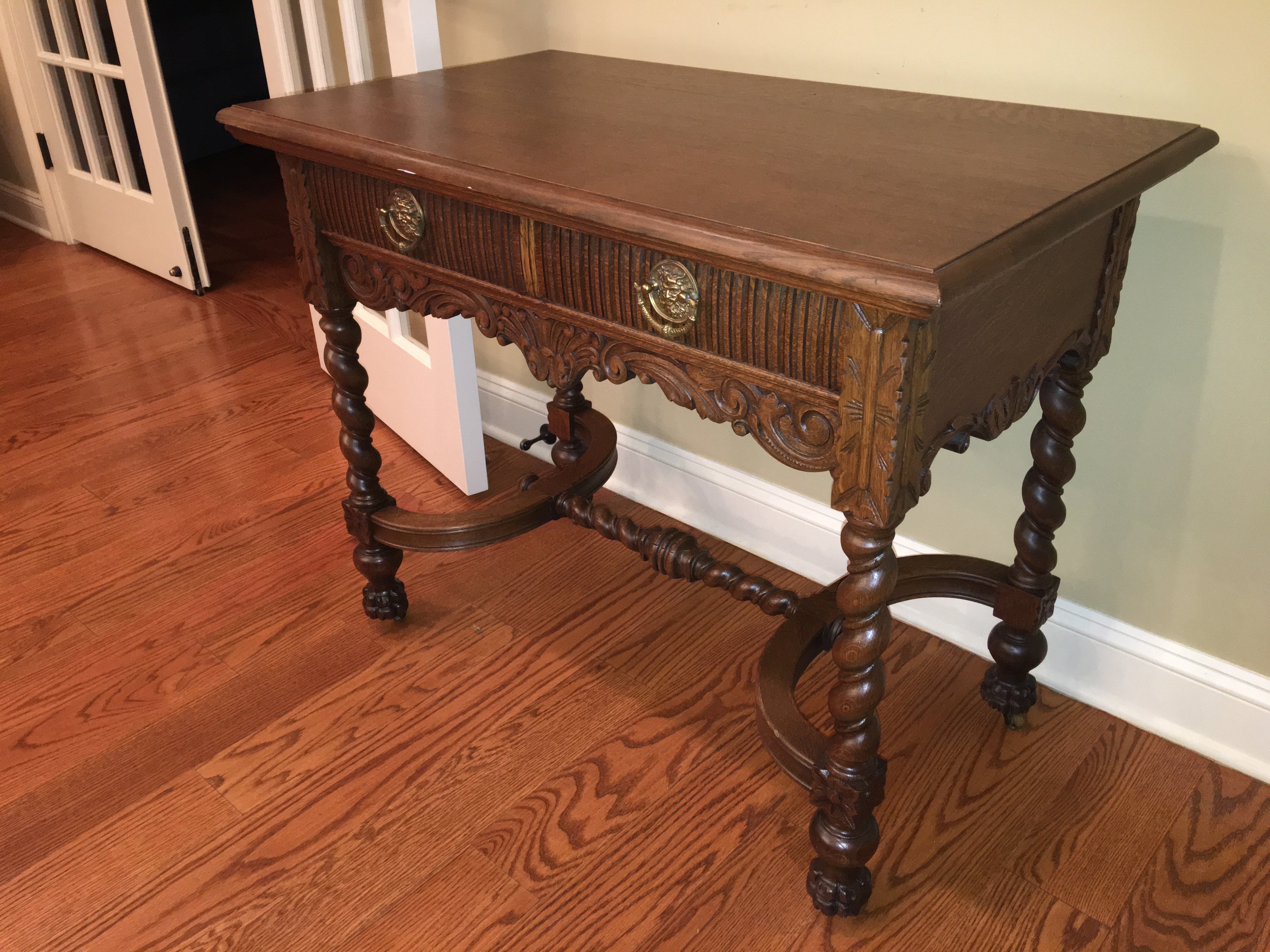 Based on your images of this piece, it is in a style often referred to as "Jacobean Revival". The style getting it's name from the fact it was loosely designed to resemble furniture made during the reign of James the 1st ( 1603-24), but uses design elements found on furniture made until the late 17th Century under the reigns of Charles I and Charles II as well. Jacobean Revival furniture has been in continuous production in both England and the USA since the last quarter of the 19th Century ( Circa 1875), Production for pieces like this seems to have peaked before World War two (1939). Today a good example might go for about $500.00.