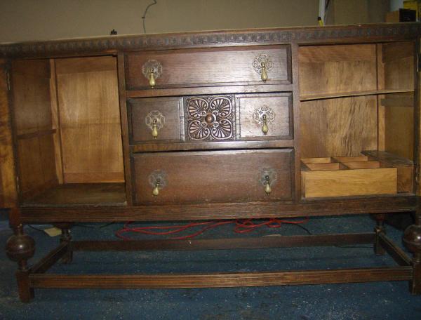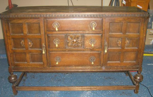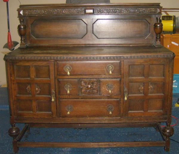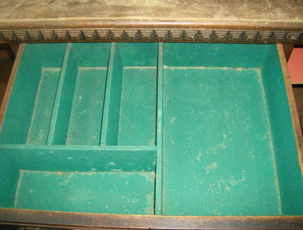 This piece is 2 pieces. The bottom and then the detachable hutch(?) It's rounded measurements are:61"wide, 21"depth, 60"high(w/hutch). The top drawer has green felt lining with compartments. The 2 doors have old style key holes. All of the drawers have dove-tailed joints on all corners. The drawer pulls are not drilled all the way through like modern knobs/drawer pulls. The only metal is on the knobs and the door hinges. There are NO markings or stamping anywhere-the only "marking" is at the back of one drawer, like a carving in small. says "xxxxxxxv", but I'm not sure that means anything. Any information on this piece would be greatly appreciated. Wood type, age, style,?? estimated worth?though not going to sell-fell in love with it on site. Also if you have any tips on refinishing the top? There are lots of marks from drinks on the top.This is my first real antique buy.