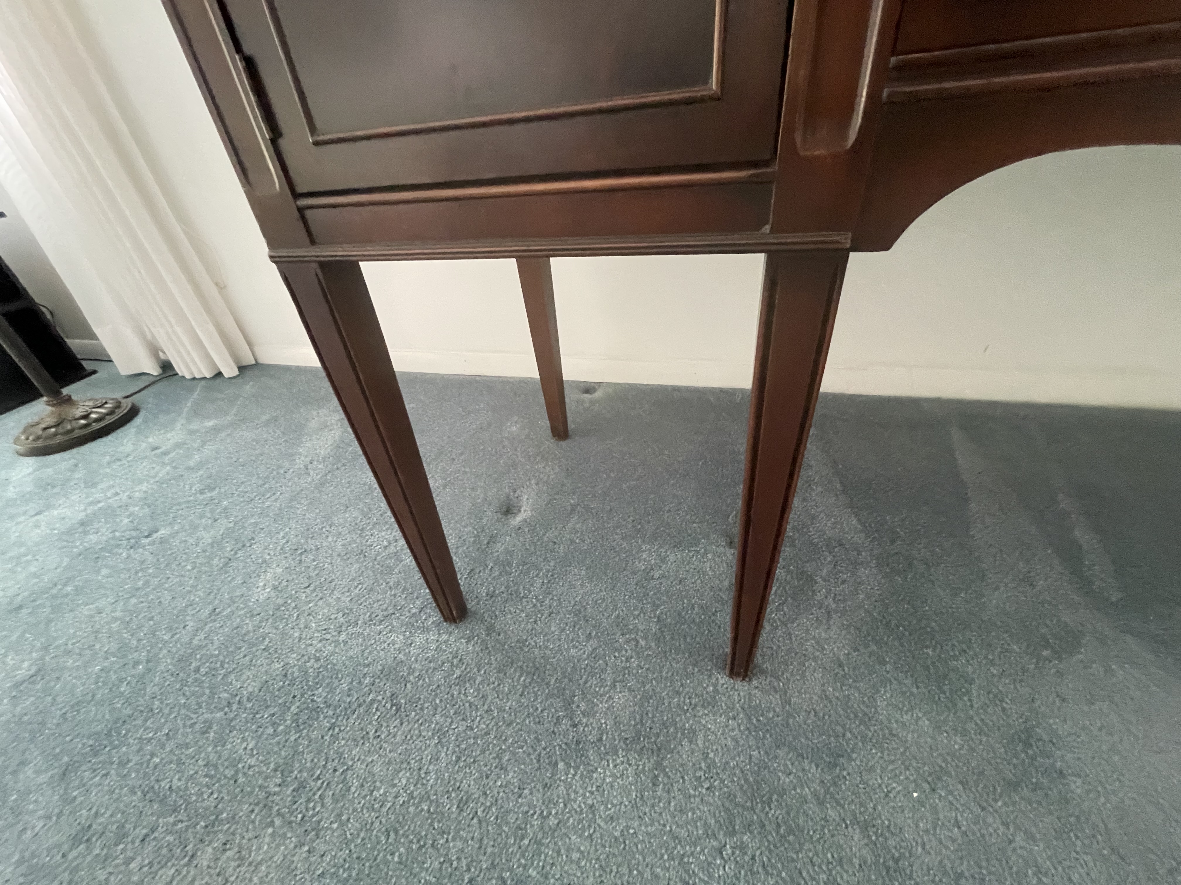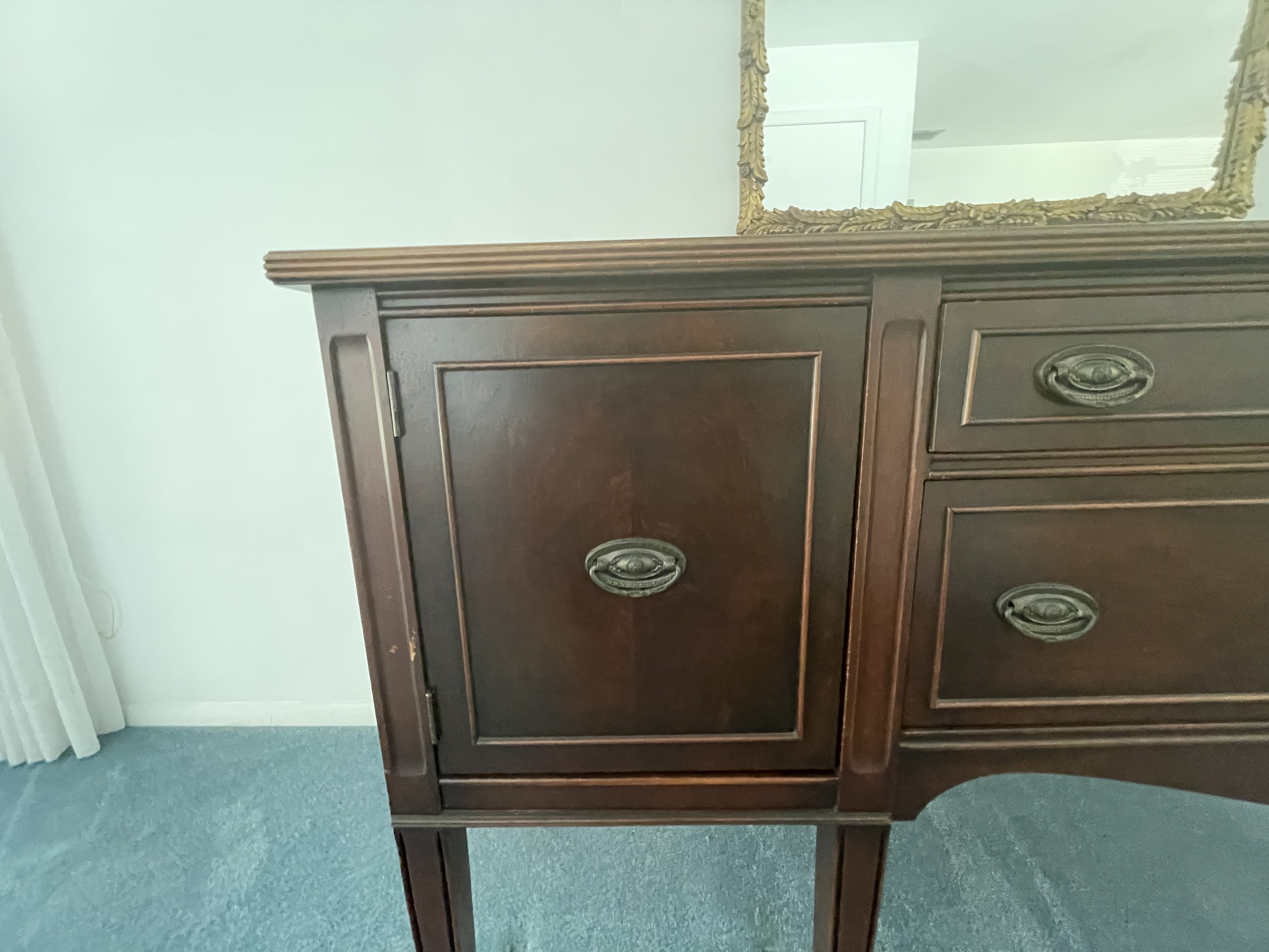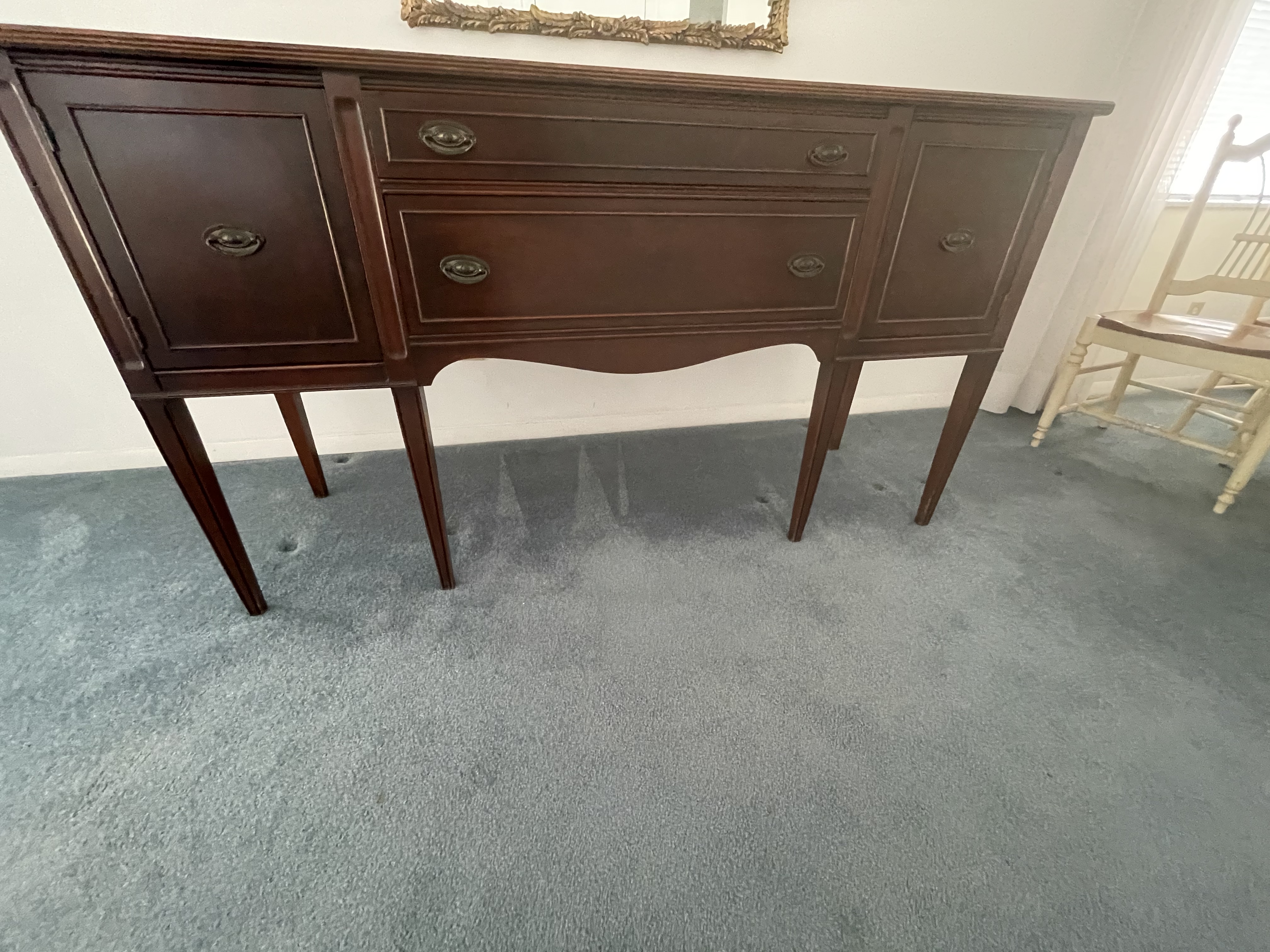 Sideboard buffet with tall straight legs and drawers w metal handles. Approx 5-6’ in length. Not heavy. I’d say it’s under 40lbs. No distinguishing marks except a three digit number on back which looks burnt on.