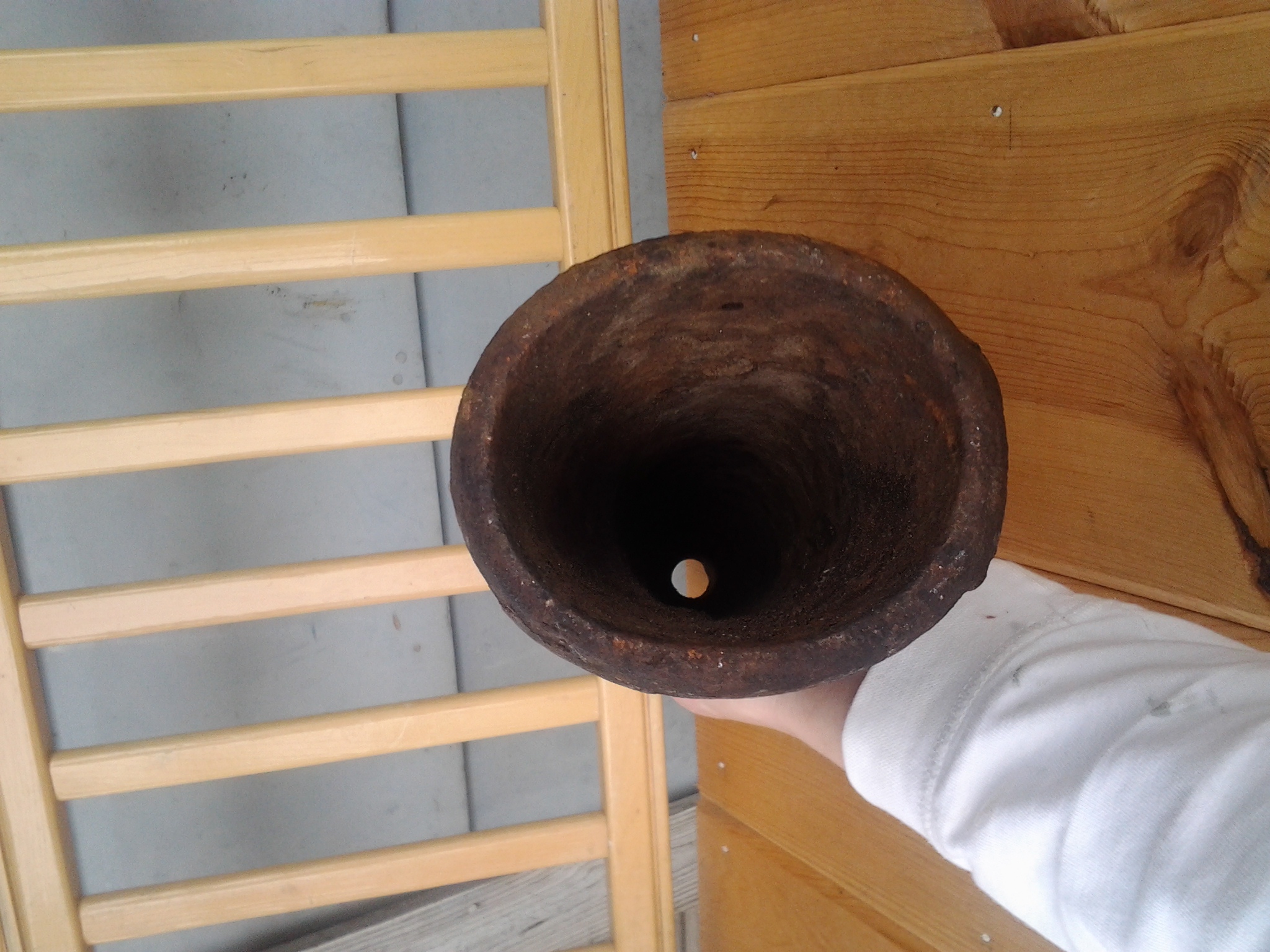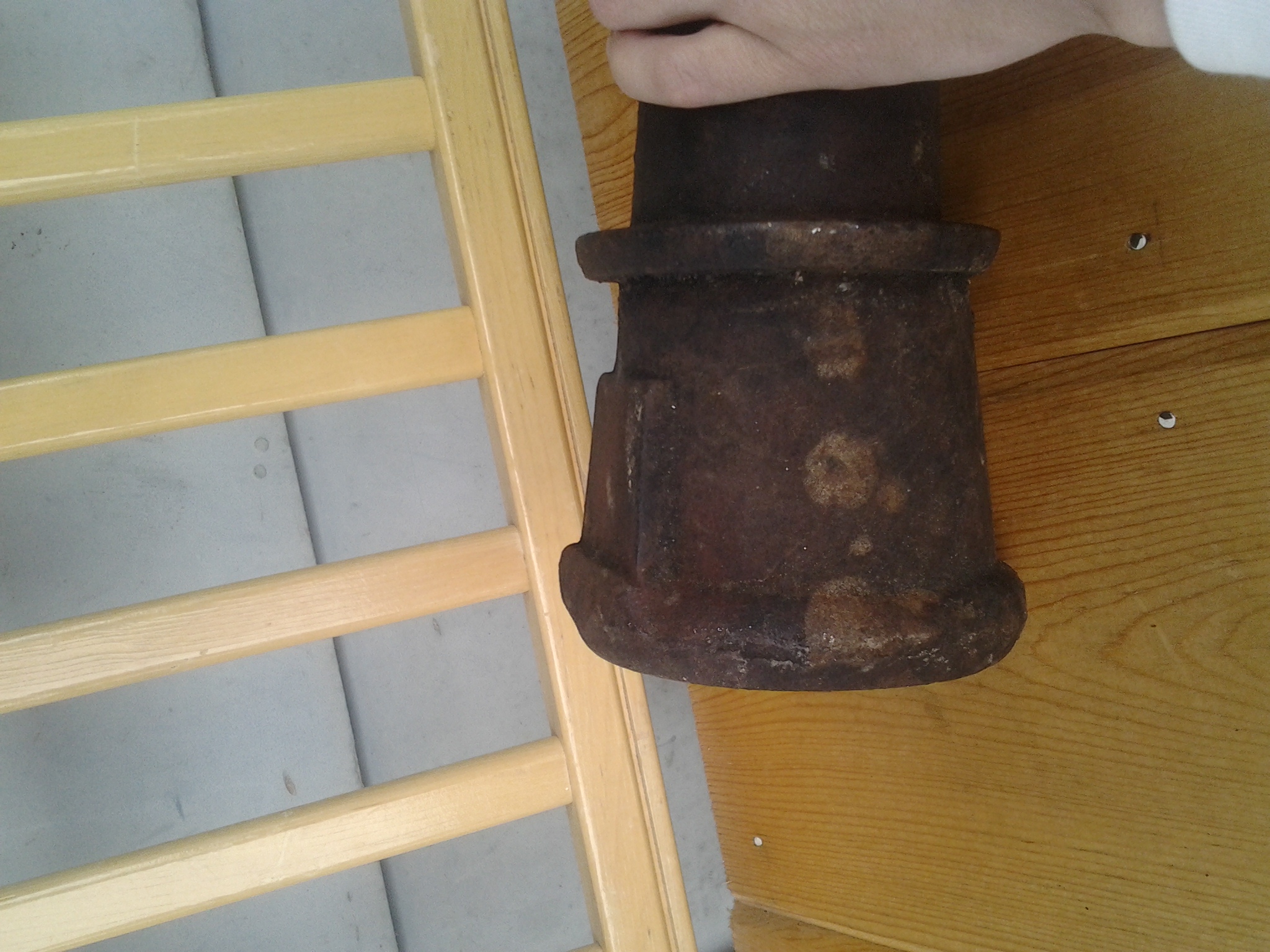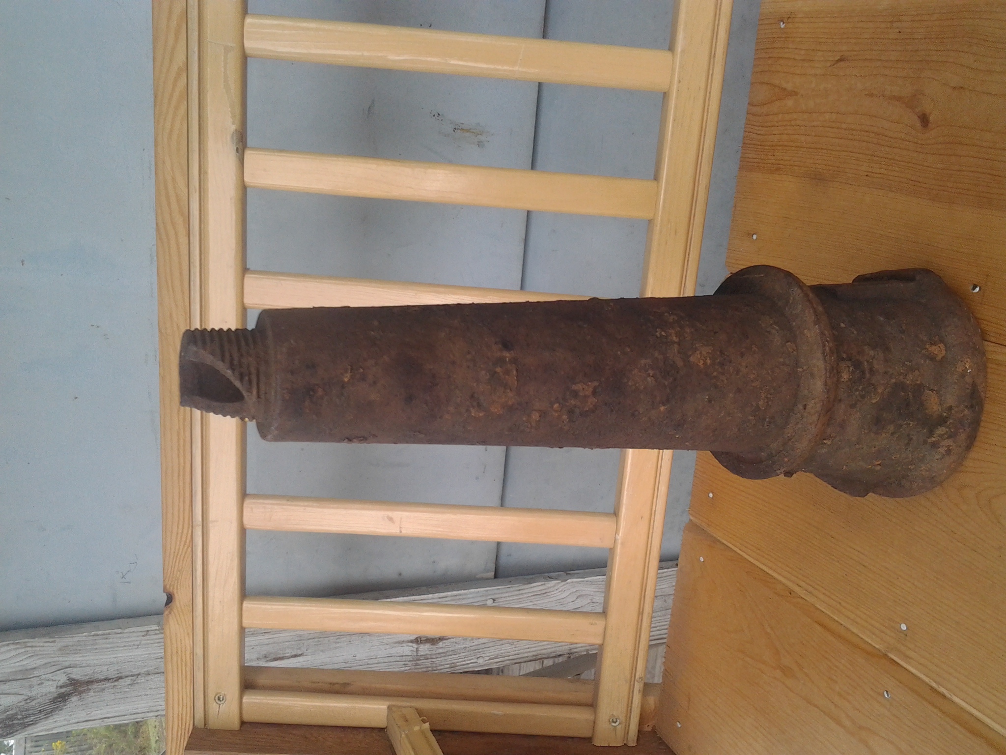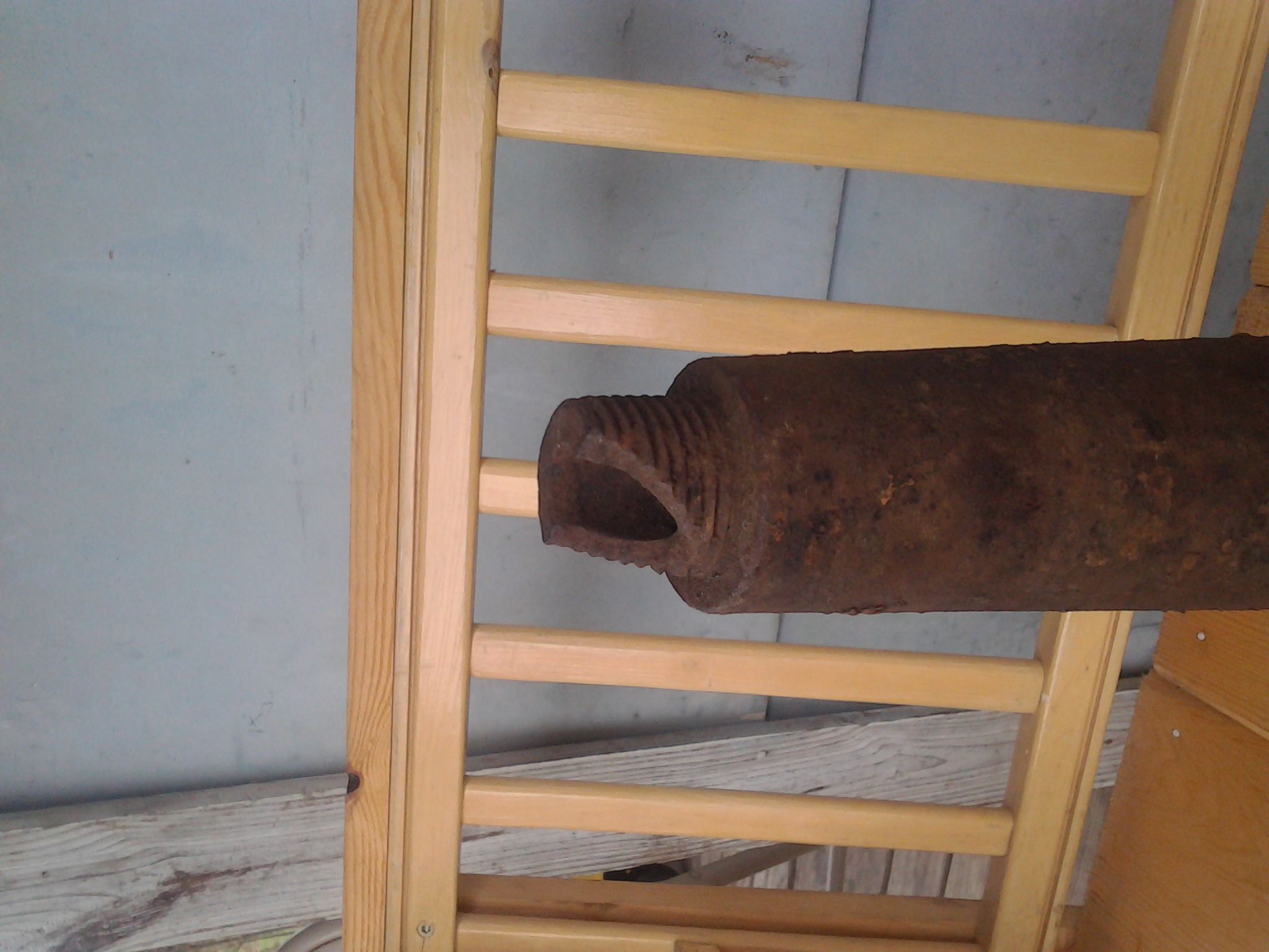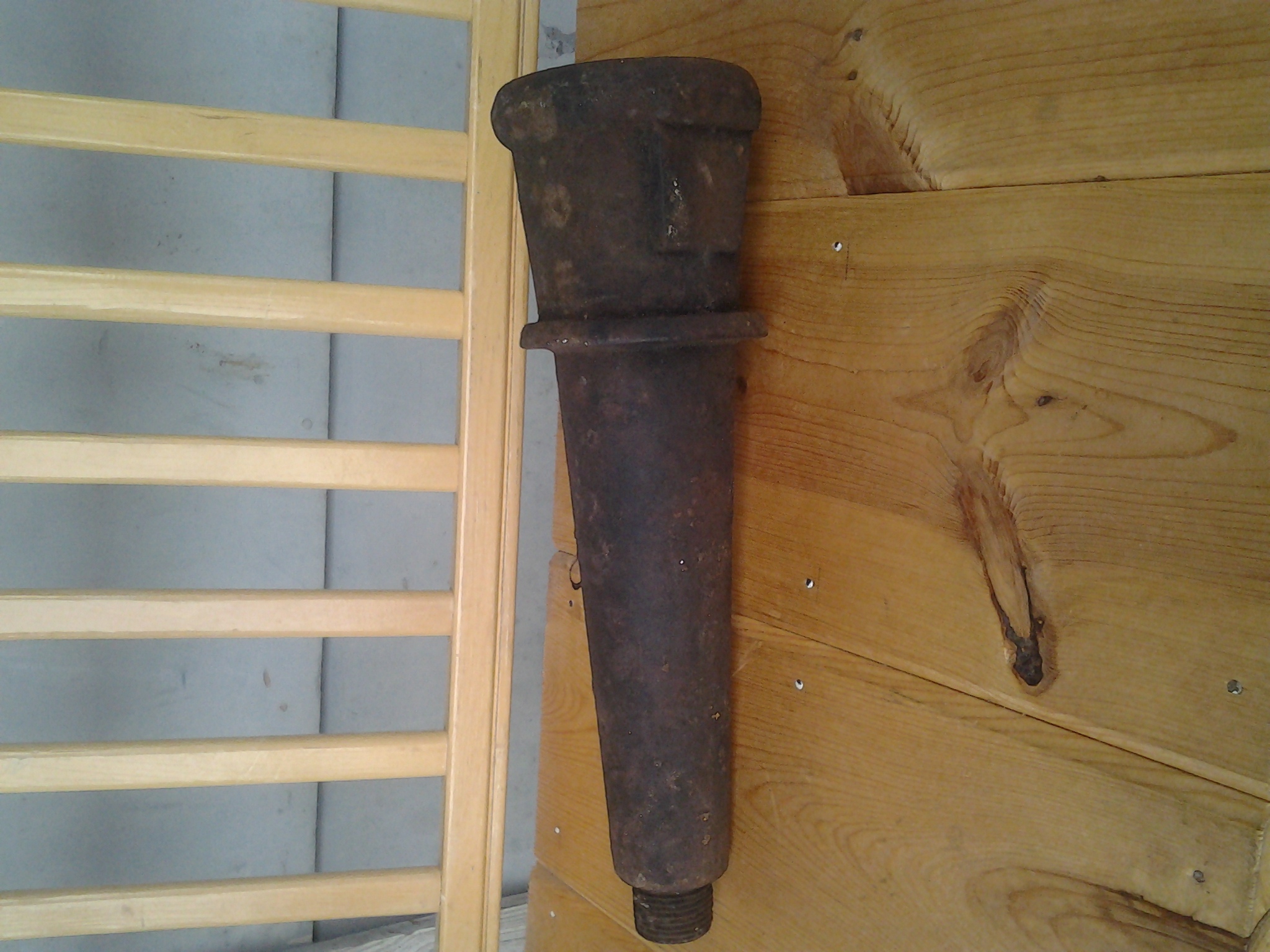 Is about foot and half long with oval shape opening on one end and threaded on other. Threaded end is notched on one edge